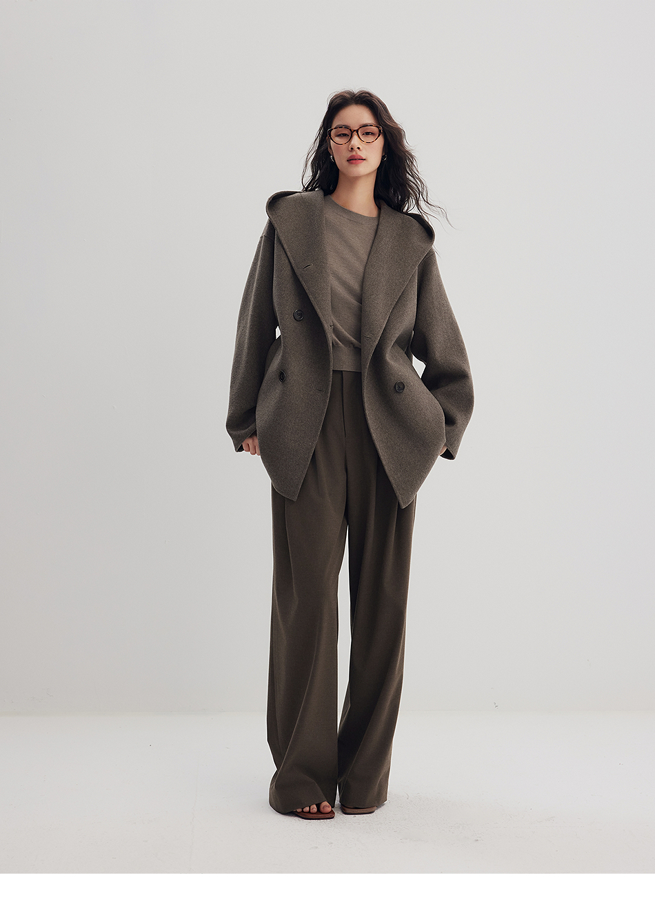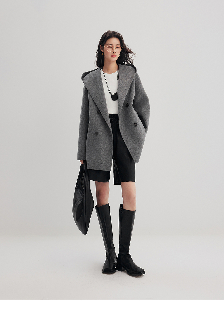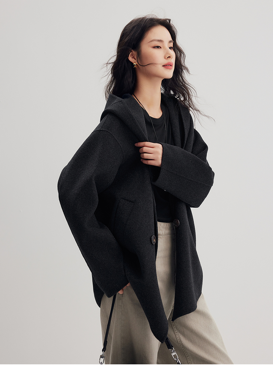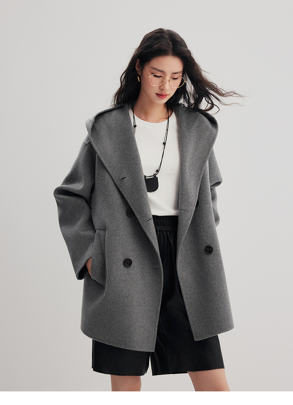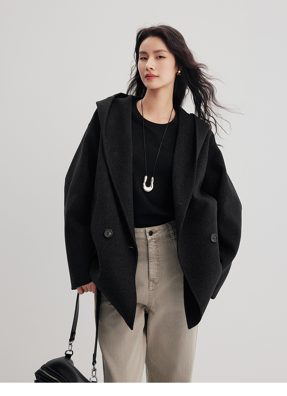 棉仓356666001-老钱松弛感兜帽双排扣一手长羊毛羊绒混纺毛呢外套