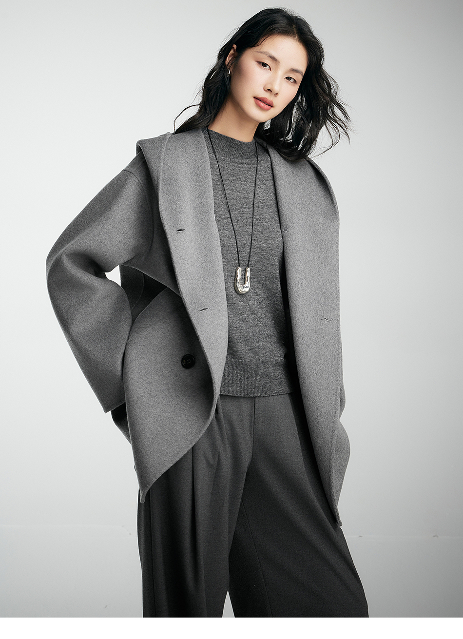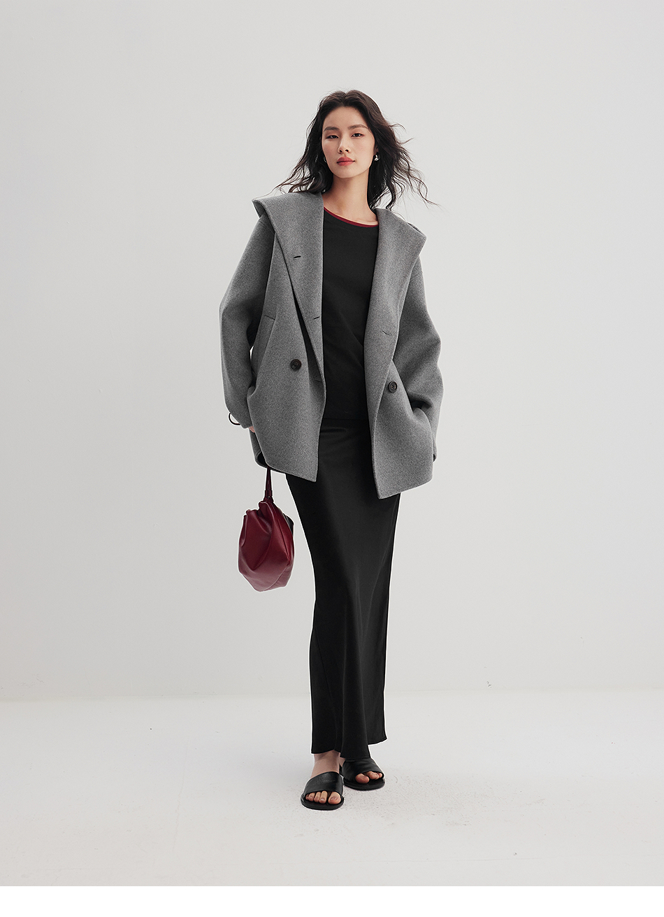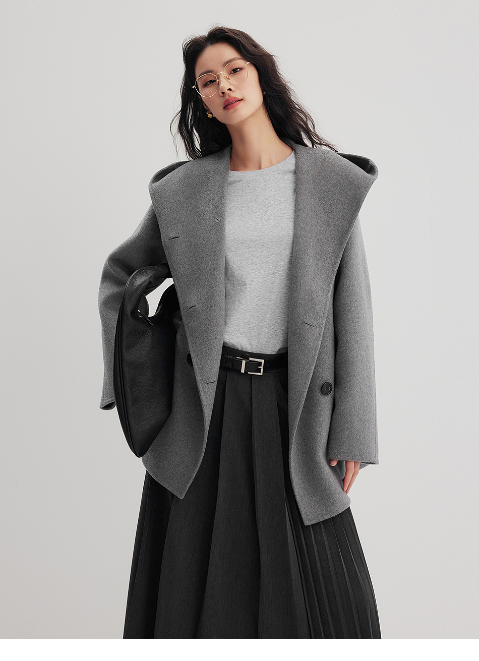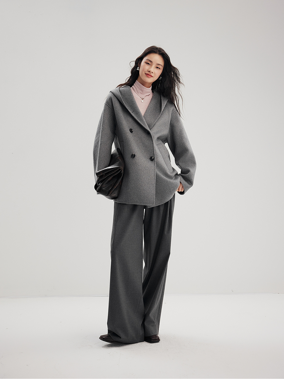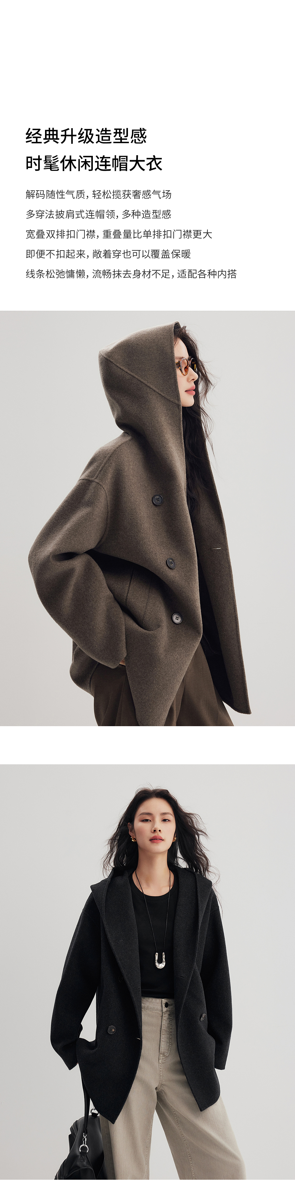 棉仓356666001-老钱松弛感兜帽双排扣一手长羊毛羊绒混纺毛呢外套