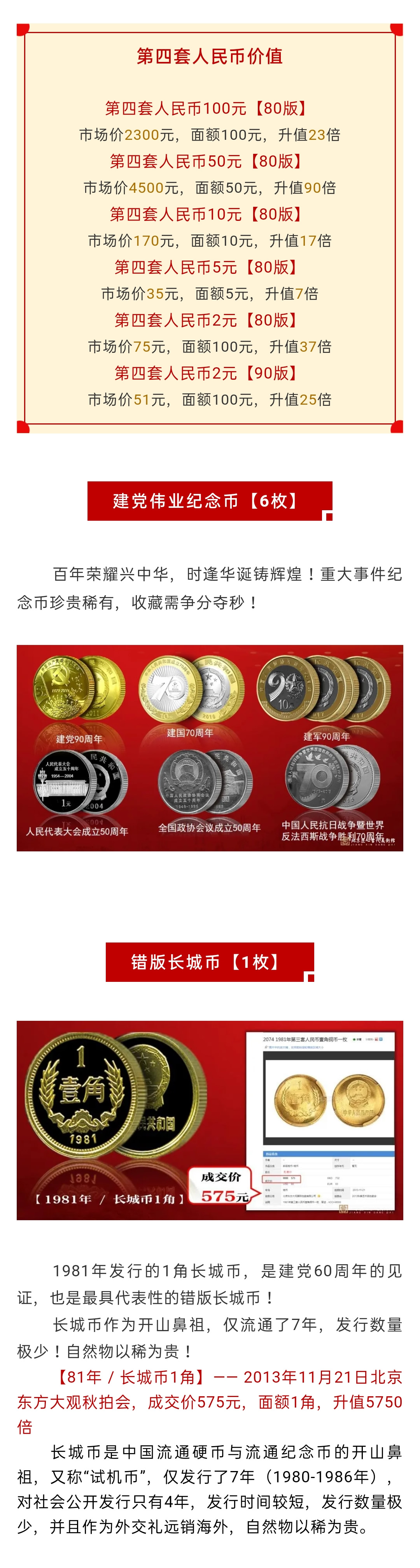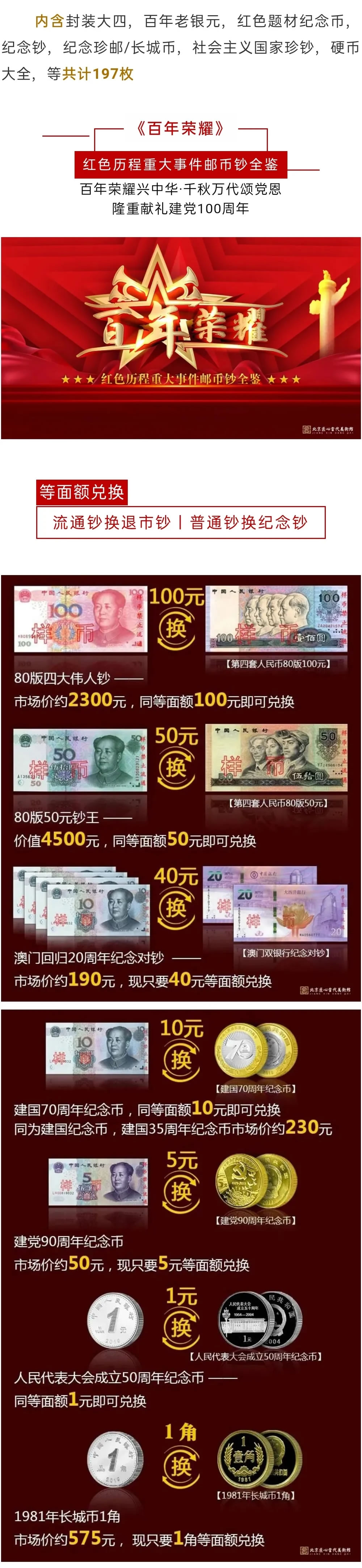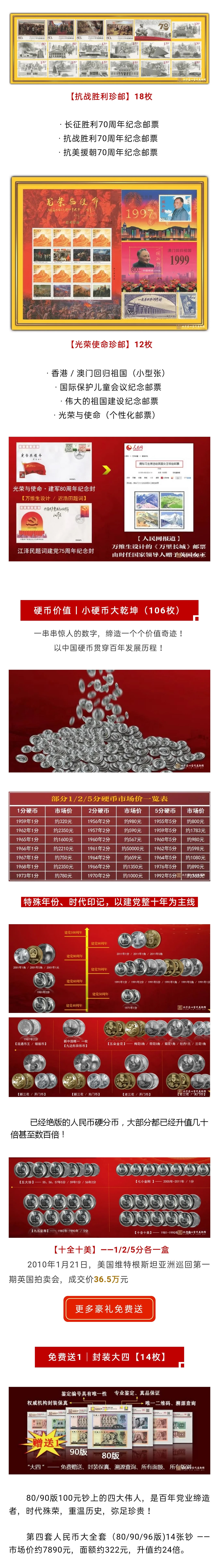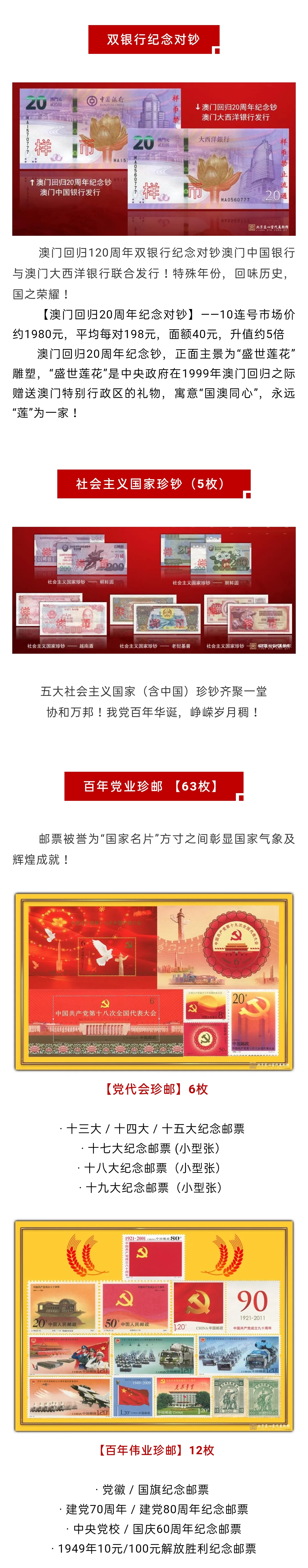 内含人民币退市钞、百年老银元、纪念钞、纪念币、长城币、经典硬币、社会主义珍钞、百年党业珍邮等八大品类,内容详实。