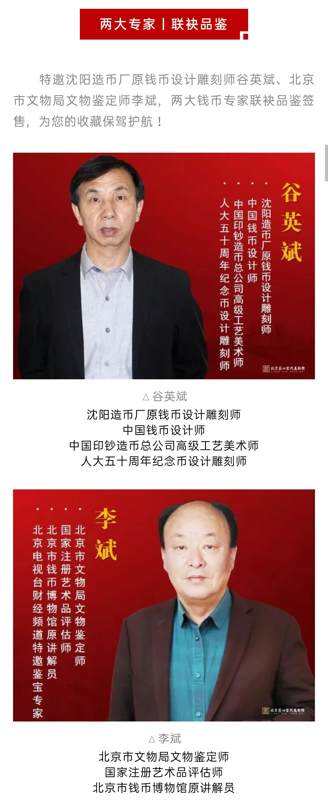 特邀沈阳造币厂原钱币设计雕刻师谷英斌、北京市文物局文物鉴定师李斌,两大钱币专家联袂品鉴签售,为您的收藏保架护航。