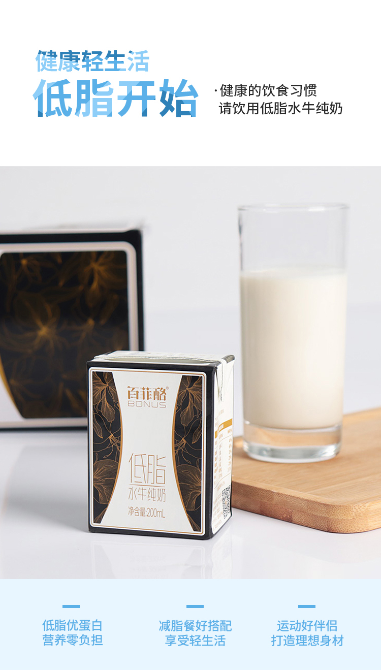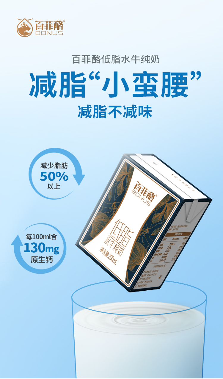 根据脂肪含量的不同,会将牛奶分为全脂牛奶、低脂牛奶、脱脂牛奶三种,低脂奶是指经过离心除去牛奶中大部分脂肪成分后的奶。通常来说,在脱脂的工艺过程中会减掉脂肪含量,同时也带走脂肪的香味,所以低脂奶脂肪是减少了,但口感也“打折”了。但是!百菲洛为减脂人群推出的低脂水牛奶,是被网友称为“低脂奶的天花板”的哦,脂肪含量减少50%以上,但口味还是非常浓郁!而且,百菲酪低脂奶还保留了130mg原生钙和3.8g蛋白质,营养不减!