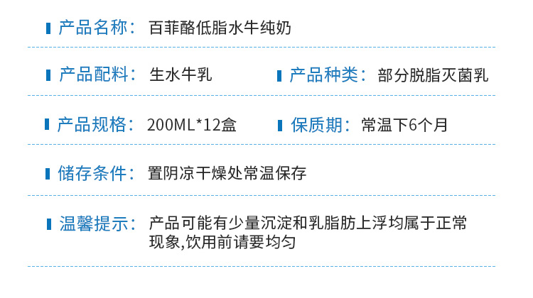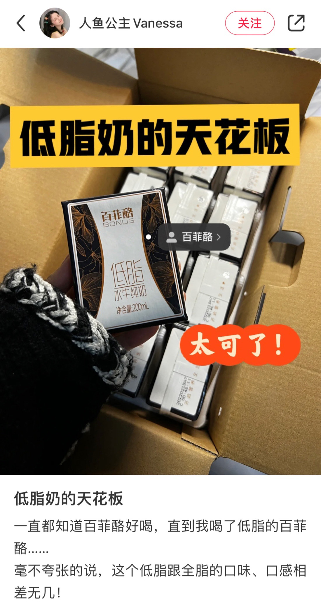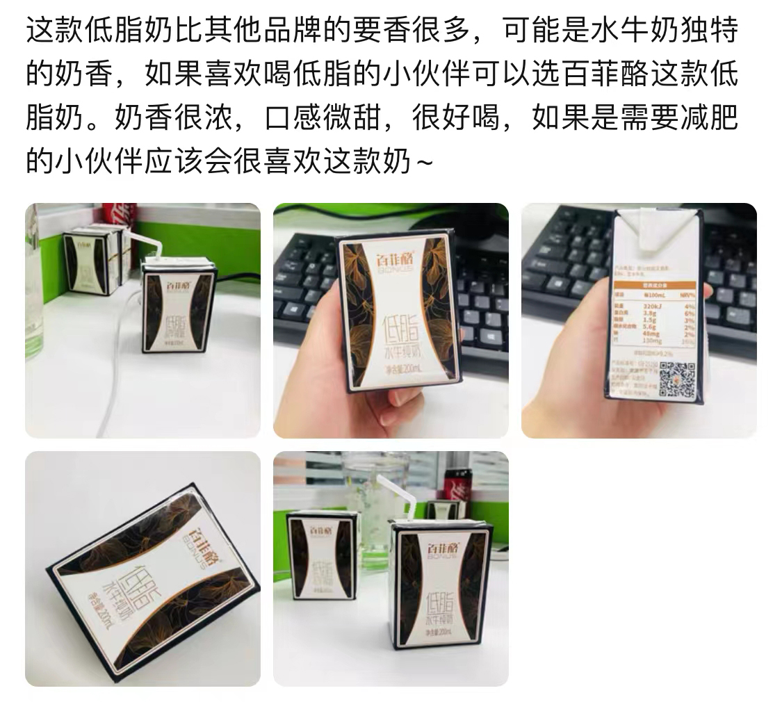 低脂奶在包装上就体现出了“小蛮腰”的特点,适合低脂饮食人群,像是在减脂期的减肥人群以及三高人群,相比其他品牌的低脂奶,百菲酪从口味上来说很接近自己家的全脂奶,所以不用担心不好喝!