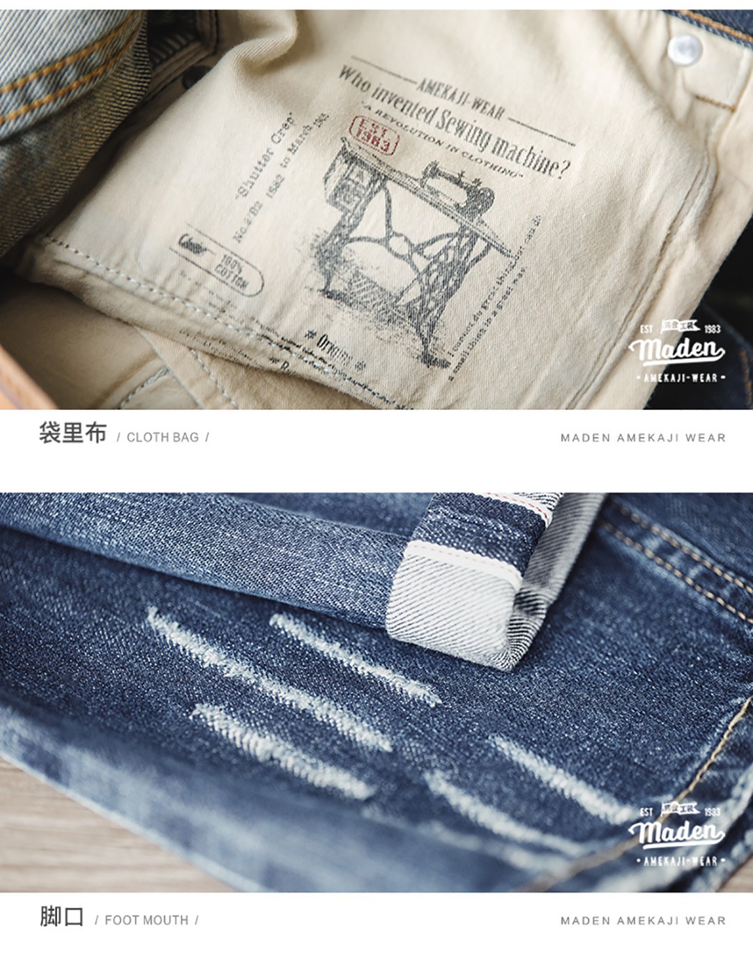 工装优选 美式休闲九分水洗赤耳牛仔裤阿美咔叽做旧破洞直筒裤男