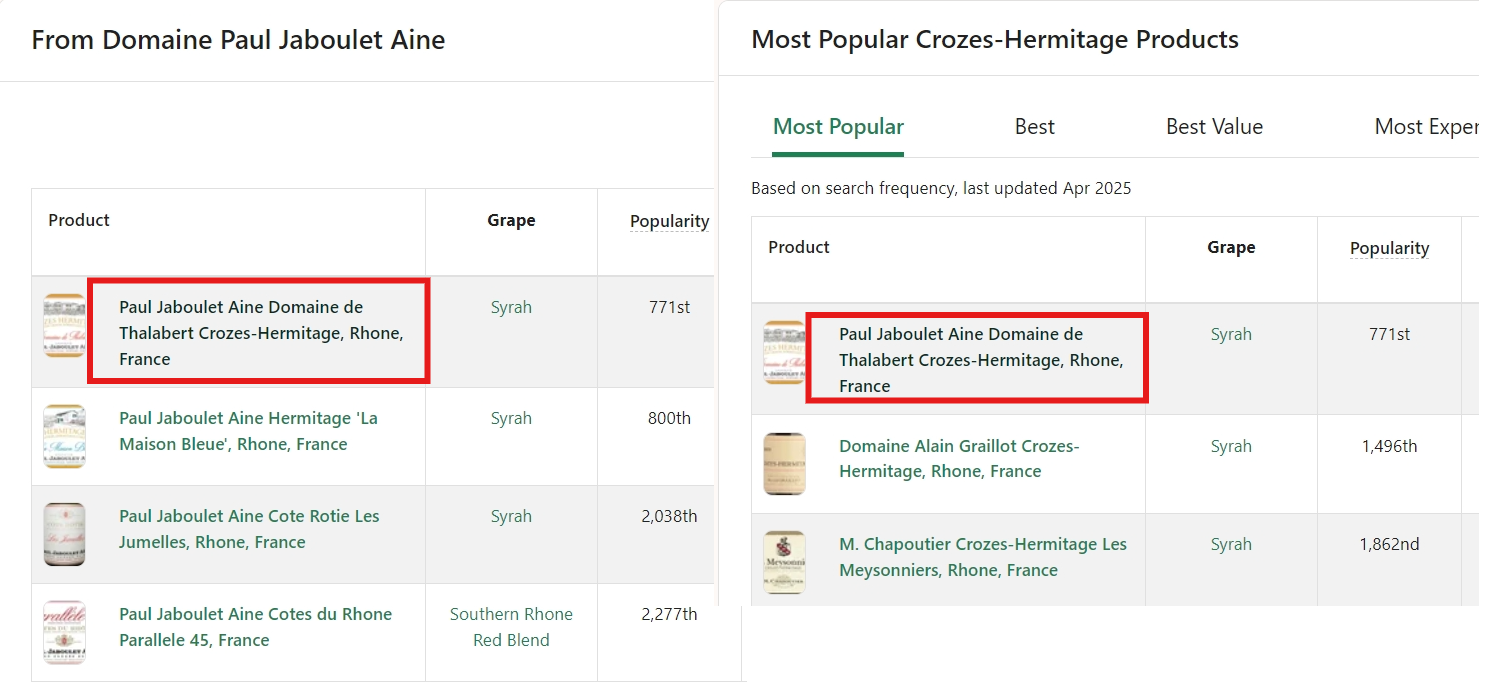 根据葡萄酒网站 wine-searcher数据显示,嘉伯乐酒庄德拉贝单一园旗舰干红是酒庄格外受欢迎的酒款,也是克罗兹-埃米塔日产区热门酒款,行业搜索量前 1000,市场非常喜爱。