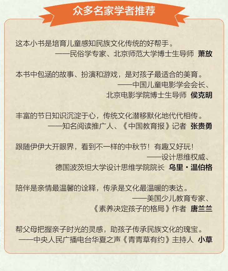 德国波茨坦大学设计思维学院院长 温伯格教授则认为「如何让孩子对成人世界打开眼界,值得我们仔细研究。这本《伊伊,中秋节快乐!》跟着伊伊了解中秋节,有趣又好玩,引起我这个德国老头对中国文化浓厚的兴趣,书籍让孩子的心和眼随着阅读而更加愉快」