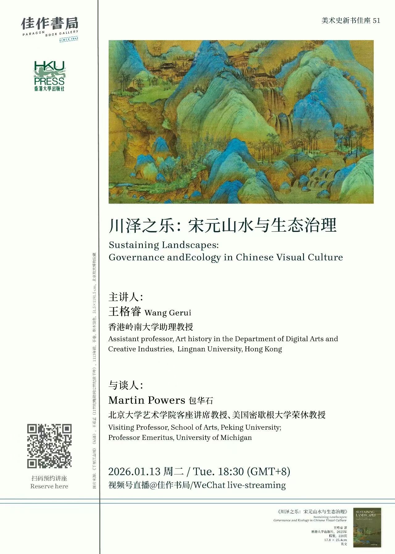佳作书局特别邀请到作者王格睿进行线上讲座,与谈人是包华石教授,围绕本书,探讨宋、金、元时期中国山水图像兴起过程中所蕴含的生态思想,追溯其与基础设施治理、自然资源管理和地理空间知识的交汇。