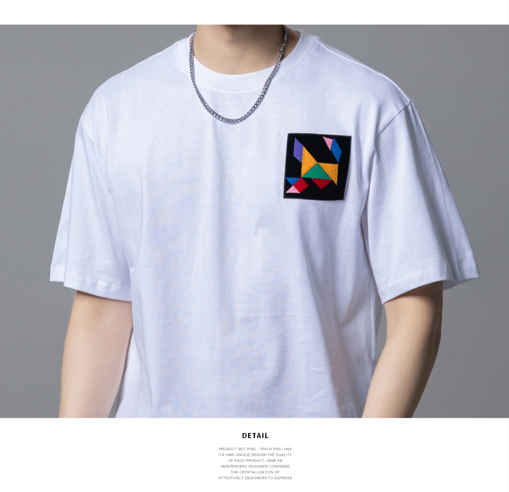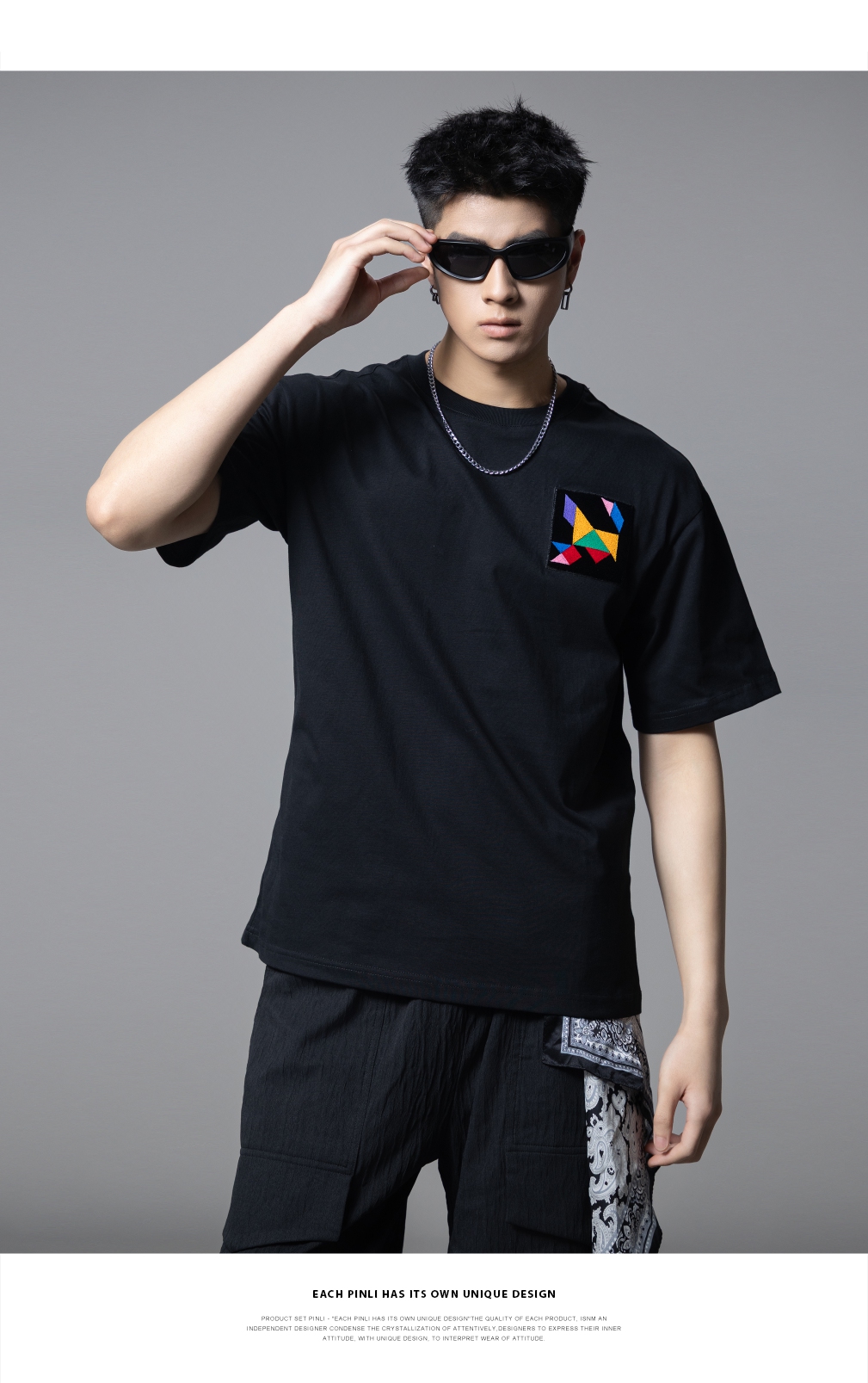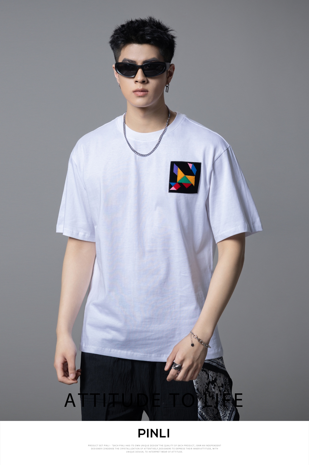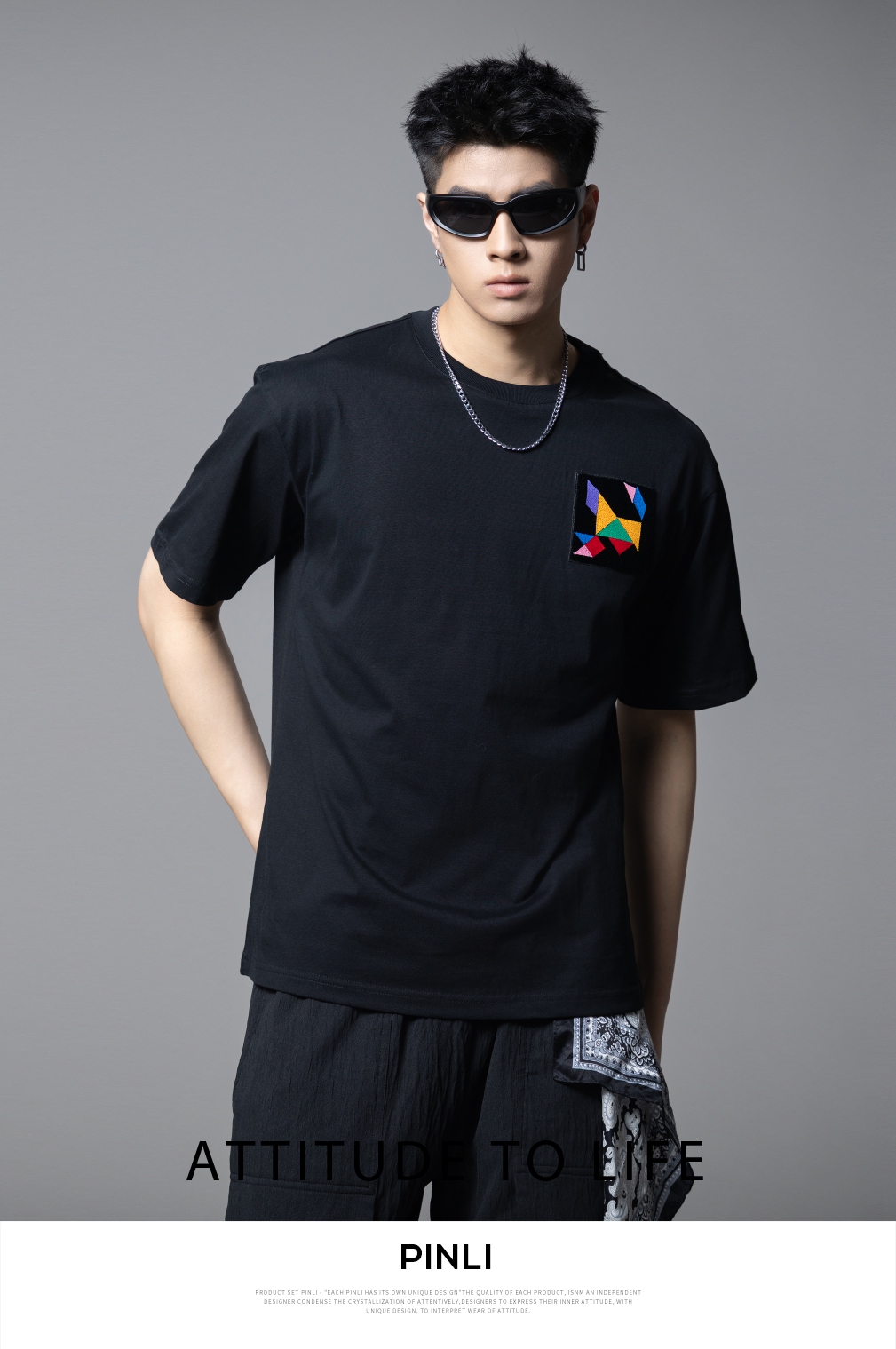 PINLI品立2025夏季新款男士贴布绣花落肩圆领短袖T恤BG252111046