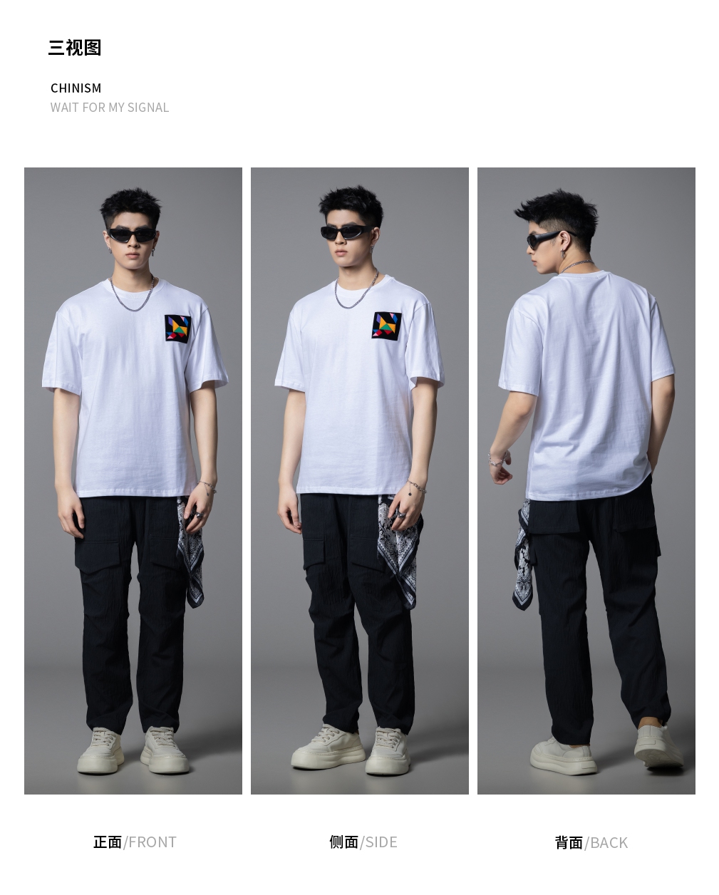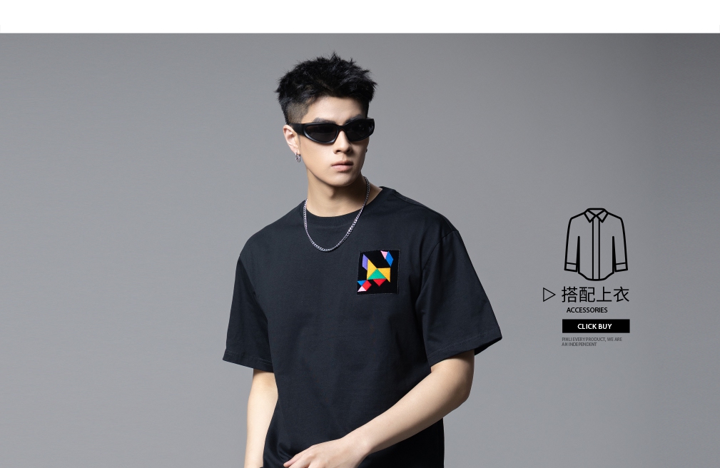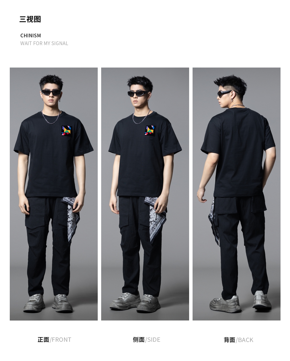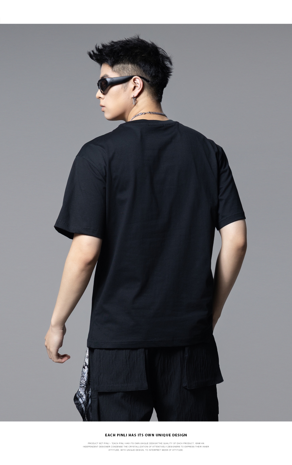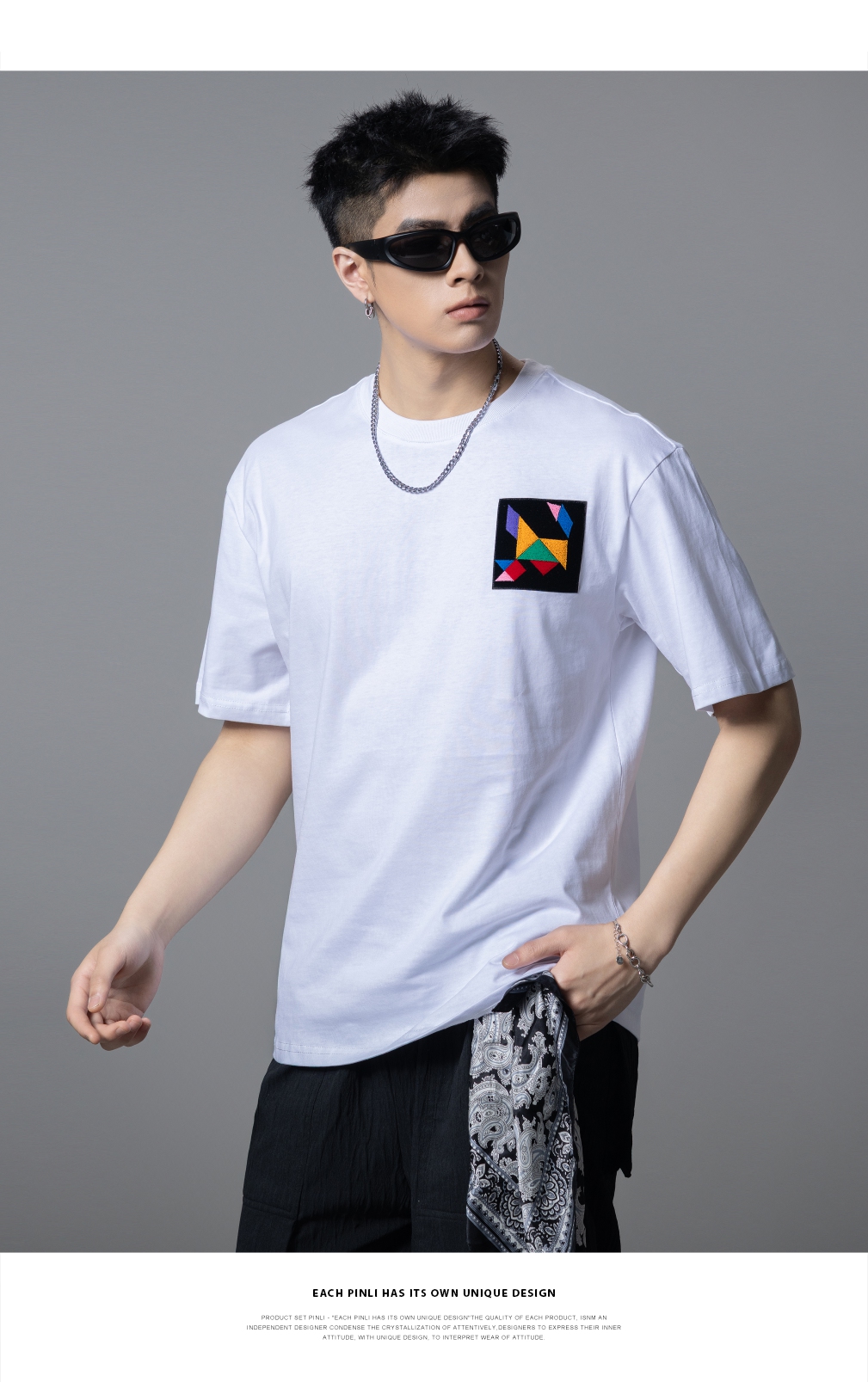PINLI品立2025夏季新款男士贴布绣花落肩圆领短袖T恤BG252111046