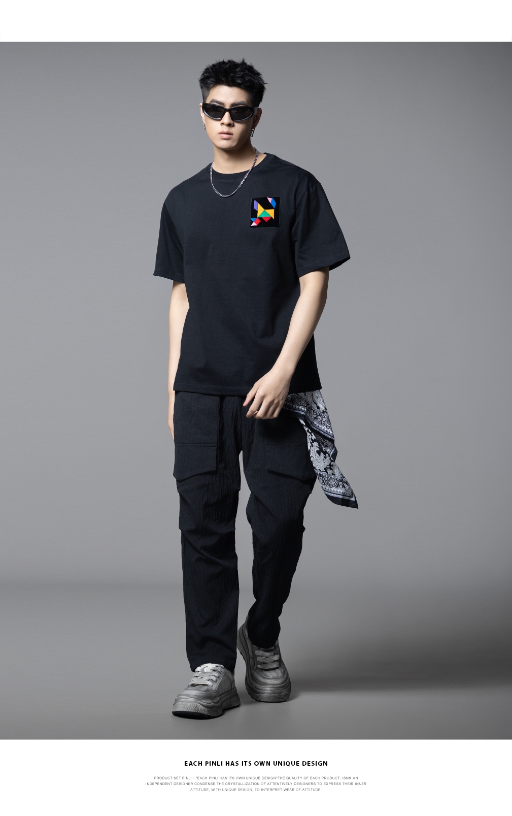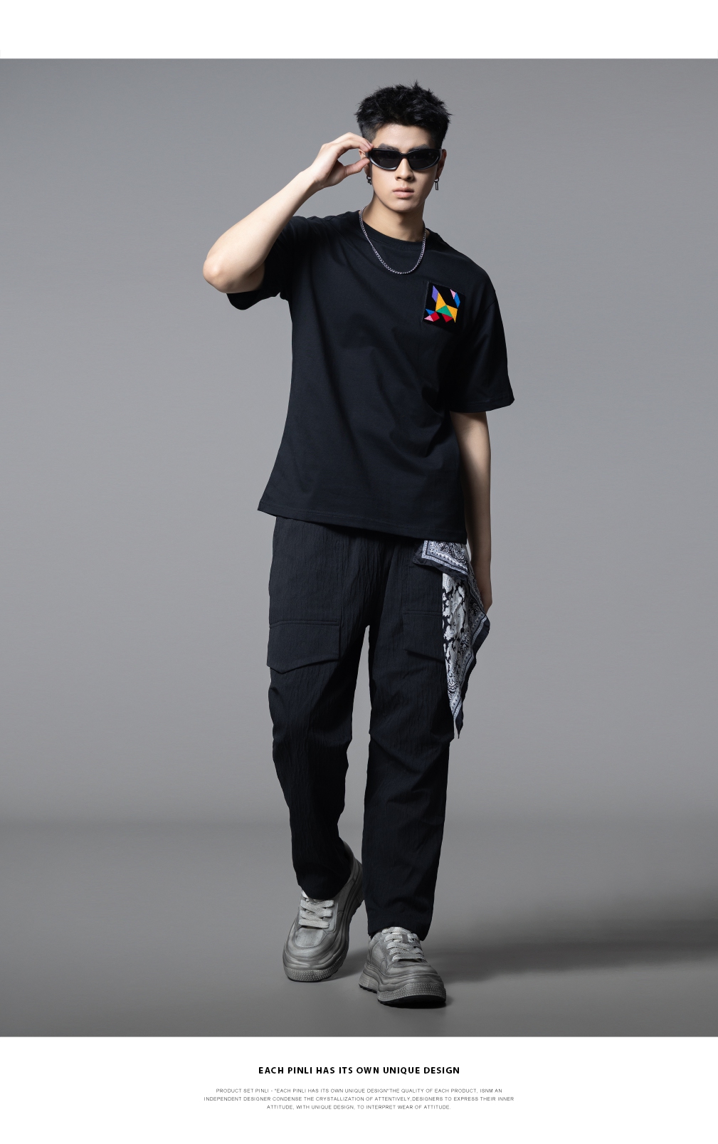 PINLI品立夏季新款潮牌褶皱工装裤男士黑色宽松直筒休闲长裤B252117076