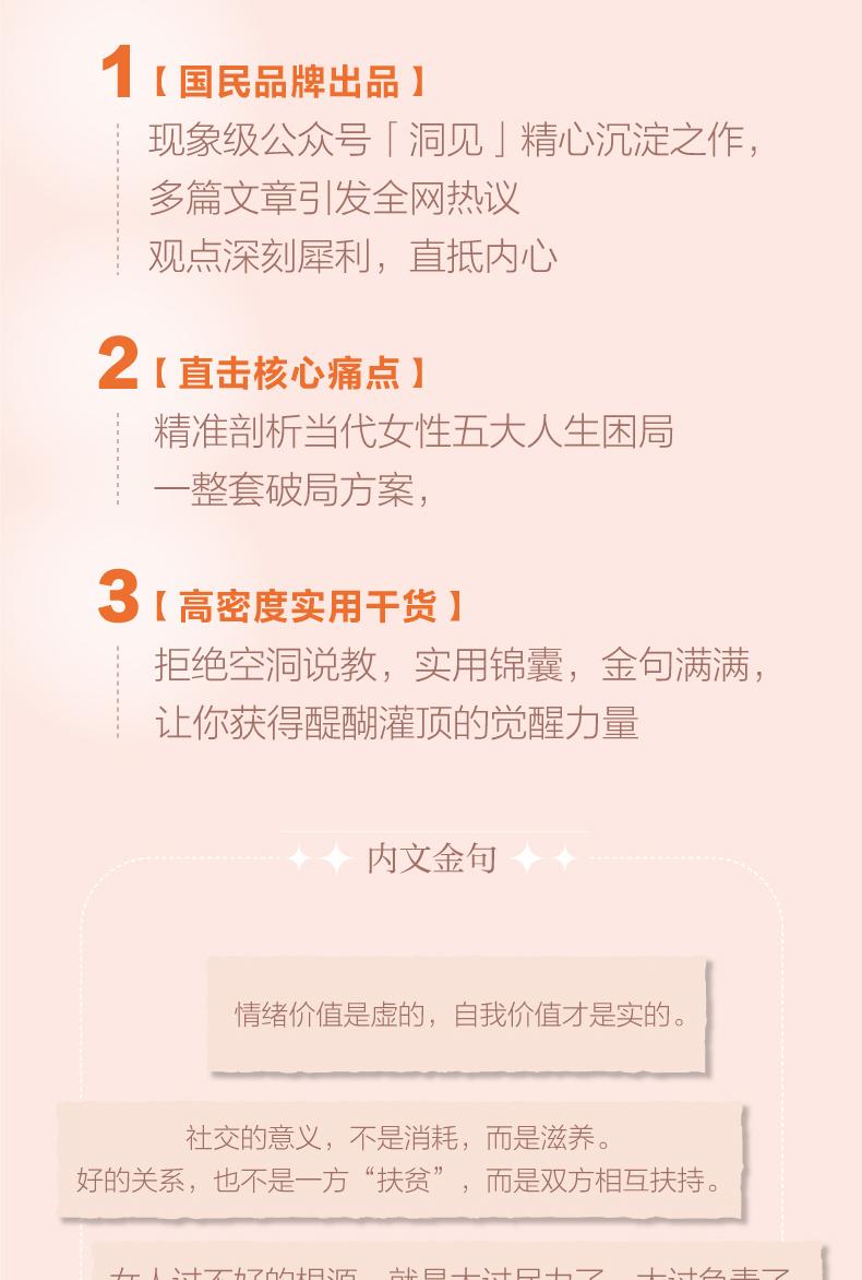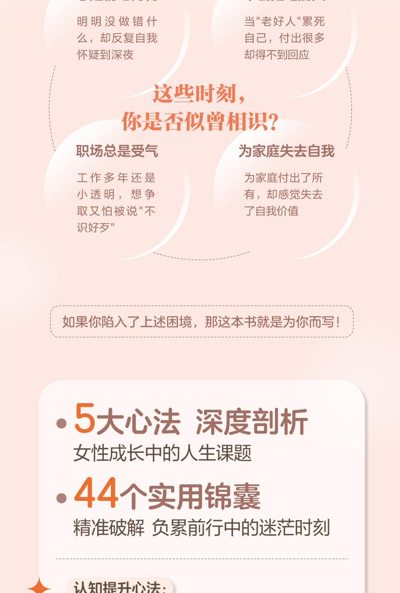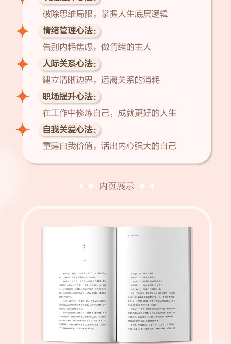 在这个讲求“情绪稳定”“*人设”的时代,太多女性陷入内耗、取悦他人、盲目比较的疲惫人生。你是否也常常感到压抑、焦虑、敏感、自我怀疑? 本书从“认知、情绪、人际、职场、自我”五大维度,深度剖析女性在成长中*容易忽视的底层逻辑与思维误区。作者以真实故事为引,辅以心理学洞察,带你看清内耗的根源,学会转念的智慧,练*精神不受力的力量,找到独属于女性的底气与自由。 这是一本写给当代女性的“觉醒手册”,它不讲道理,却字字戳心;它不空谈鸡汤,却句句有解。愿你在翻开本书的同时,也打开了另一种可能的人生——不再为别人的期待而活,而是为真正的自己而活。