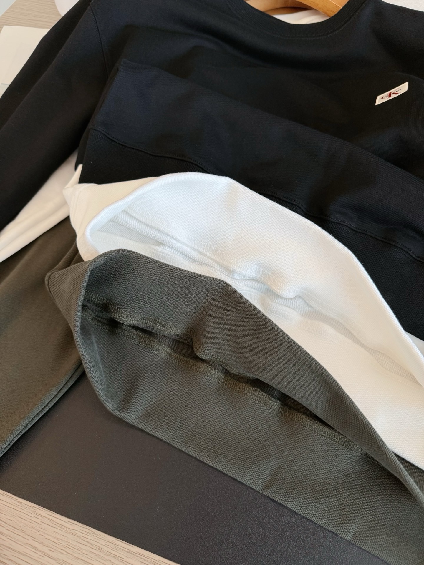布绣圆领针织T衣!纯y⚠️面料我对比过,是一模一样的500gsm重磅精梳全棉毛圈➕500gsm棉弹罗纹,单件净重800g起跳,大码1000g+超重磅!环保活性染;️深色撞白固色牢;️这个克重真的没有敌手!而且它并不只是厚或重那么简单,是真正的高克重纱线带来的高级感,悬垂感、挺阔度都非常强,平时很难想象一件卫衣穿出那种有型板正的高级感‼️这里的板正不是指它多么硬挺,而是说那种精致不糙的熨帖,很显好,就是柜子几千块那个味