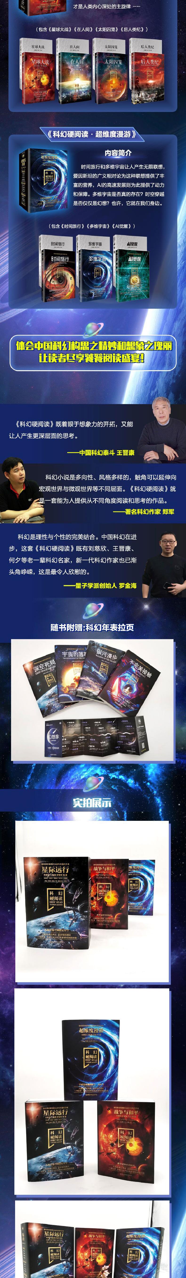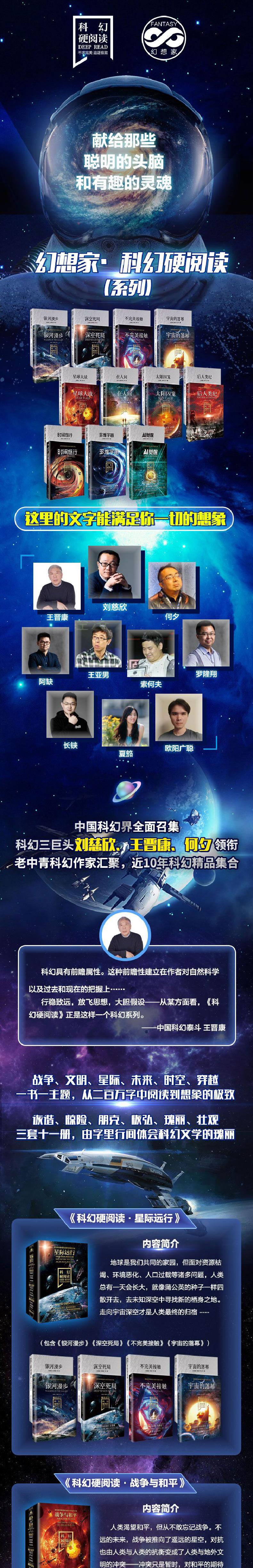 《科幻硬阅读》是中国科幻老、中、青三代名家典作品的集中展现,代表着中国科幻目前的整体水平。作品包括刘慈欣、王晋康、何夕、罗隆翔、阿缺、王亚南、索何夫、长铗、夏笳、欧阳广聪、喀拉昆仑、也飞、野火、焦策、五月羽毛,异议等三十多位科幻作者的名篇佳构。该系列共推出三套总计11部作品。分别为:《星际远行》-星际移民卷4部,《战争与和平》——未来战争卷4部,《超维度漫游》-时空与纬度卷3部。每册图书都有一个核心主题,收录进10年来中国科幻精华作品。代领读者体会中国科幻构思之精妙和想象之瑰丽。