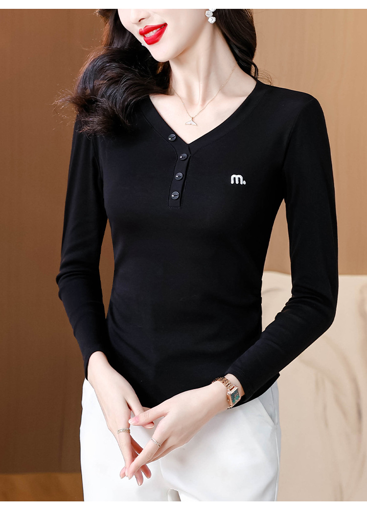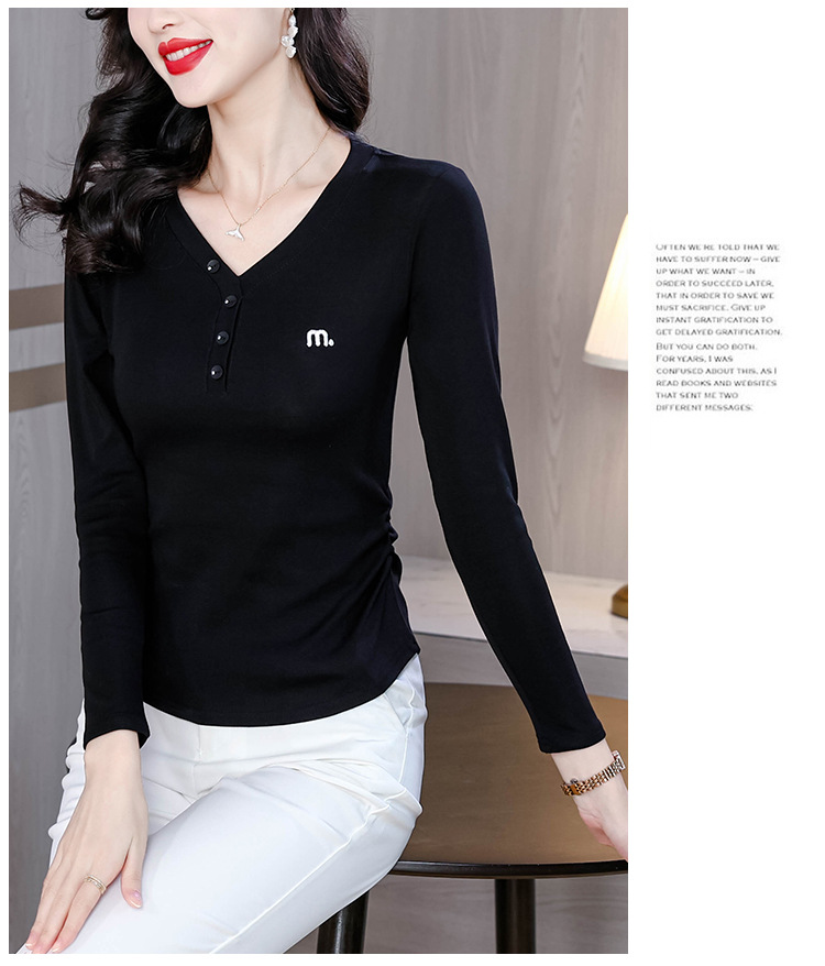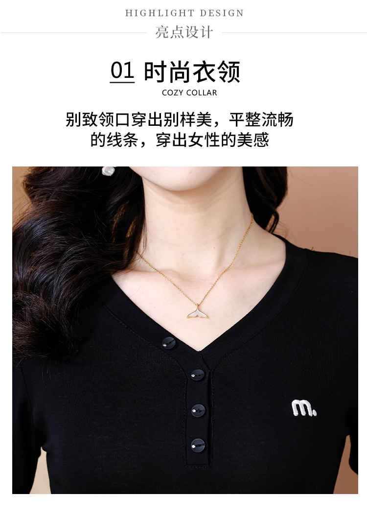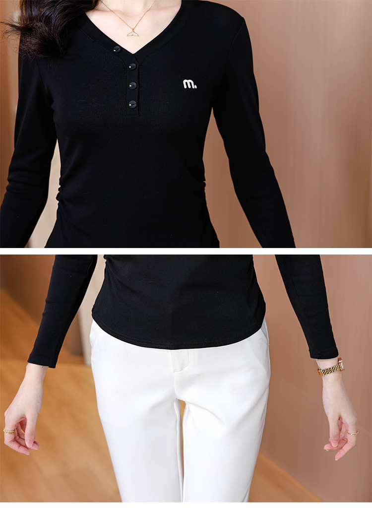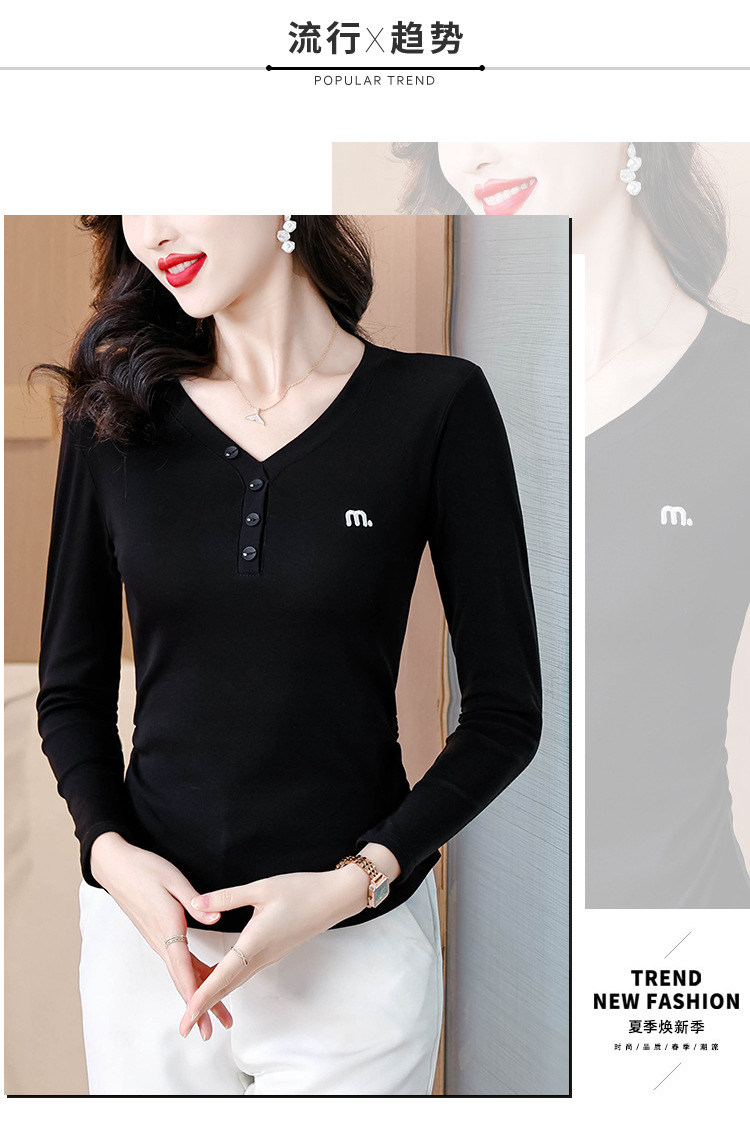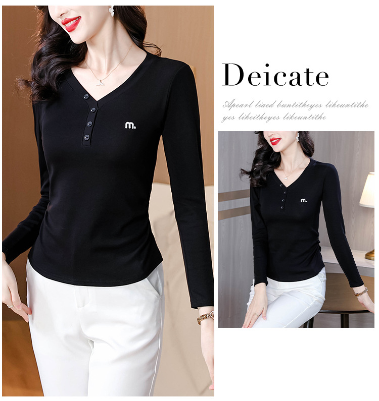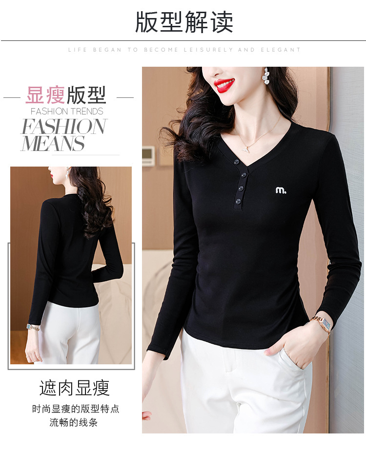 KQL 355H8105纯色V领刺绣长袖T恤时尚修身显瘦上衣