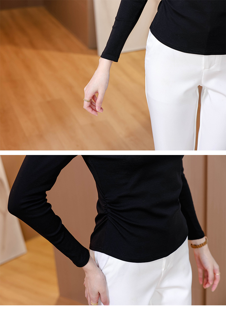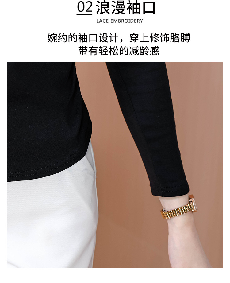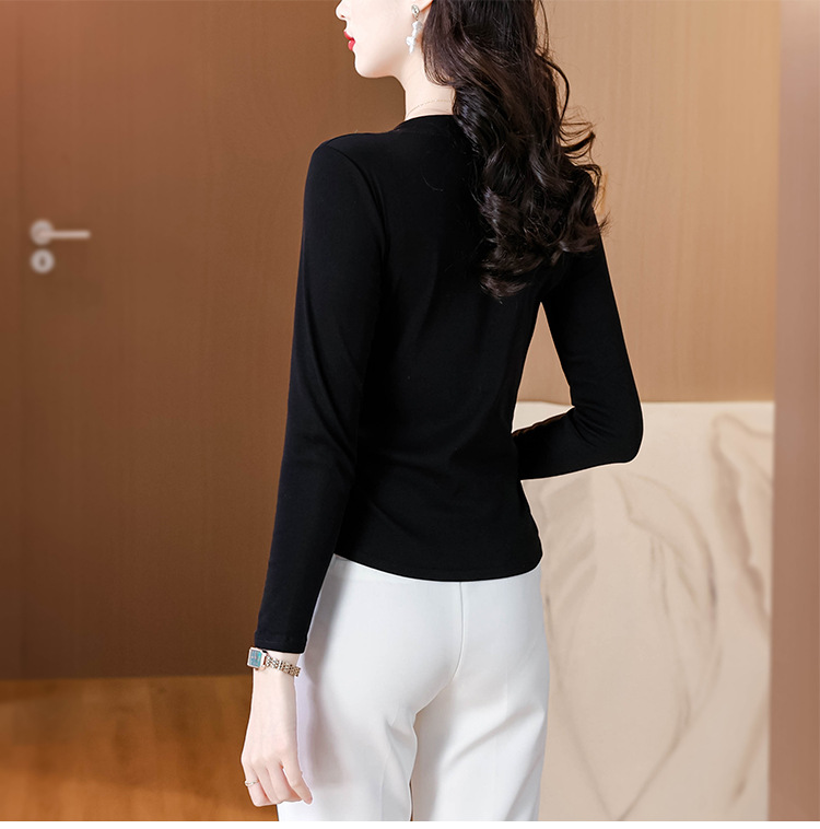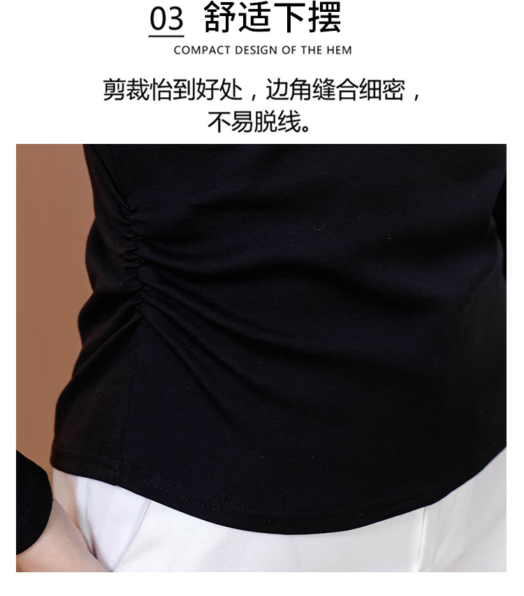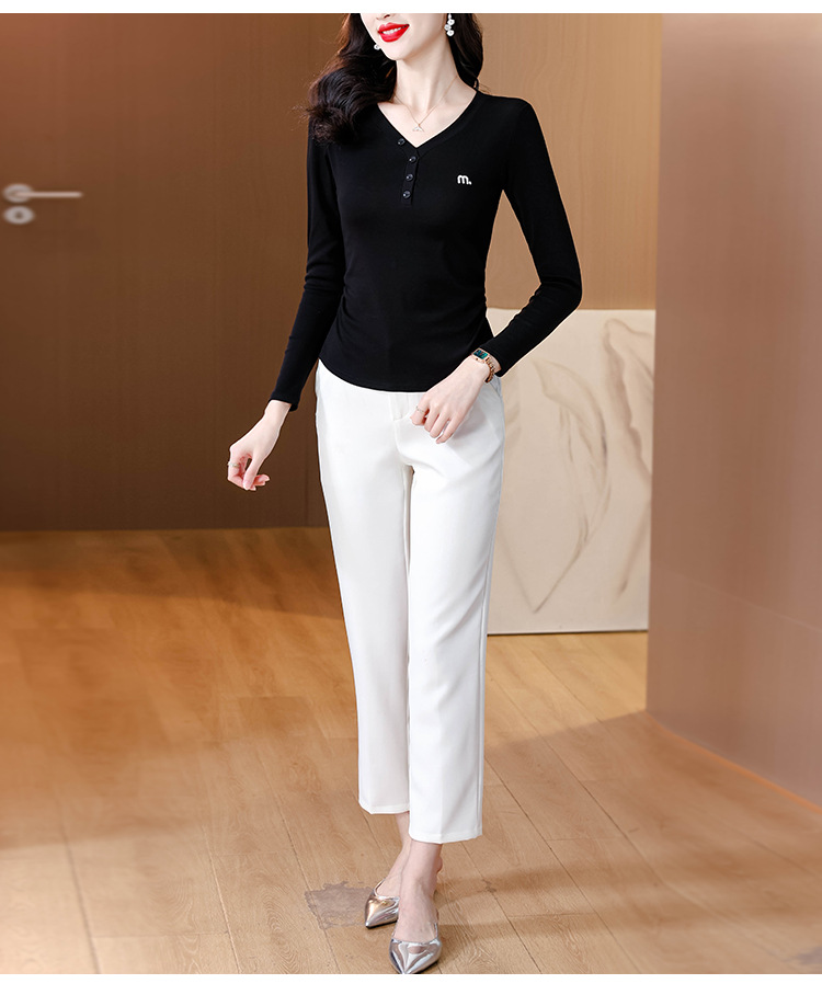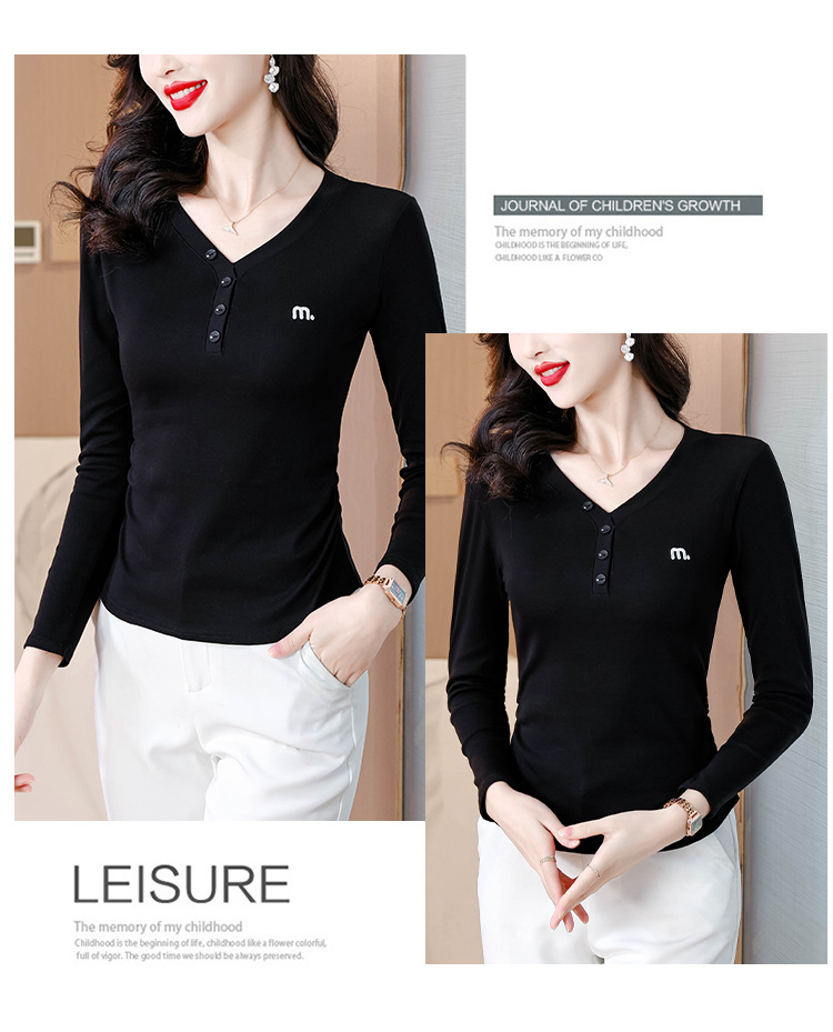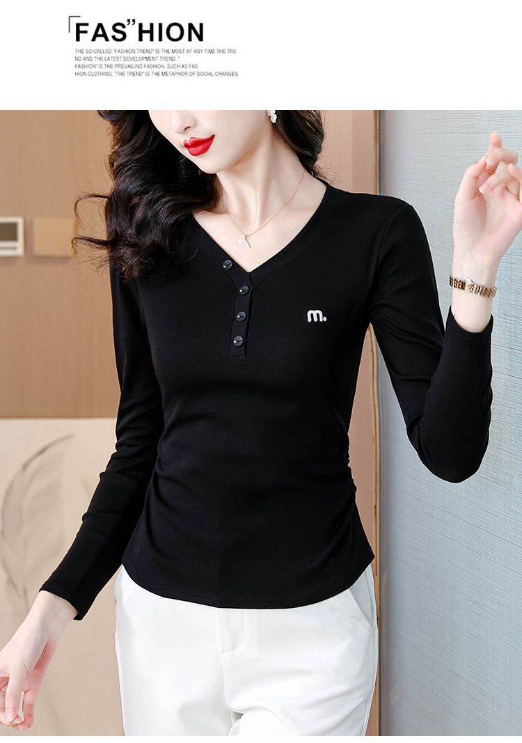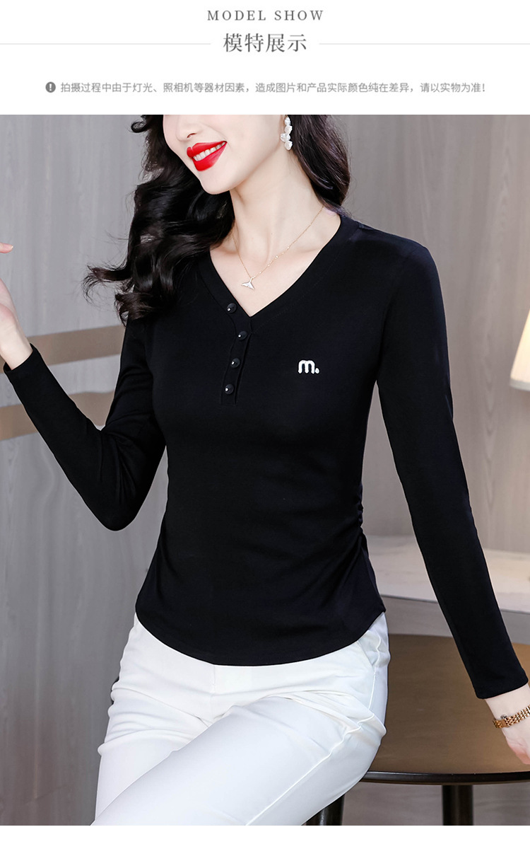 KQL 355H8105纯色V领刺绣长袖T恤时尚修身显瘦上衣