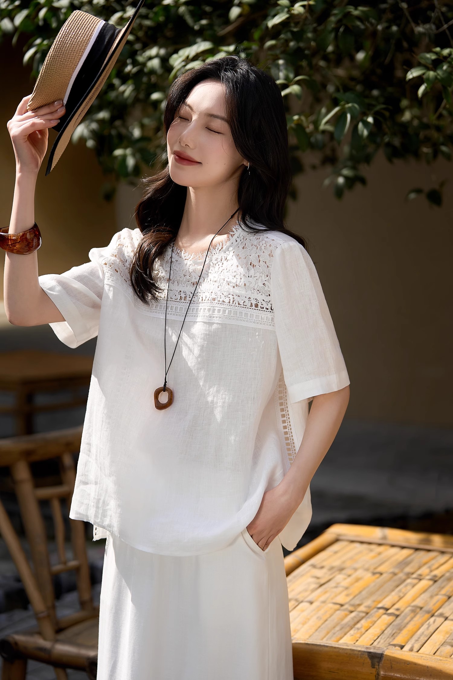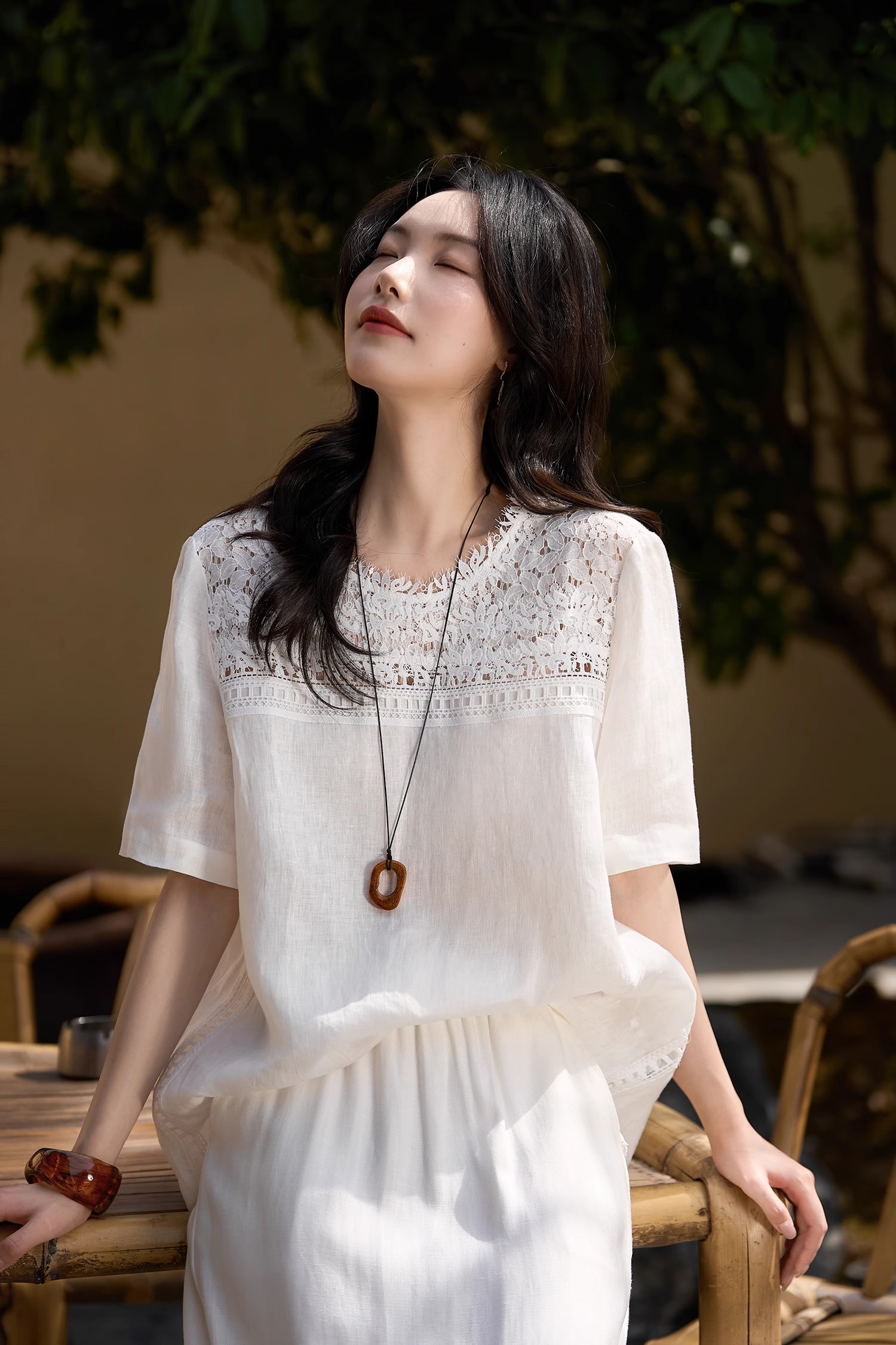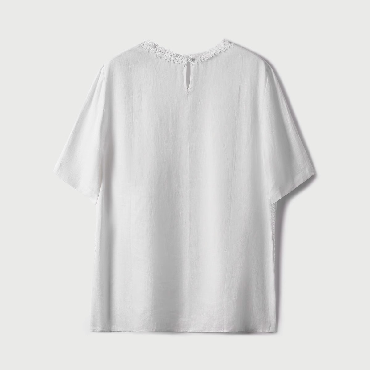【夏日白月光!这件蕾丝衬衣把清冷感焊在身上】法式复古圆领蕾丝拼接短袖小众设计感上衣