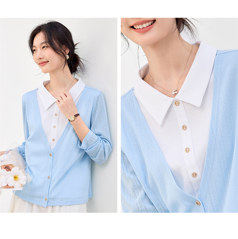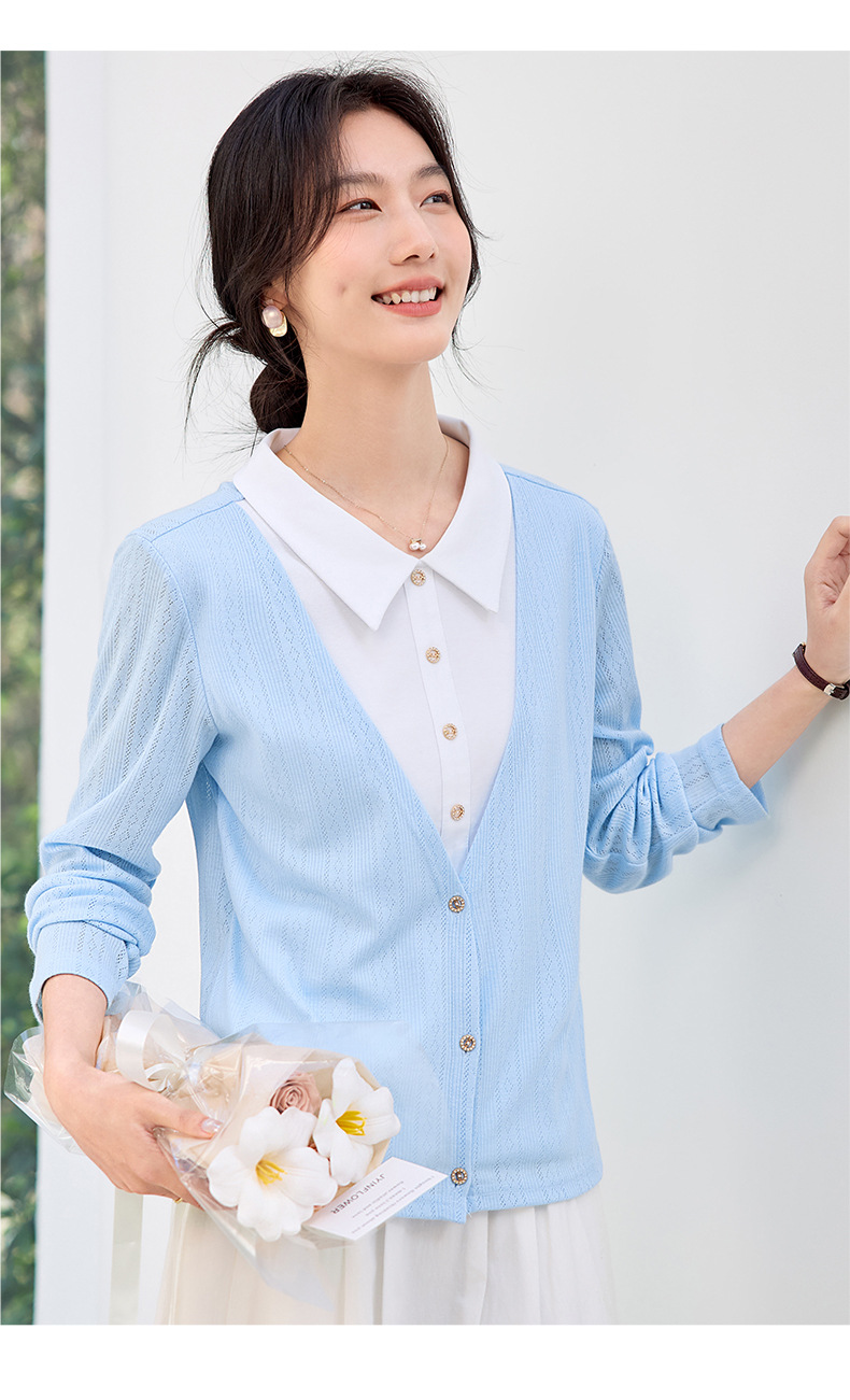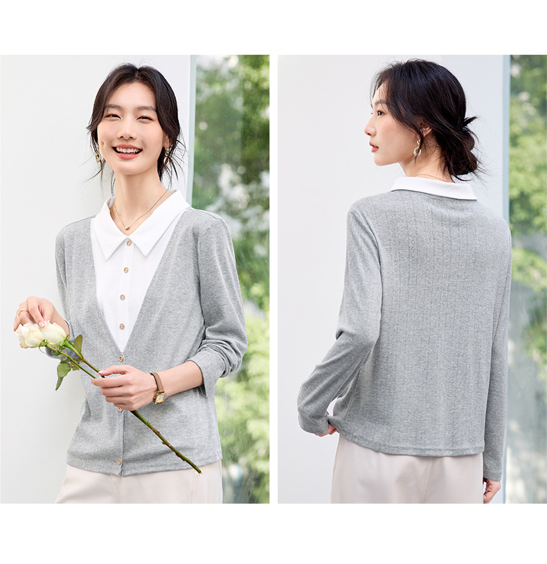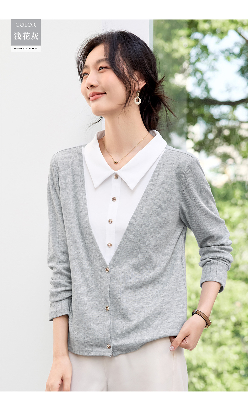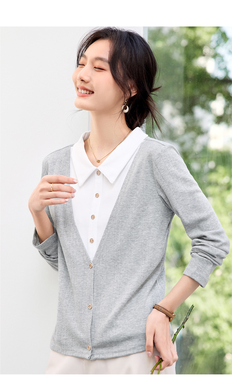 丁摩 【撞色天鹅衫】新款美雅碧棉v领假两件撞色针织开衫打底衫上4ZF-120902