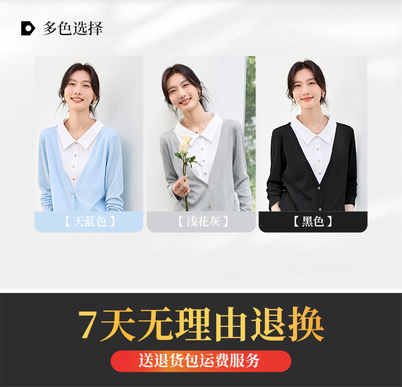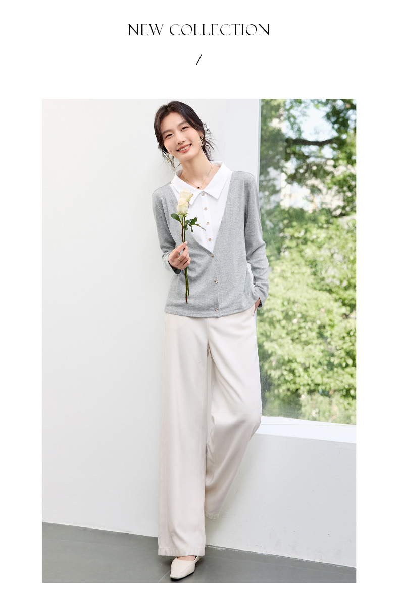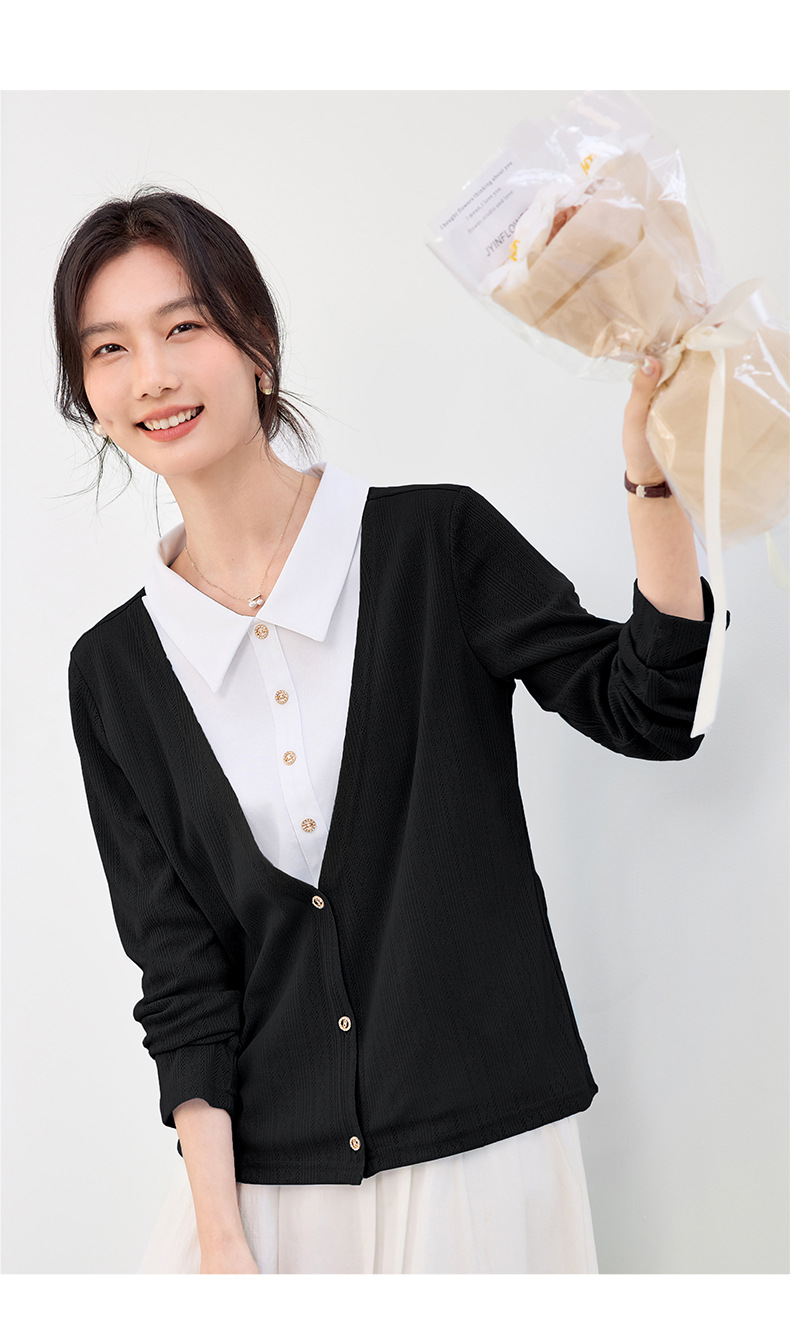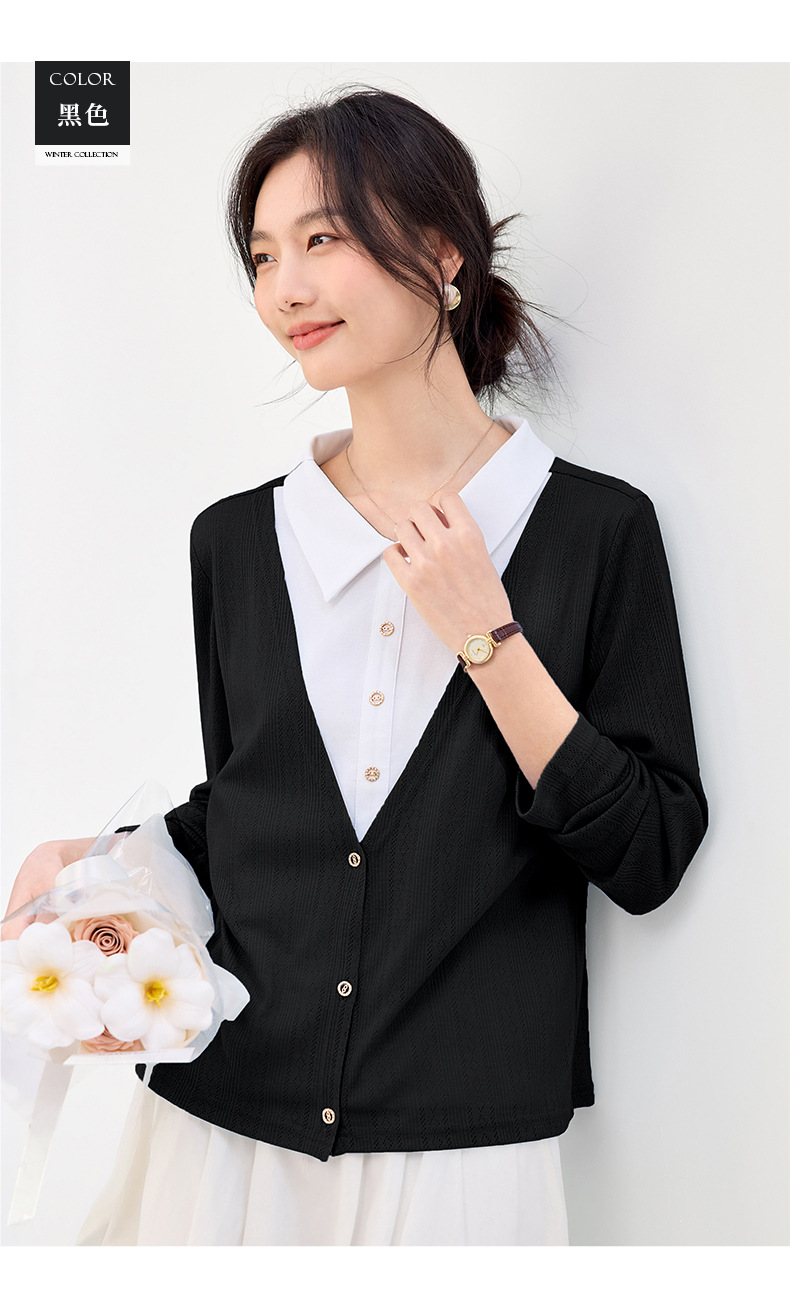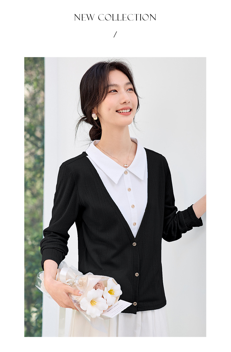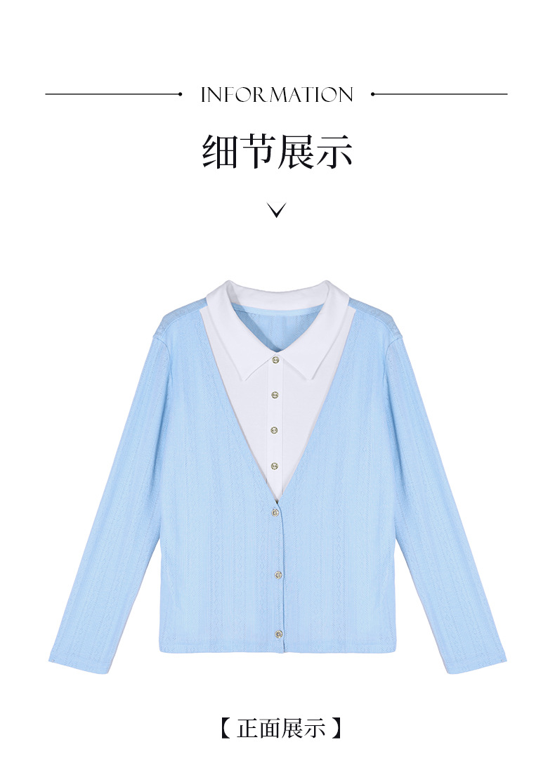丁摩 【撞色天鹅衫】新款美雅碧棉v领假两件撞色针织开衫打底衫上4ZF-120902