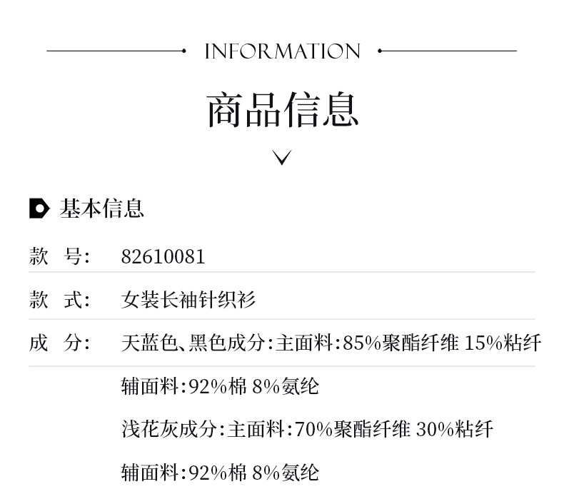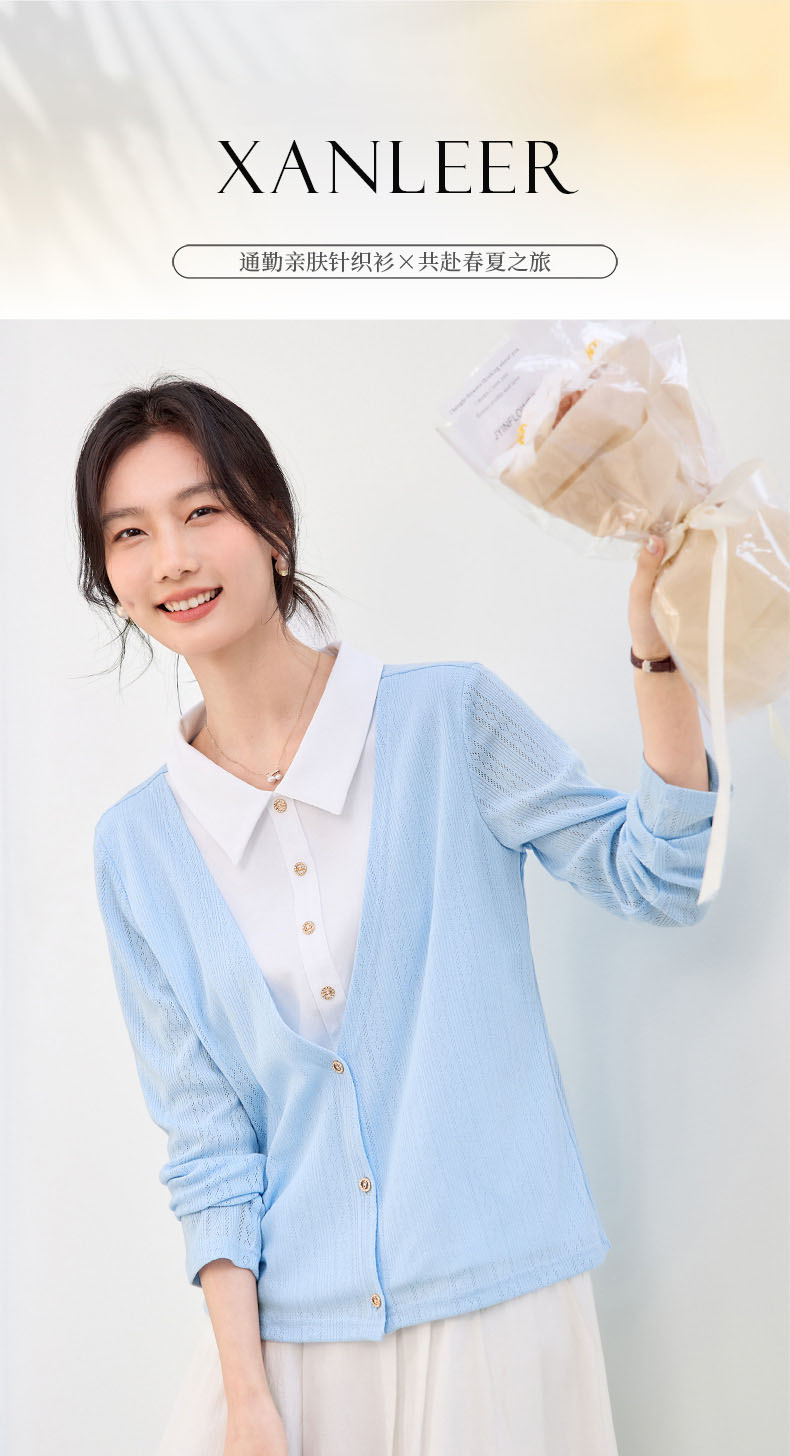 百媚生 假两件翻领蓝色毛衣女士针织衫XS82610081