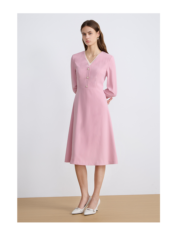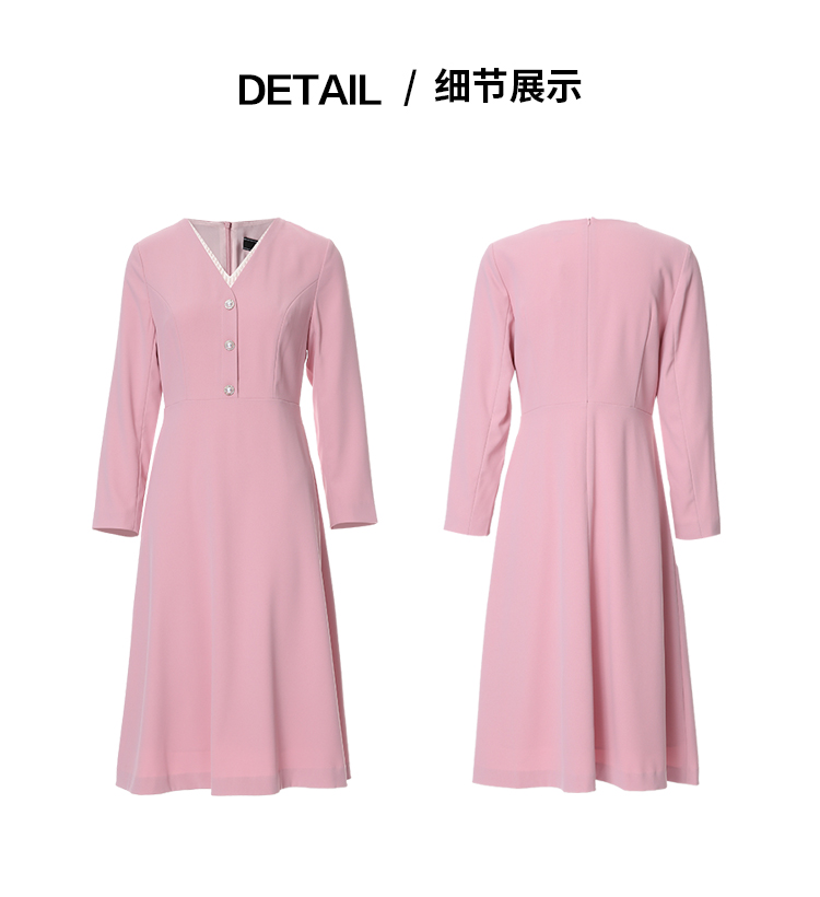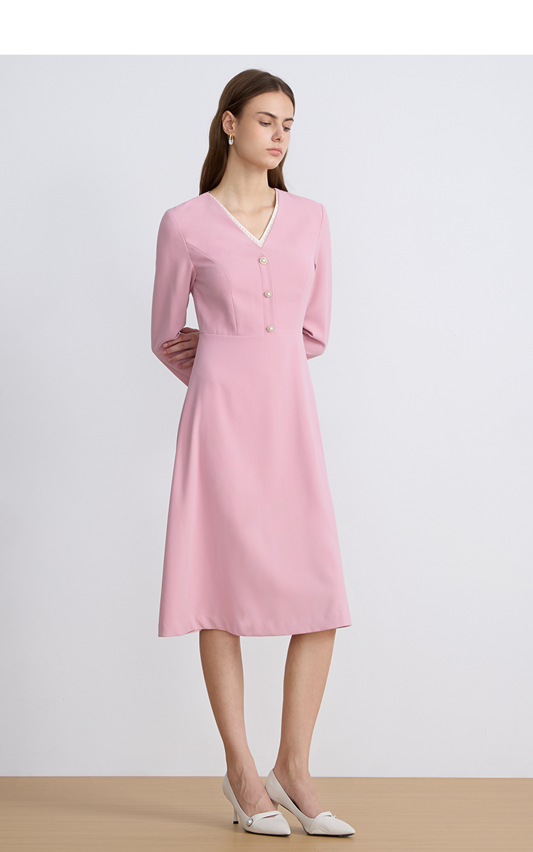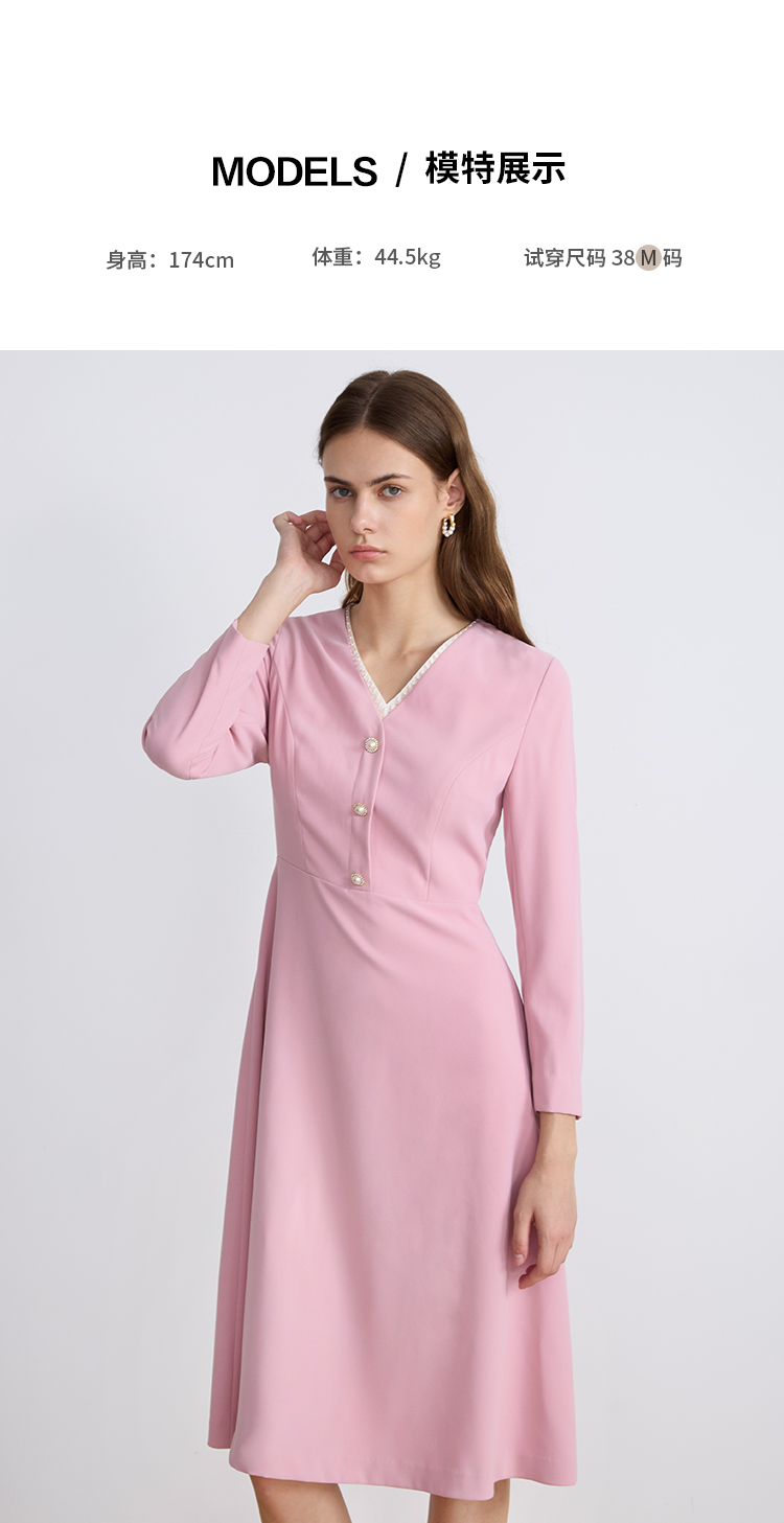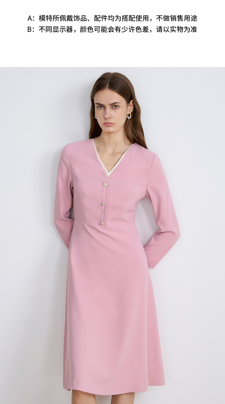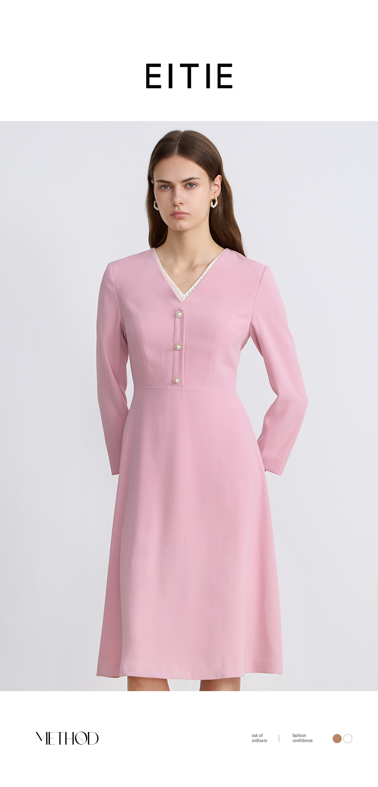 EITIEEITIE爱特爱法式气质优雅V领撞色收腰粉色长袖秋季新款连衣裙C2507840