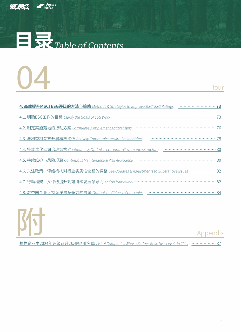 在此次呈现的这份报告中,我们不仅揭示了2024年全球企业MSCIESG评级在全球分国家/地区、分行业的变动情况,也从成功企业的共性入手进行分析,为上市公司和非上市公司的高层管理者提供了切实可行的行动框架。无论您的目的是希望企业的ESG评级能够实现跨越式提升,还是希望了解该如何践行可持续发展战略的理念,相信这份报告都能为您带来一点启发。