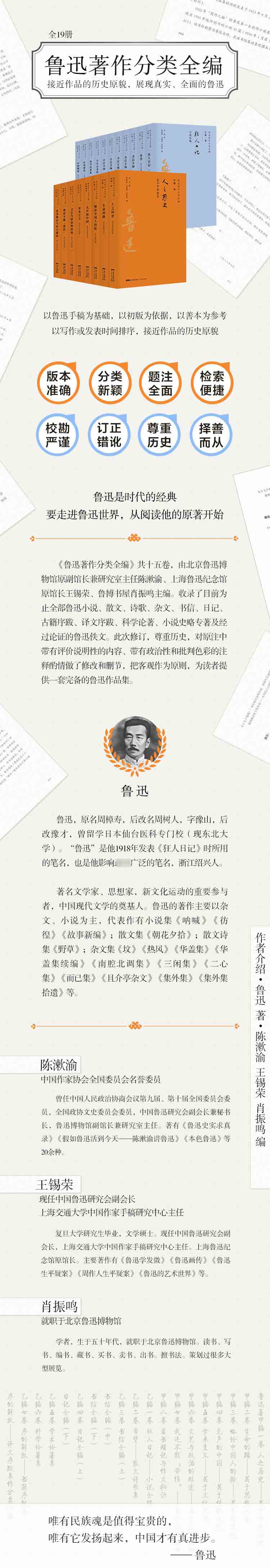 鲁迅?著??陈漱渝?王锡荣?肖振鸣?编 鲁迅,原名周樟寿,后改名周树人,字豫山,后改豫才,曾留学日本仙台医科专门校(现东北大学)。“鲁迅”是他1918年发表《狂人日记》时所用的笔名,也是他影响 为广泛的笔名,浙江绍兴人。 文学家、思想家,新文化运动的重要参与者,中国现代文学的奠基人。鲁迅的著作主要以杂文、小说为主,代表作有小说集《呐喊》《彷徨》《故事新编》;散文集《朝花夕拾》;散文诗集《野草》;杂文集《坟》《热风》《华盖集》《华盖集续编》《南腔北调集》《三闲集》《二心集》《而已集》《且介亭杂文》《集外集》《集外集拾遗》等。 陈漱渝,中国作家协会全国委员会名誉委员。曾任中国人民政治协商会议第九届、第十届全国委员会委员,全国政协文史委员会委员,中国鲁迅研究会副会长兼秘书长,鲁迅博物馆副馆长兼研究室主任。著有《鲁迅史实求真录》《假如鲁迅活到 ——陈漱渝讲鲁迅》《本色鲁迅》等28余种。王锡荣,复旦大学研究生毕业,文学硕士。现任中国鲁迅研究会副会长,上海交通大学中国作家手稿研究中心主任。上海鲁迅纪念馆原馆长。主要著作有《鲁迅学发微》《鲁迅画传》《鲁迅生平疑案》《周作人生平疑案》《鲁迅的艺术世界》等。 肖振鸣,学者,生于五十年代,就职于北京鲁迅博物馆。读书、写书、编书、藏书、买书、卖书、出书。擅书法。策划过很多大型展览。