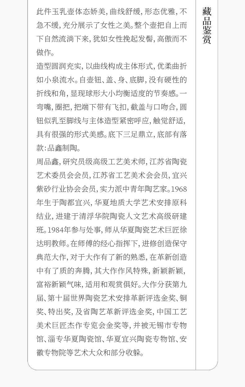 《玉乳壶》 周品鑫 正高级工艺美术师(研究员级高级工艺美术师)、实力派中青年陶艺家、省工艺美术学会陶艺专业委员会会员、宜兴紫砂行业协会会员