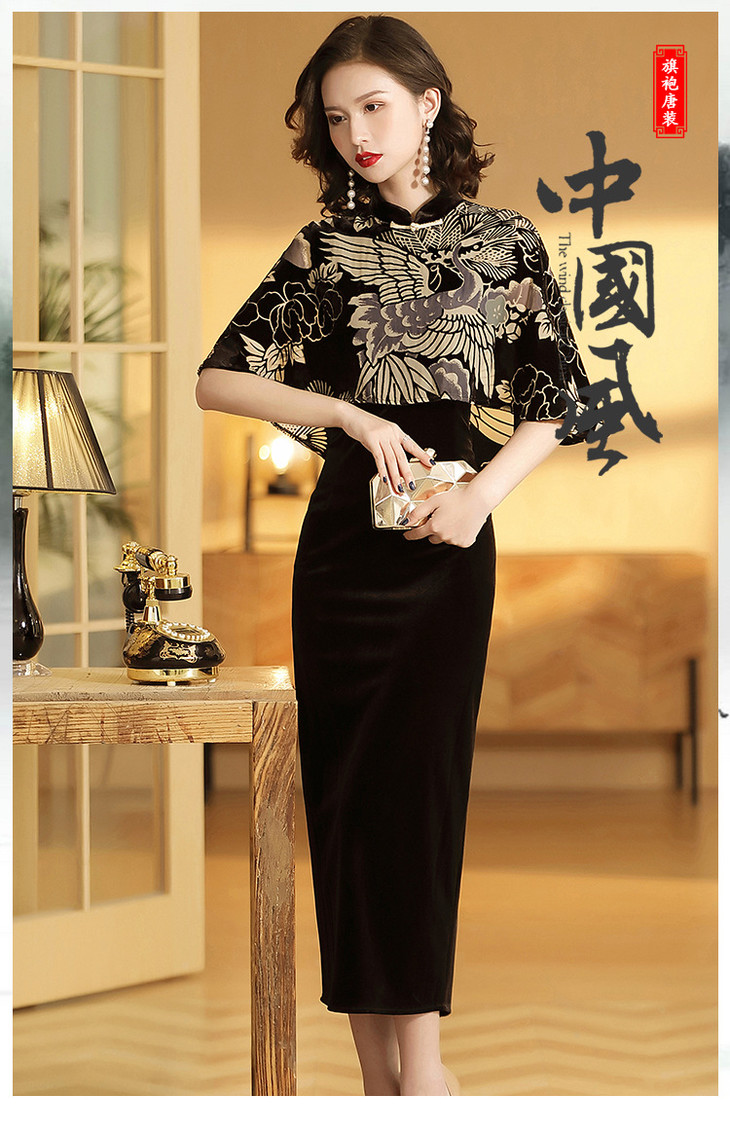 上海旗袍厂修身民国风,印花拼接斗篷立领旗袍裙AYK-QF190630