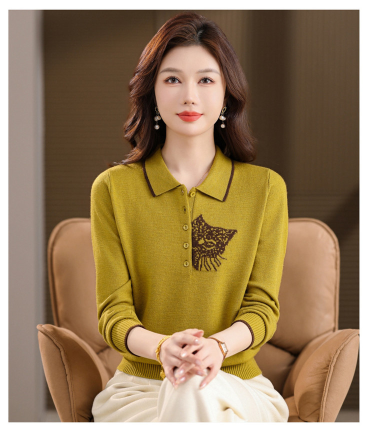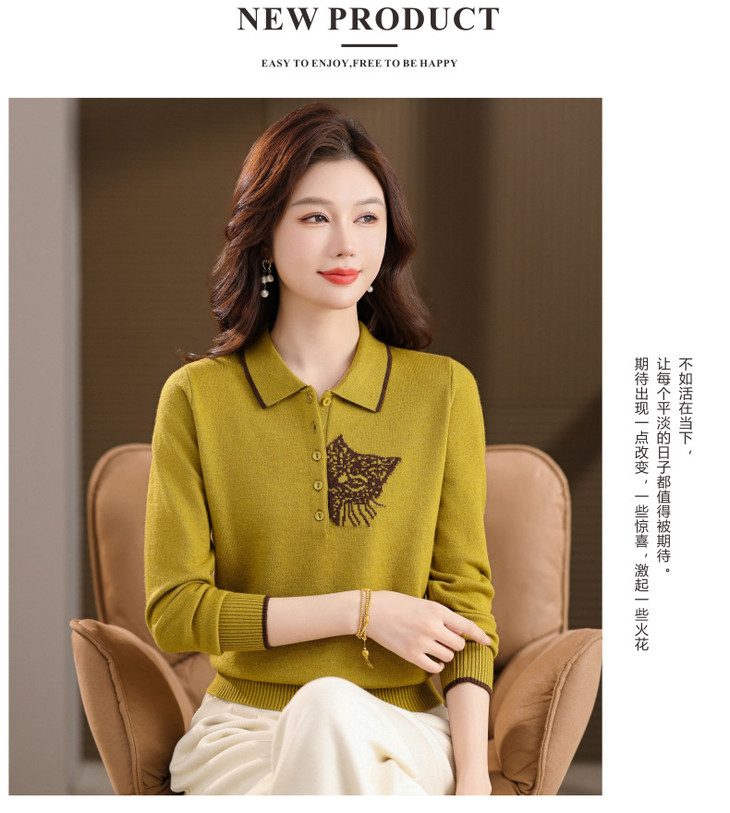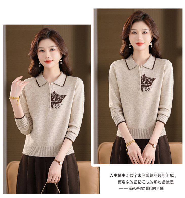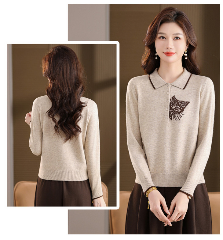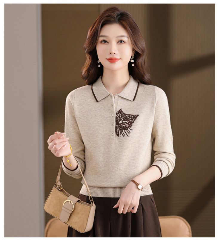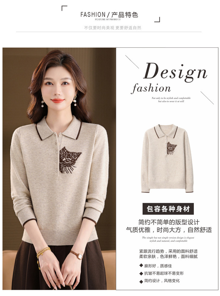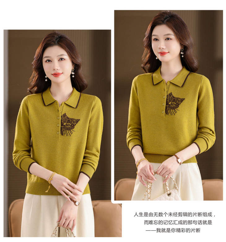 法式优雅撞色翻领针织衫,新款猫咪刺绣显瘦长袖毛衣打底CC9233
