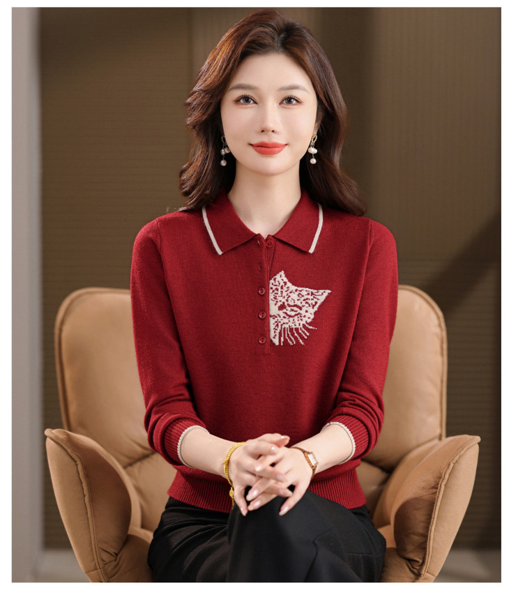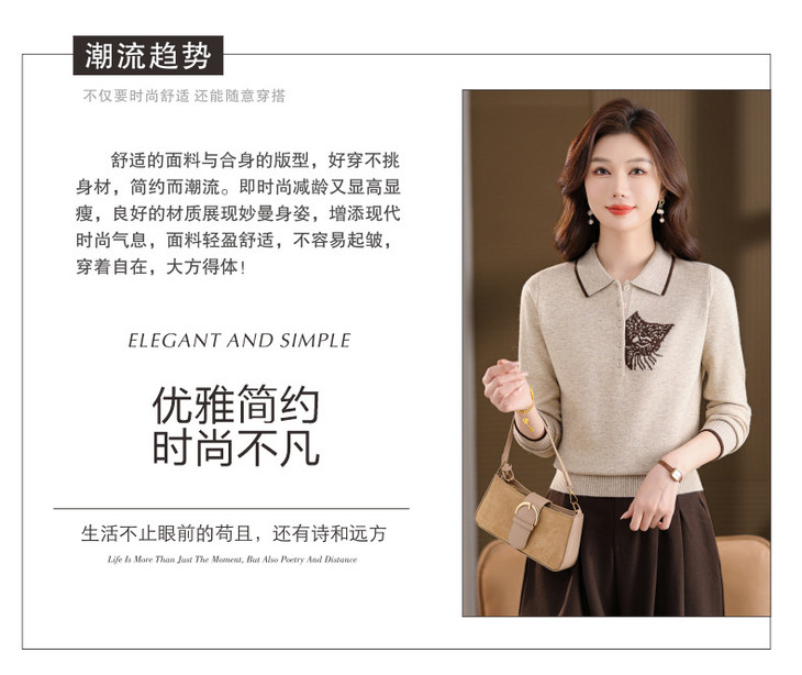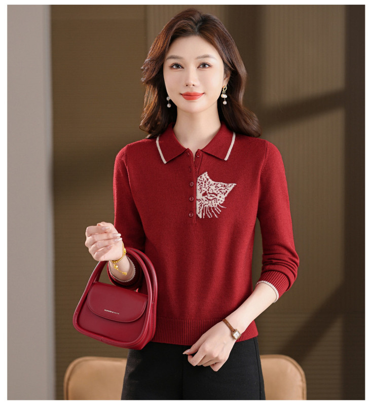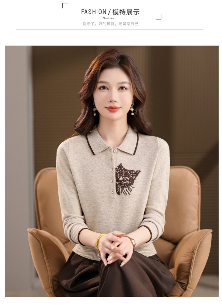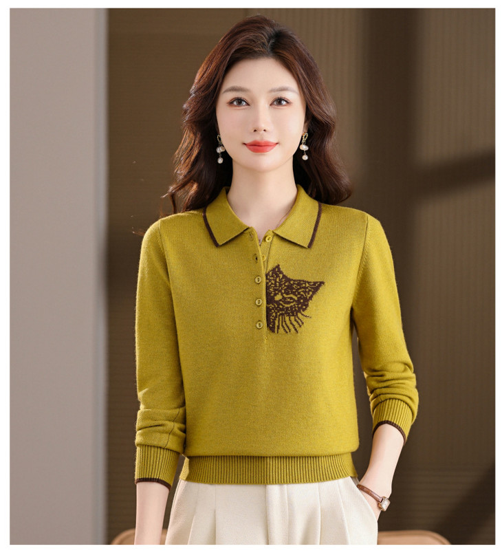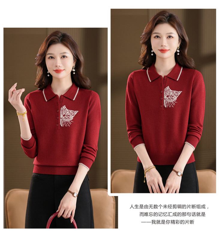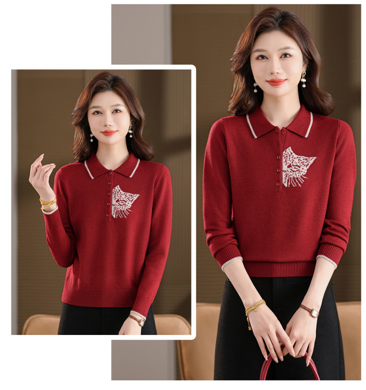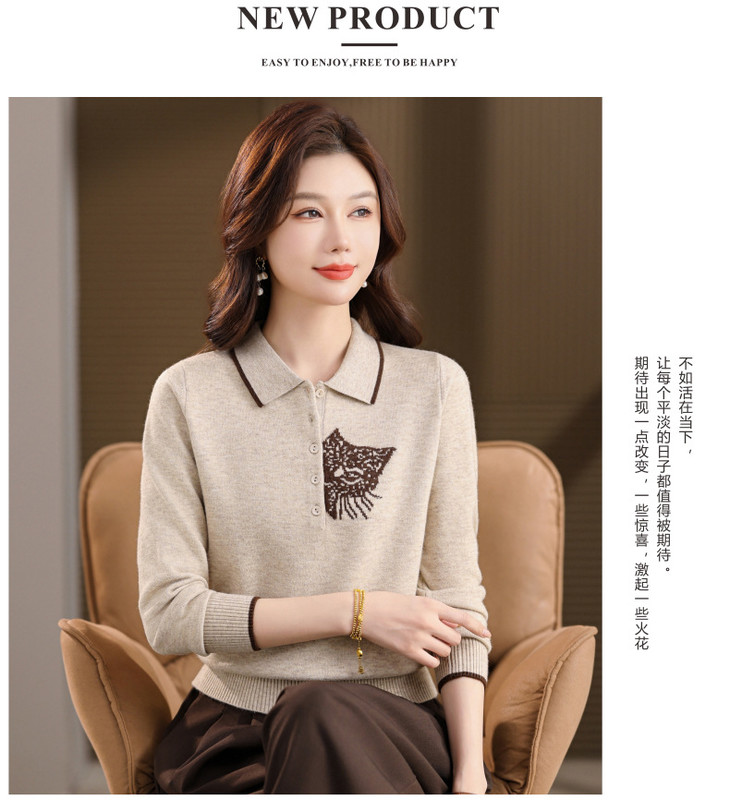 法式优雅撞色翻领针织衫,新款猫咪刺绣显瘦长袖毛衣打底CC9233