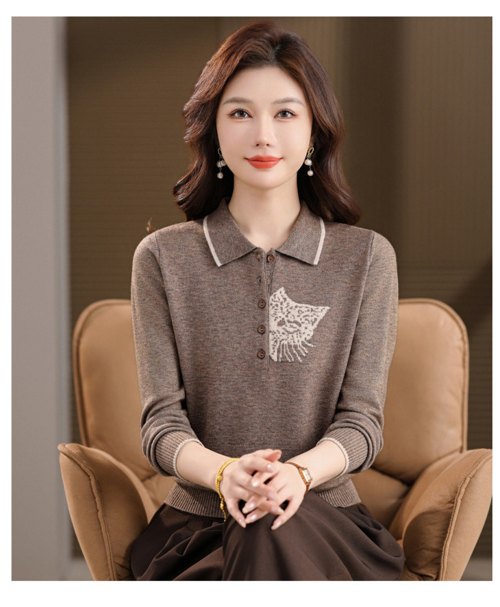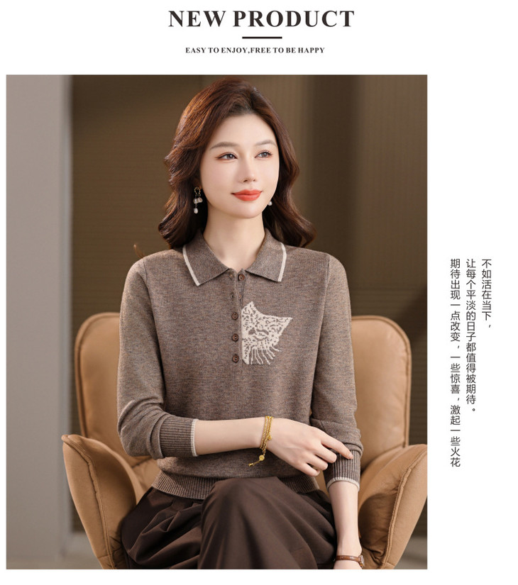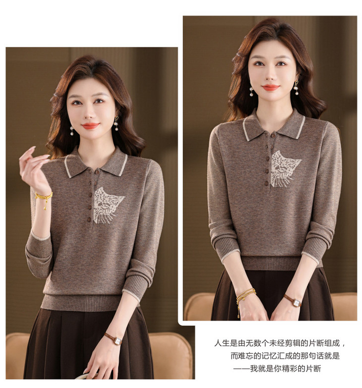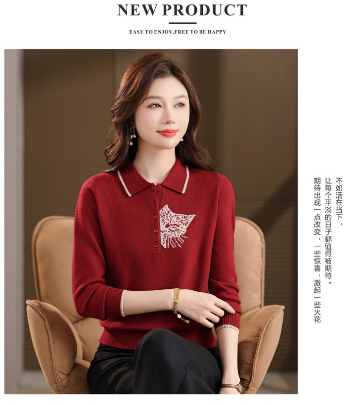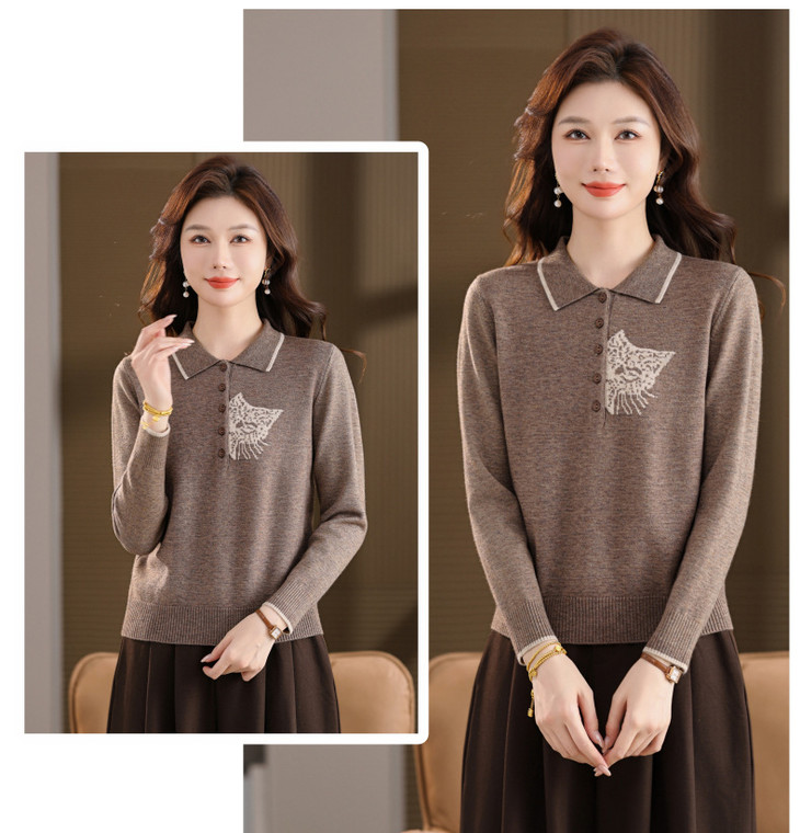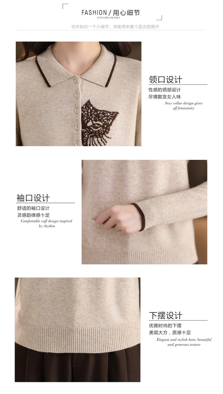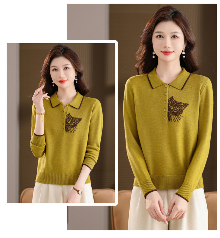 法式优雅撞色翻领针织衫,新款猫咪刺绣显瘦长袖毛衣打底CC9233