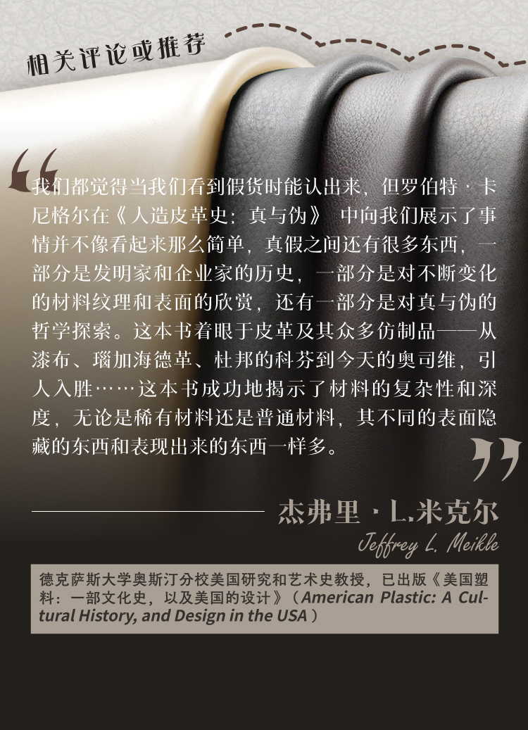 “我们都觉得当我们看到假货时能认出来,但罗伯特·卡尼格尔在《人造皮革史:真与伪》 中向我们展示了事情并不像看起来那么简单,真假之间还有很多东西,一部分是发明家和企业家的历史,一部分是对不断变化的材料纹理和表面的欣赏,还有一部分是对真与伪的哲学探索。这本书着眼于皮革及其众多仿制品——从漆布、瑙加海德革、杜邦的科芬到今天的奥司维,引人入胜……这本书成功地揭示了材料的复杂性和深度,无论是稀有材料还是普通材料,其不同的表面隐藏的东西和表现出来的东西一样多。”