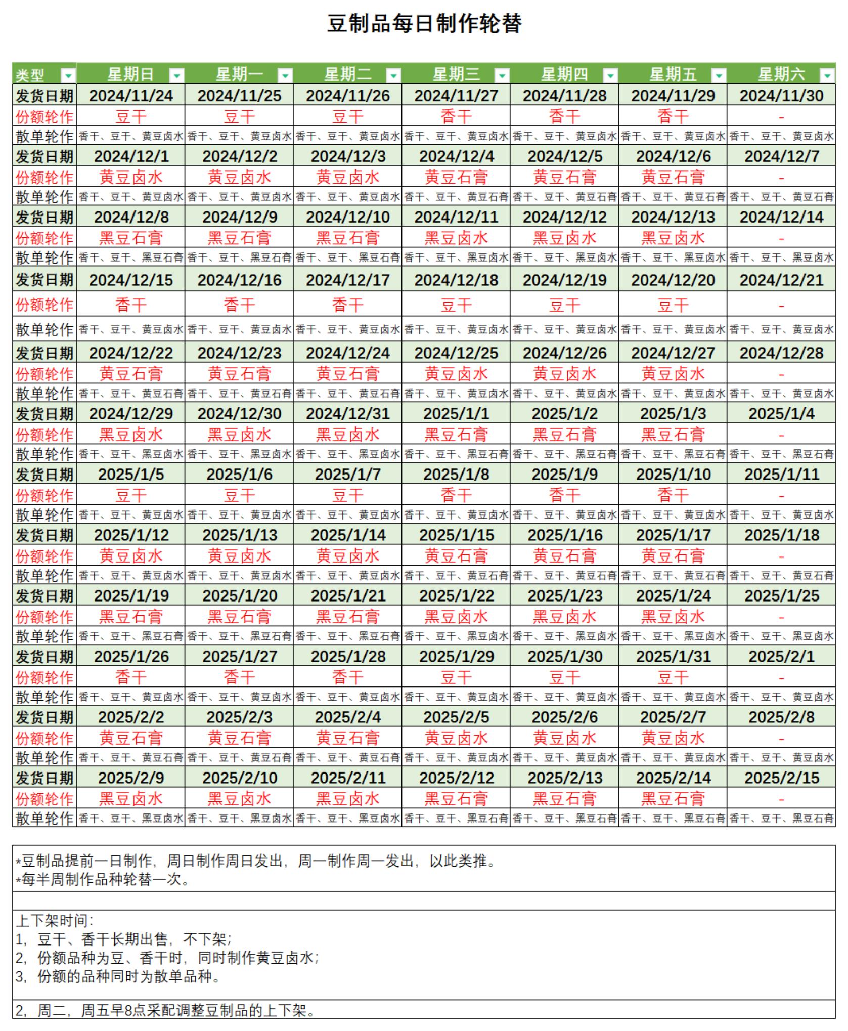 想要订购豆腐散单的朋友,可以根据豆腐轮作时间表,了解喜欢的豆腐品种的出品时间,向客服下订单。