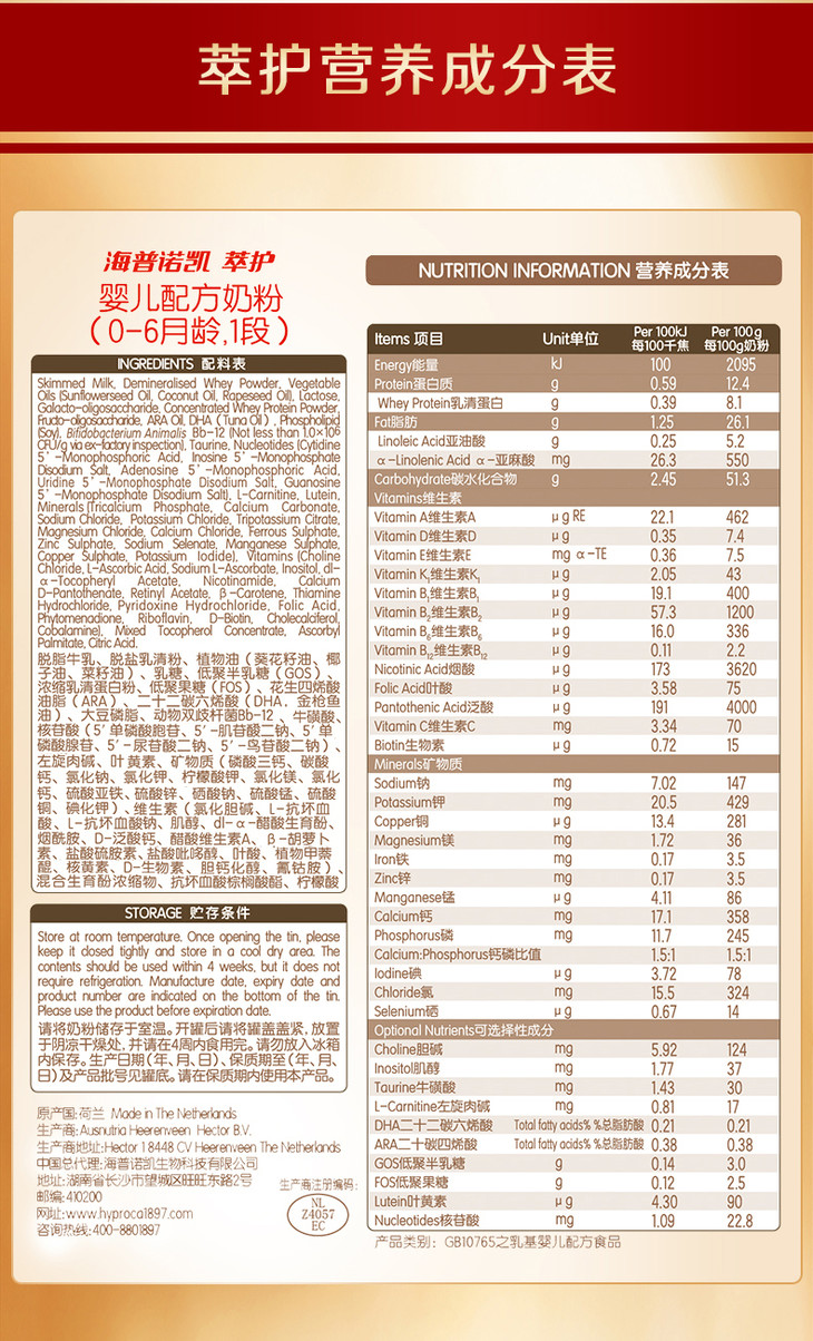 荷兰罐装进口 海普诺凯1897 萃护系列 婴儿配方奶粉1段 800g