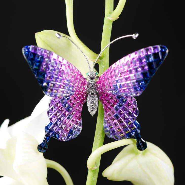 「颤」隐形镶嵌彩色蓝宝石钻石蝴蝶胸针