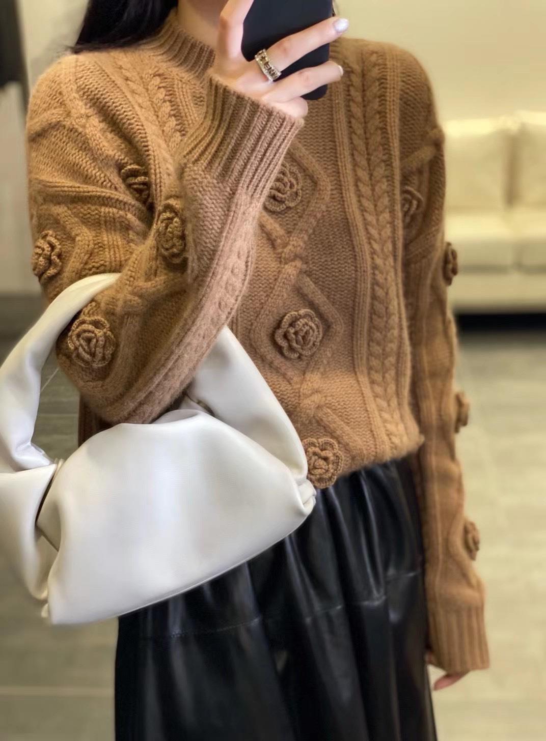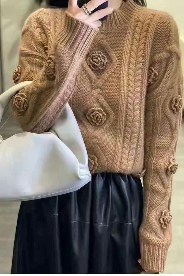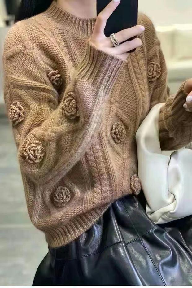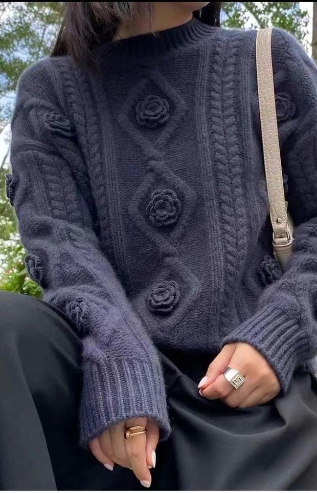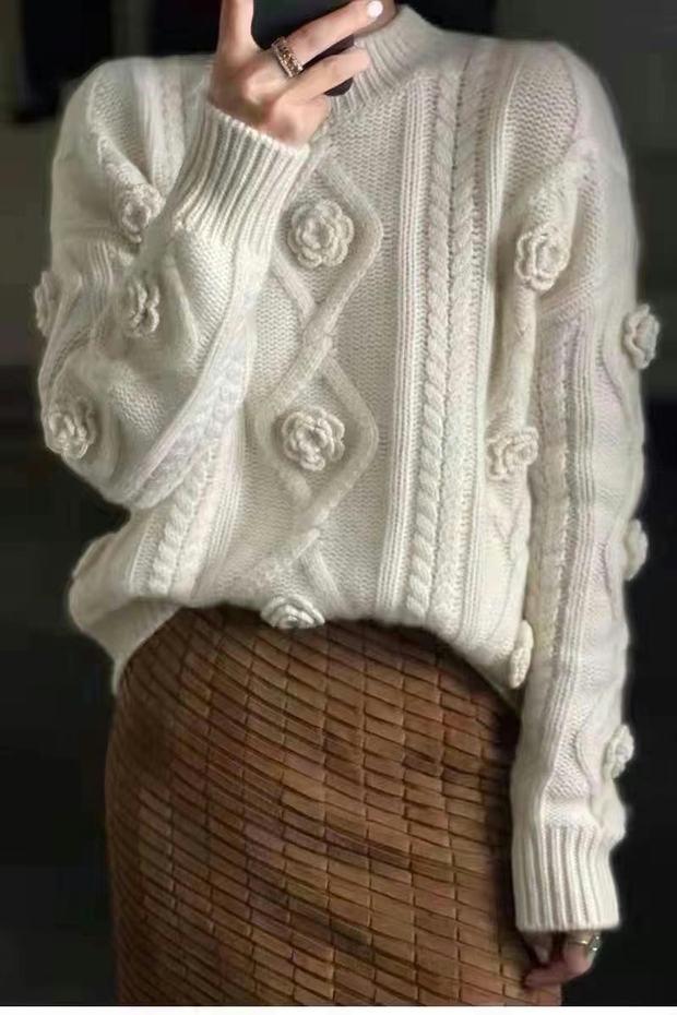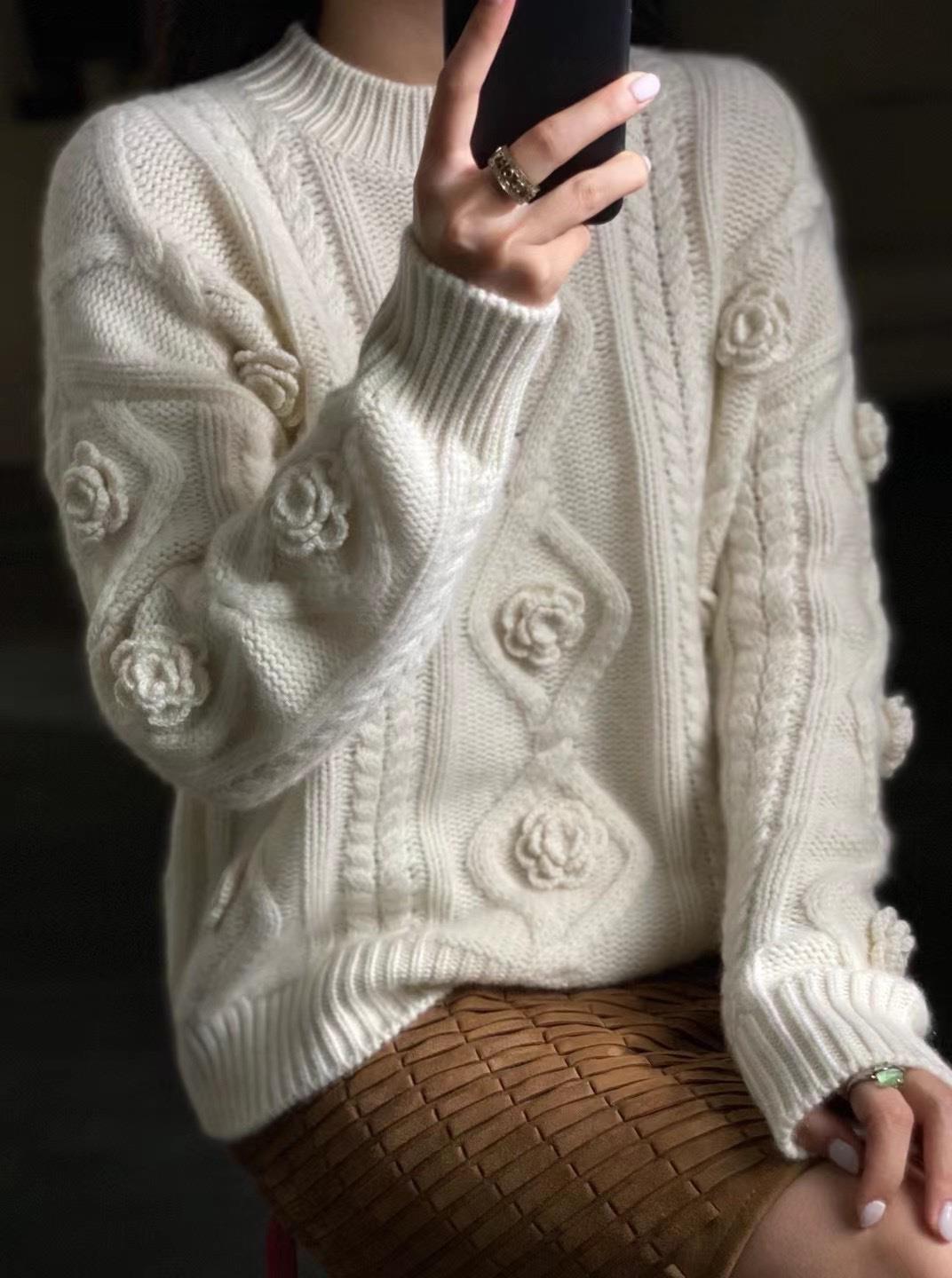 立体玫瑰钩花麻花套头毛衣女2021秋冬新款百搭慵懒风套头针织衫潮