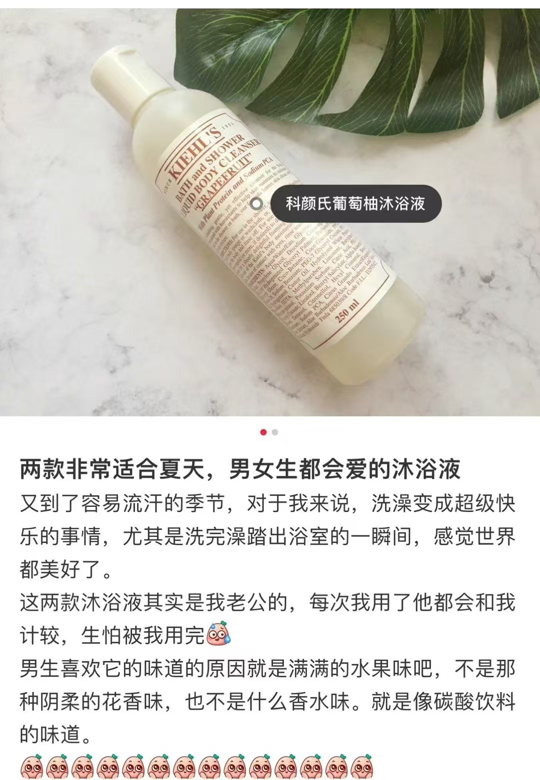 250ml*2 直邮 可以用好久 kiehls科颜氏葡萄柚身体清洁沐浴露,温和而有效地清洁肌肤,令肌肤拥有迷人的质感,注入保湿剂,帮助皮肤保持水分。由植物蛋白和PCA钠配制而成,提供清新的芳香