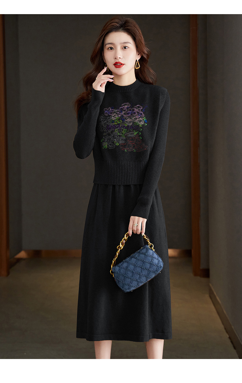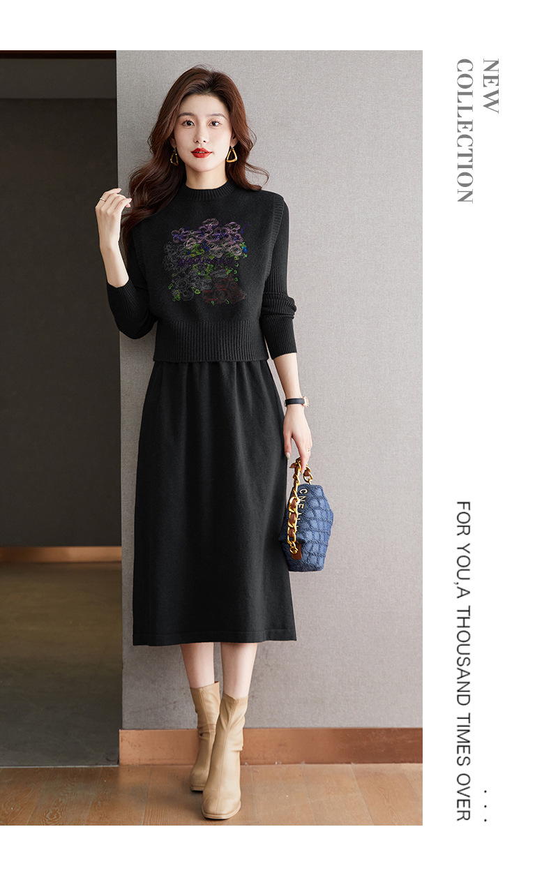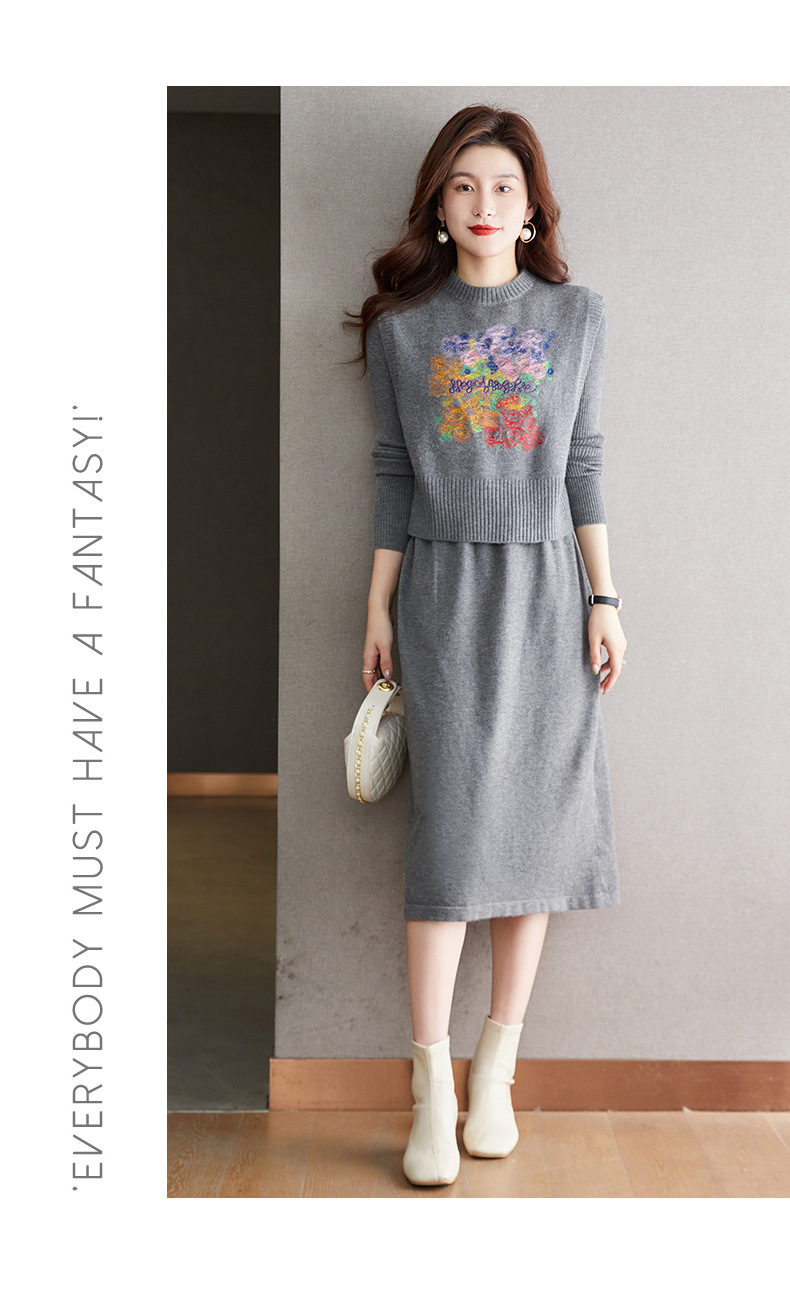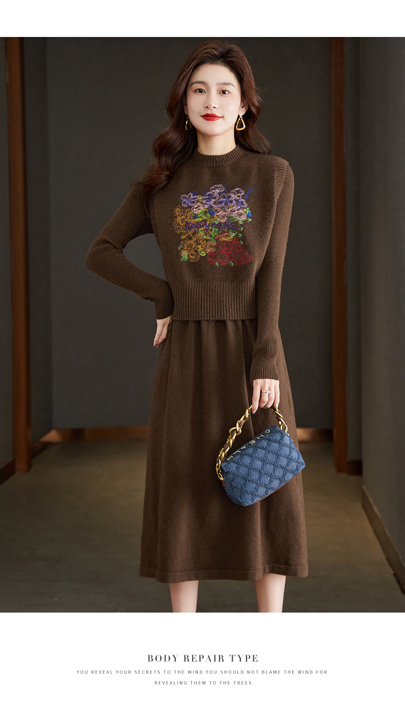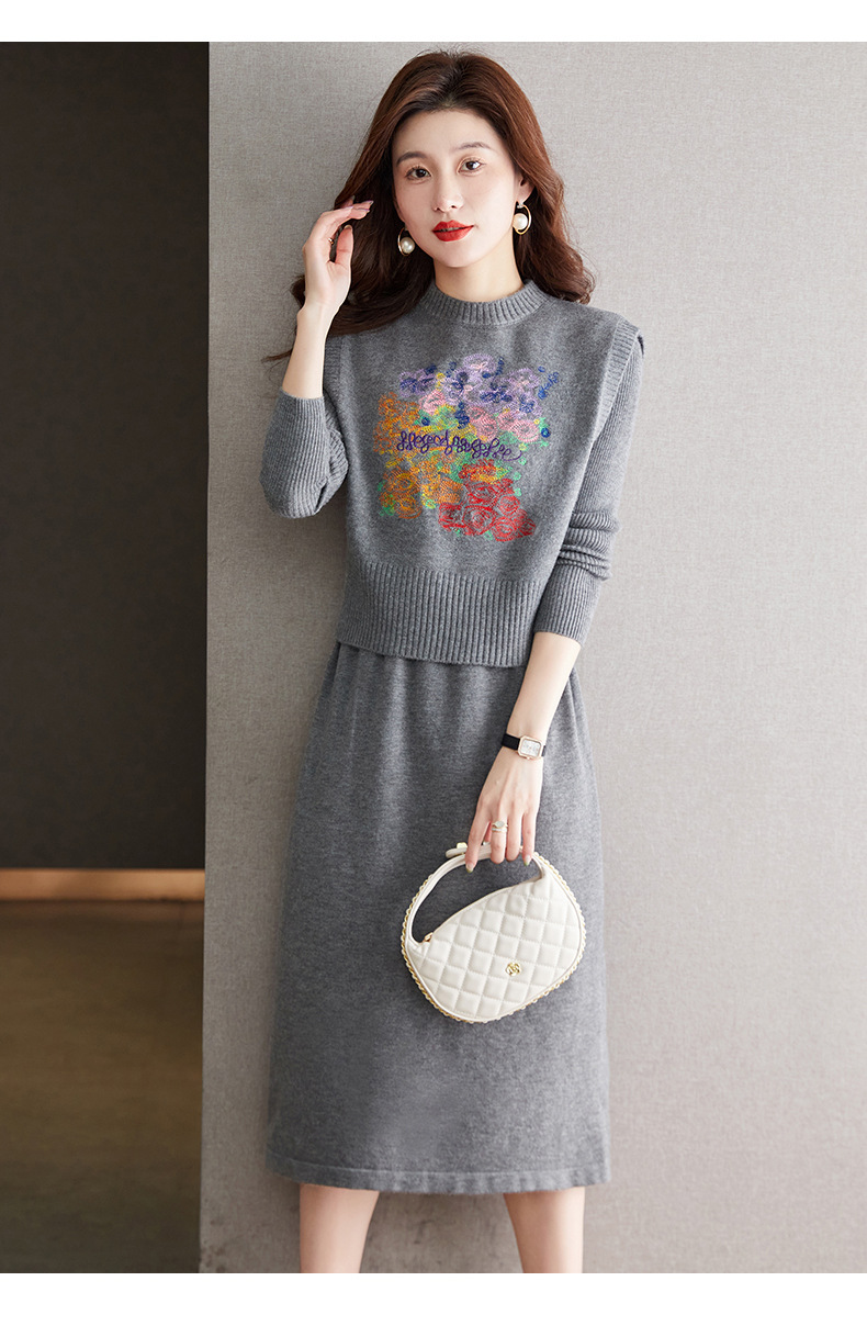 秋冬新款,刺绣针织背心连衣裙真两件套女装气质毛衣裙套装裙CC-22-2309