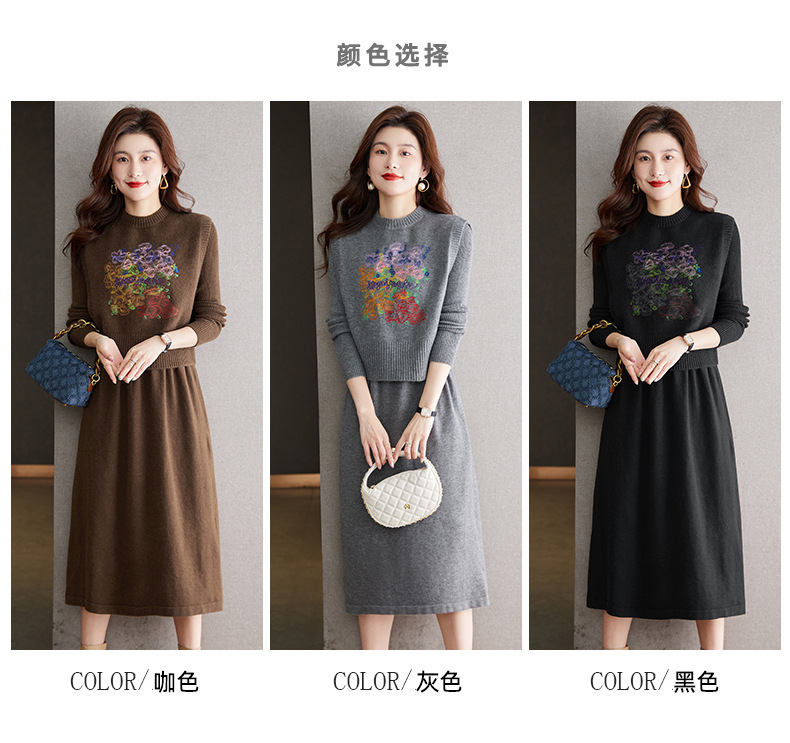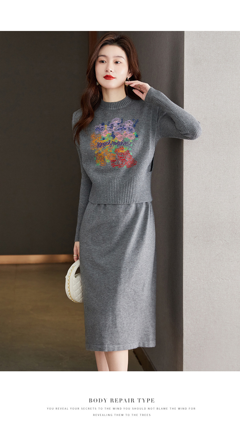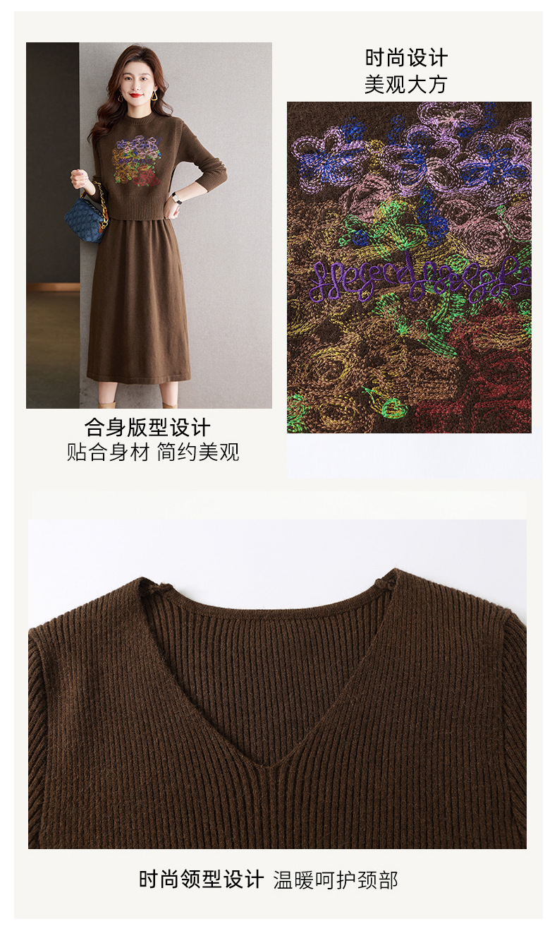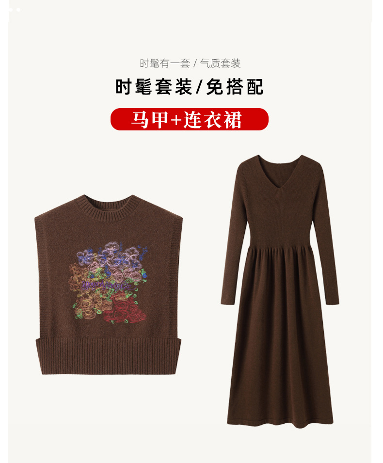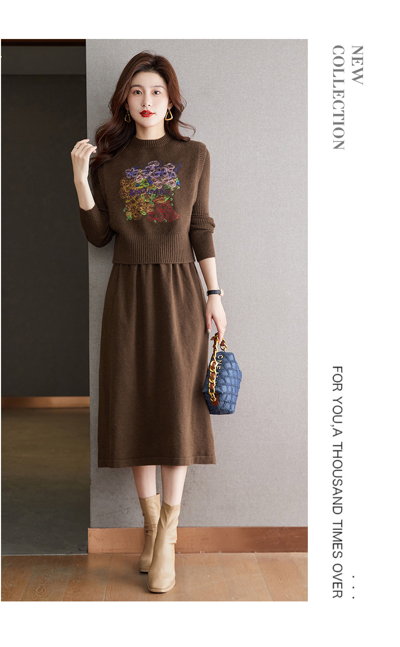 秋冬新款,刺绣针织背心连衣裙真两件套女装气质毛衣裙套装裙CC-22-2309
