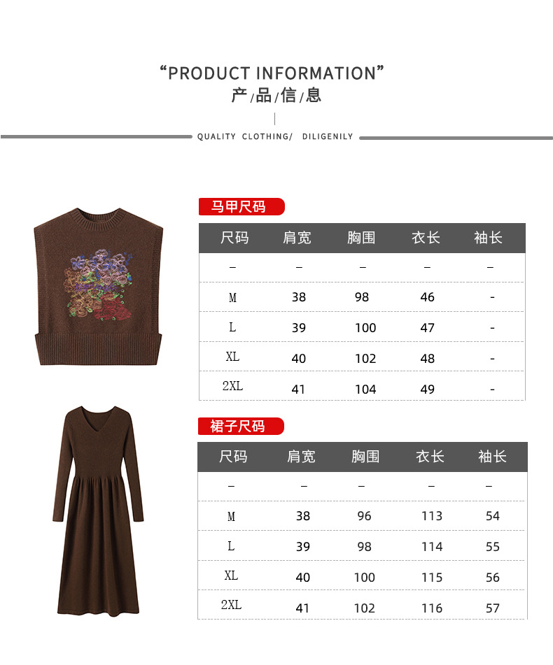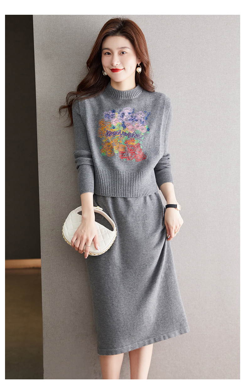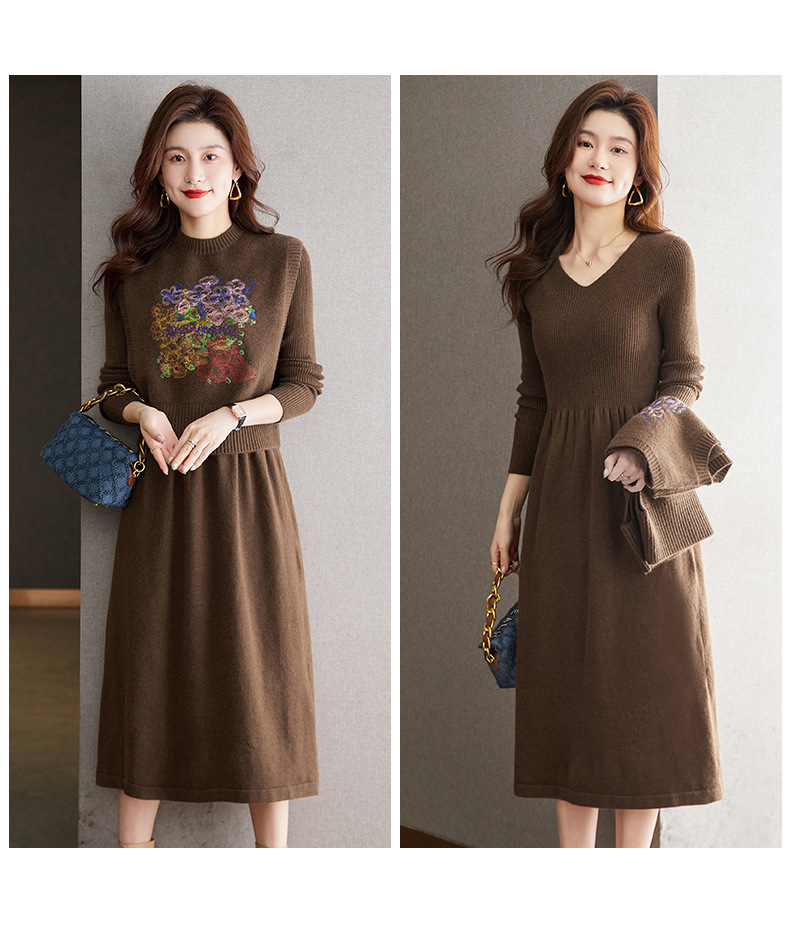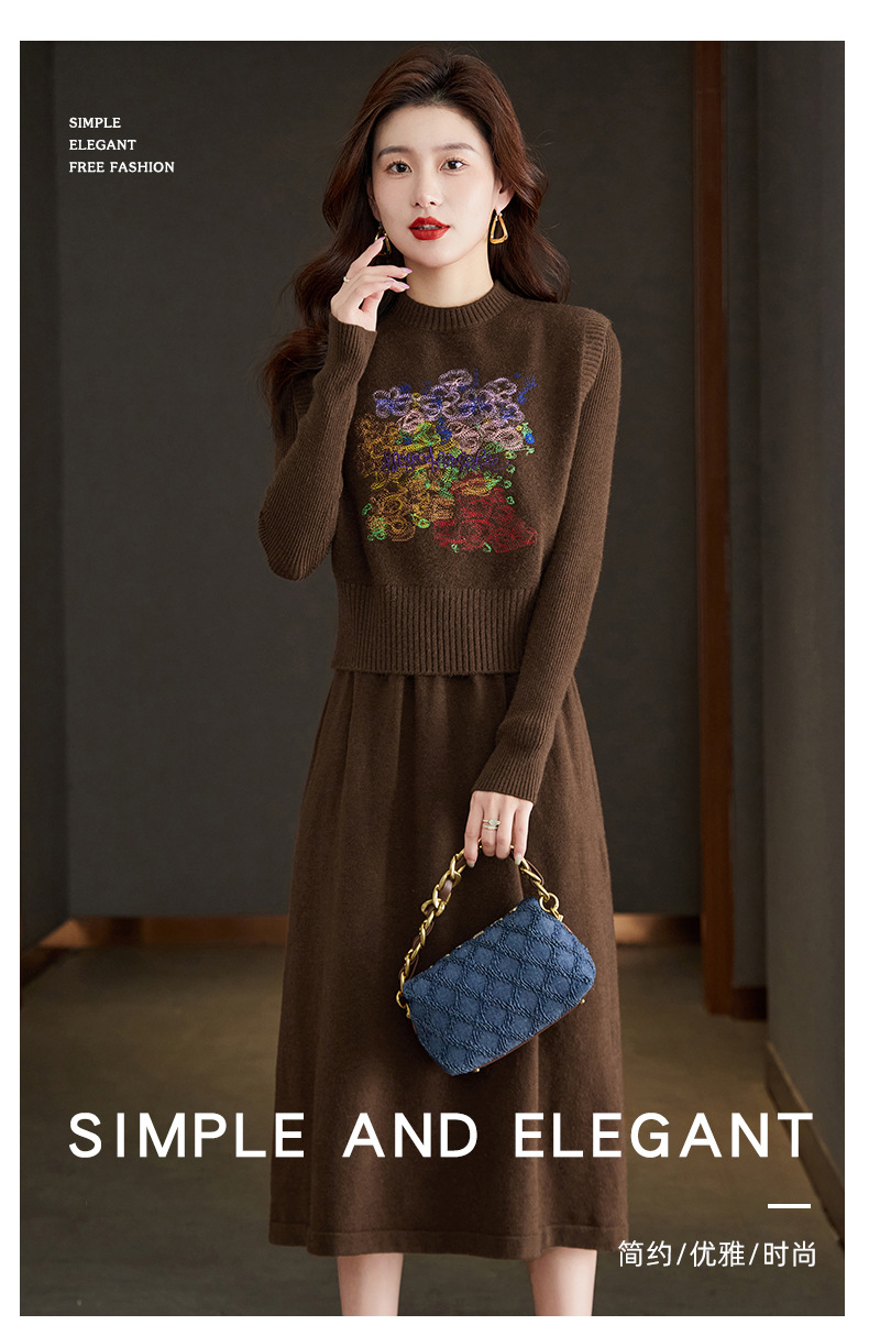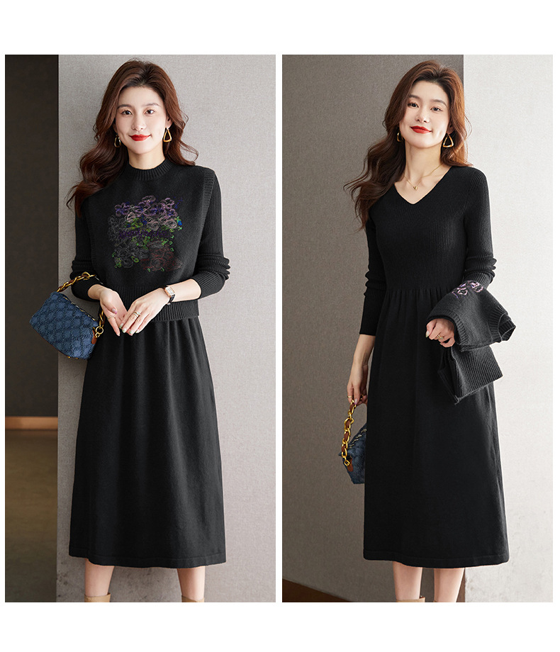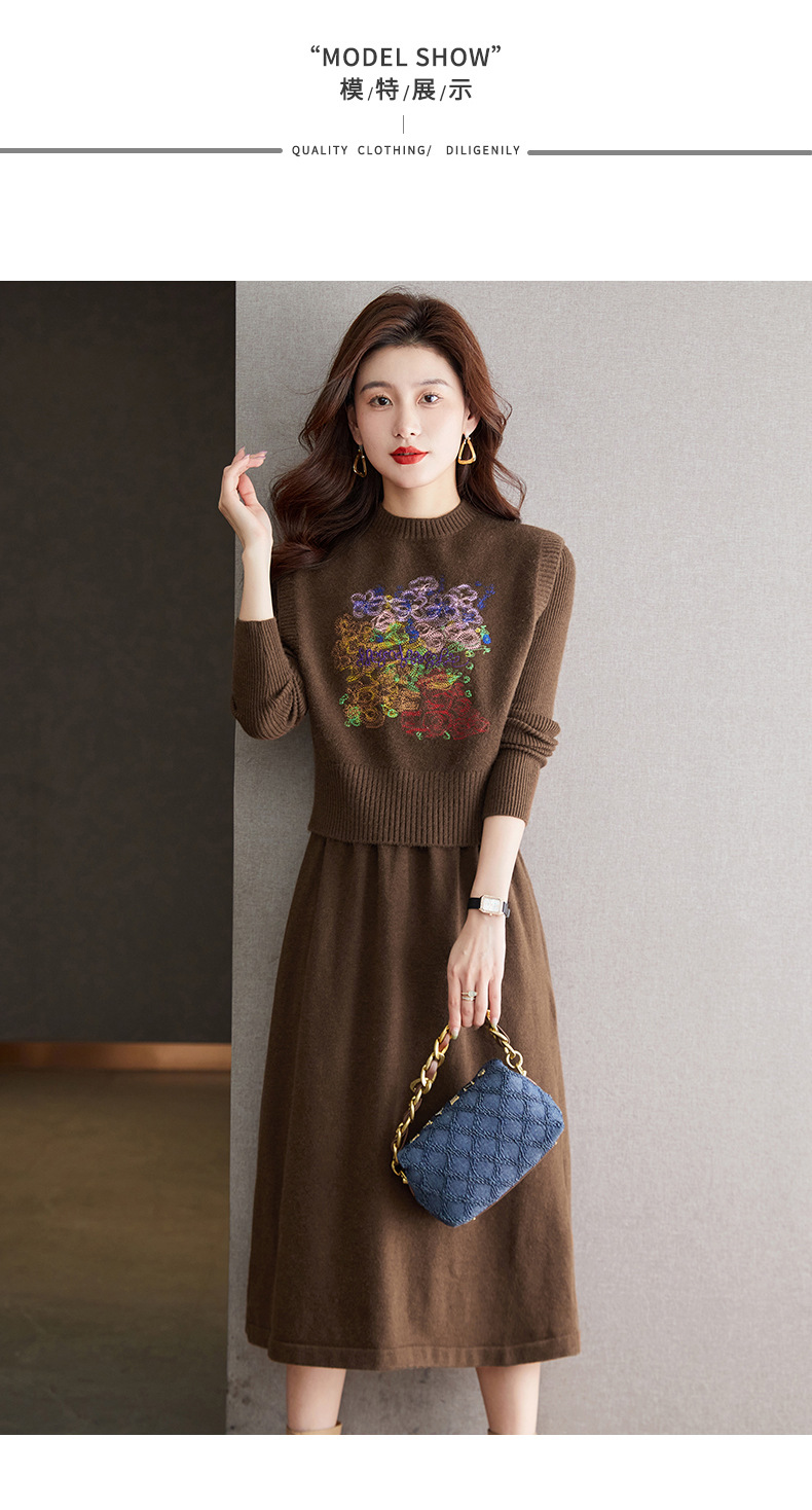 秋冬新款,刺绣针织背心连衣裙真两件套女装气质毛衣裙套装裙CC-22-2309