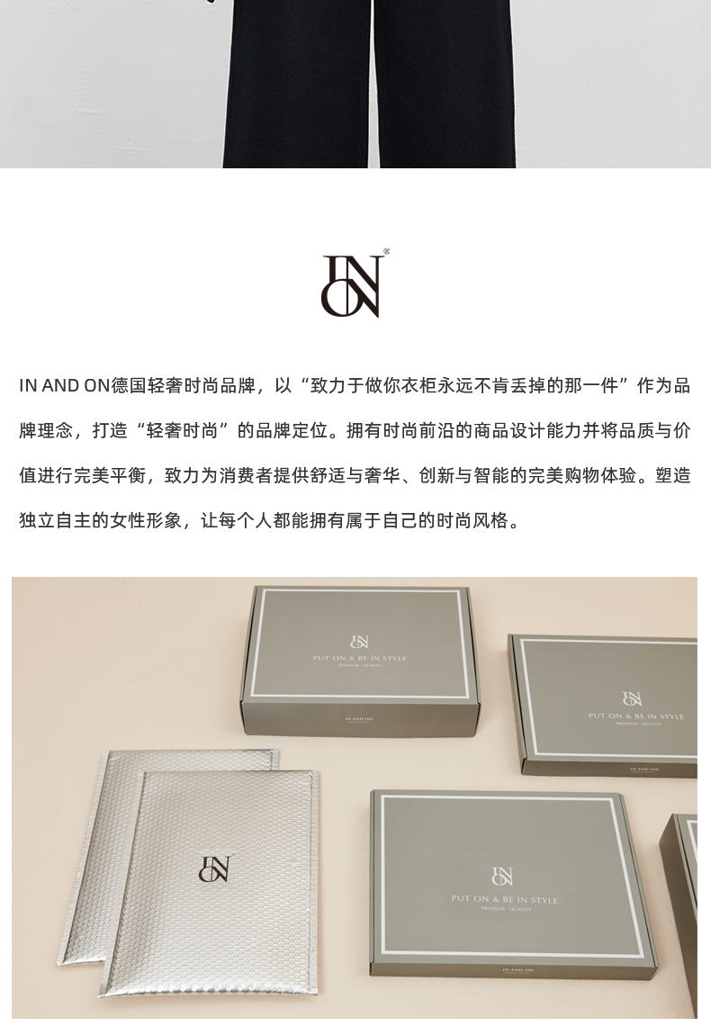 IN AND ON—轻奢时尚品牌,以“致力于做你衣柜永远不肯丢掉的那一件”作为品牌理念,打造“轻奢时尚”的品牌定位。拥有时尚前沿的商品设计能力并将品质与价值进行完美平衡,致力为消费者提供舒适与奢华、创新与智能的完美购物体验。塑造独立自主的女性形象,让每个人都能拥有属于自己的时尚风格。
