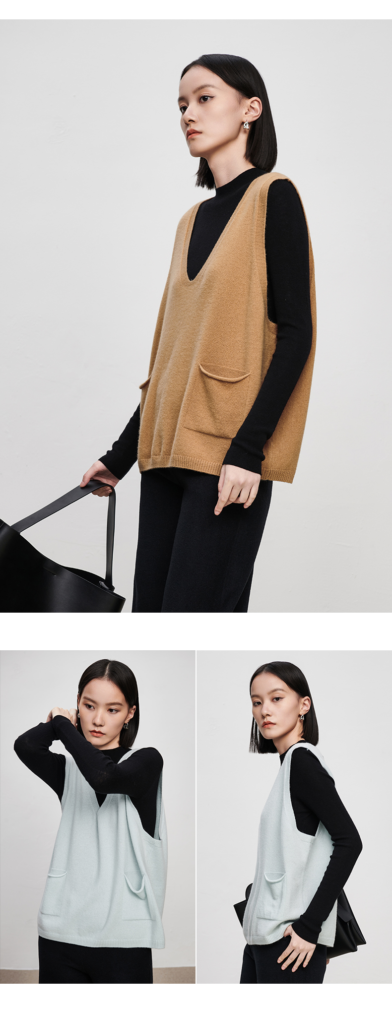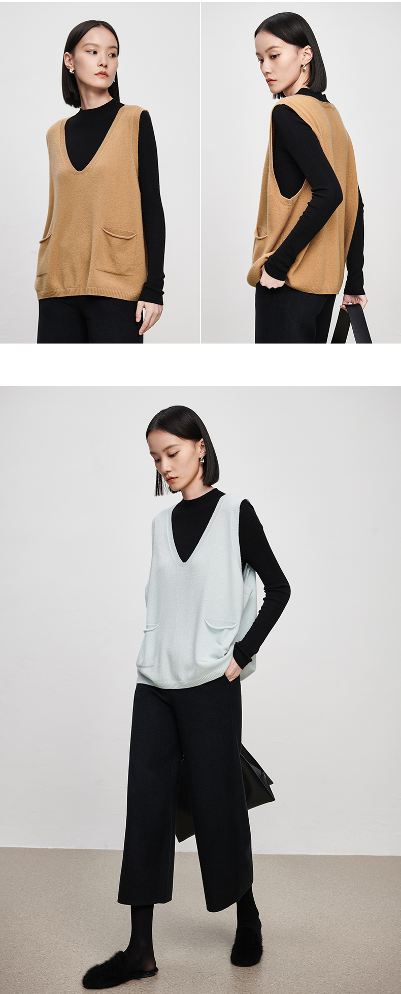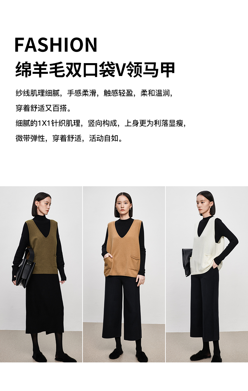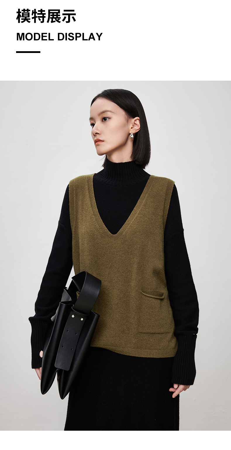 IN AND ON2022秋冬款绵羊毛双口袋V领马甲女新款针织内穿马夹套头外套 商品图6