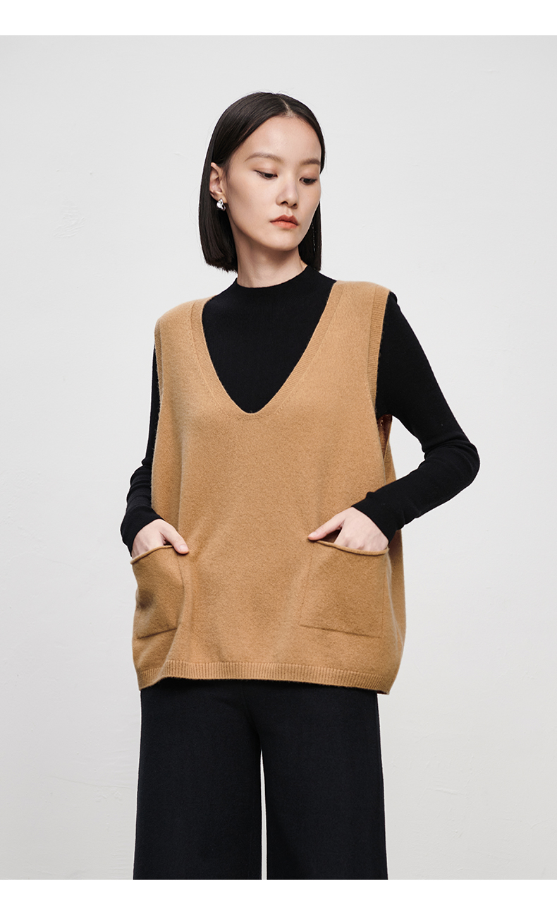 IN AND ON2022秋冬款绵羊毛双口袋V领马甲女新款针织内穿马夹套头外套 商品图5