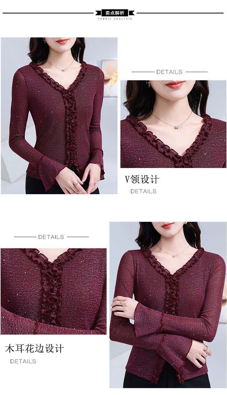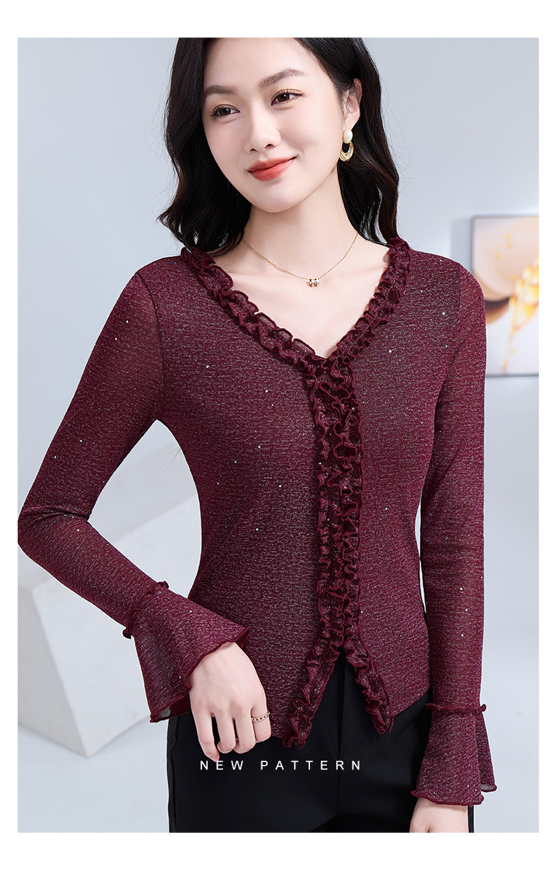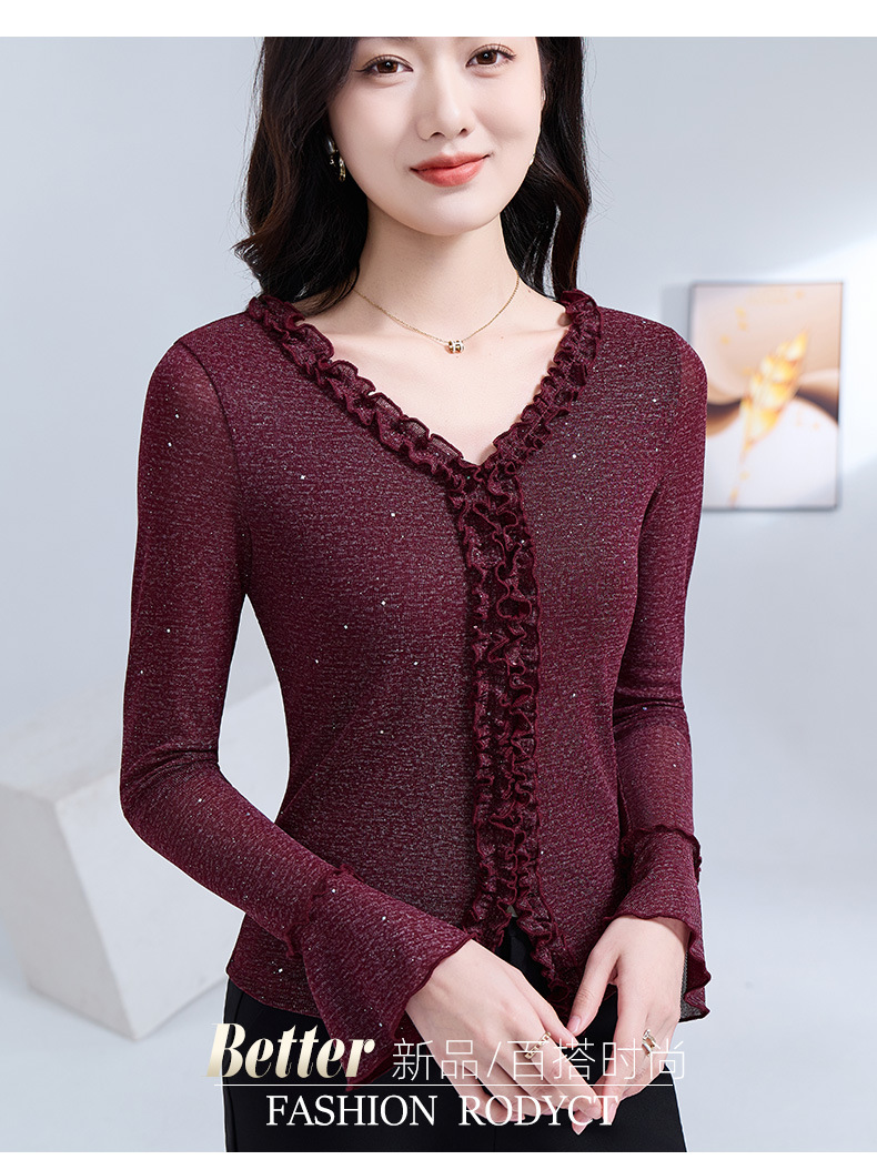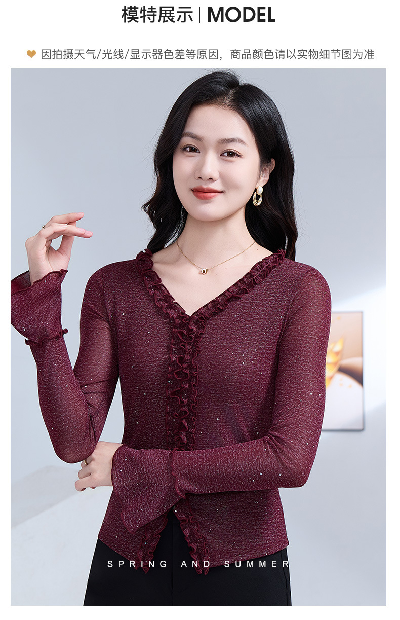 雀说 喇叭袖V领木耳边小衫时尚修身百搭弹力网纱气质上衣LC63166 商品图4