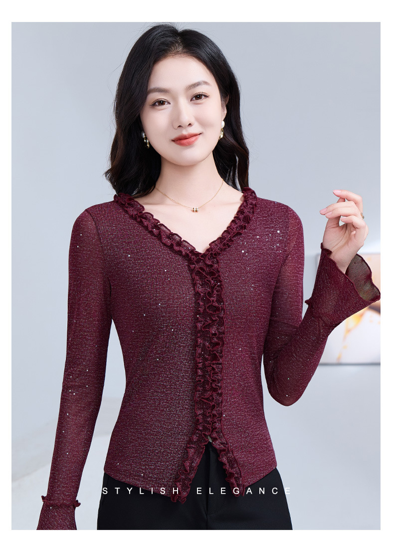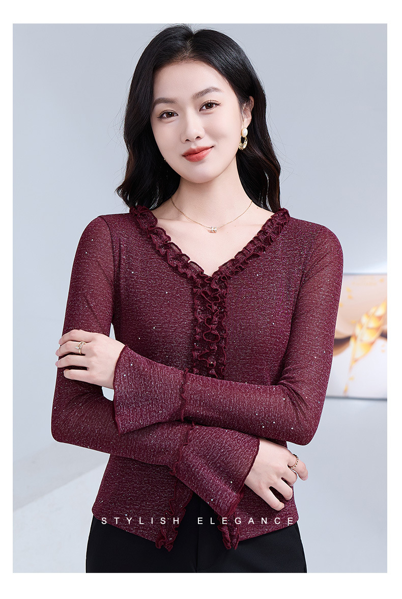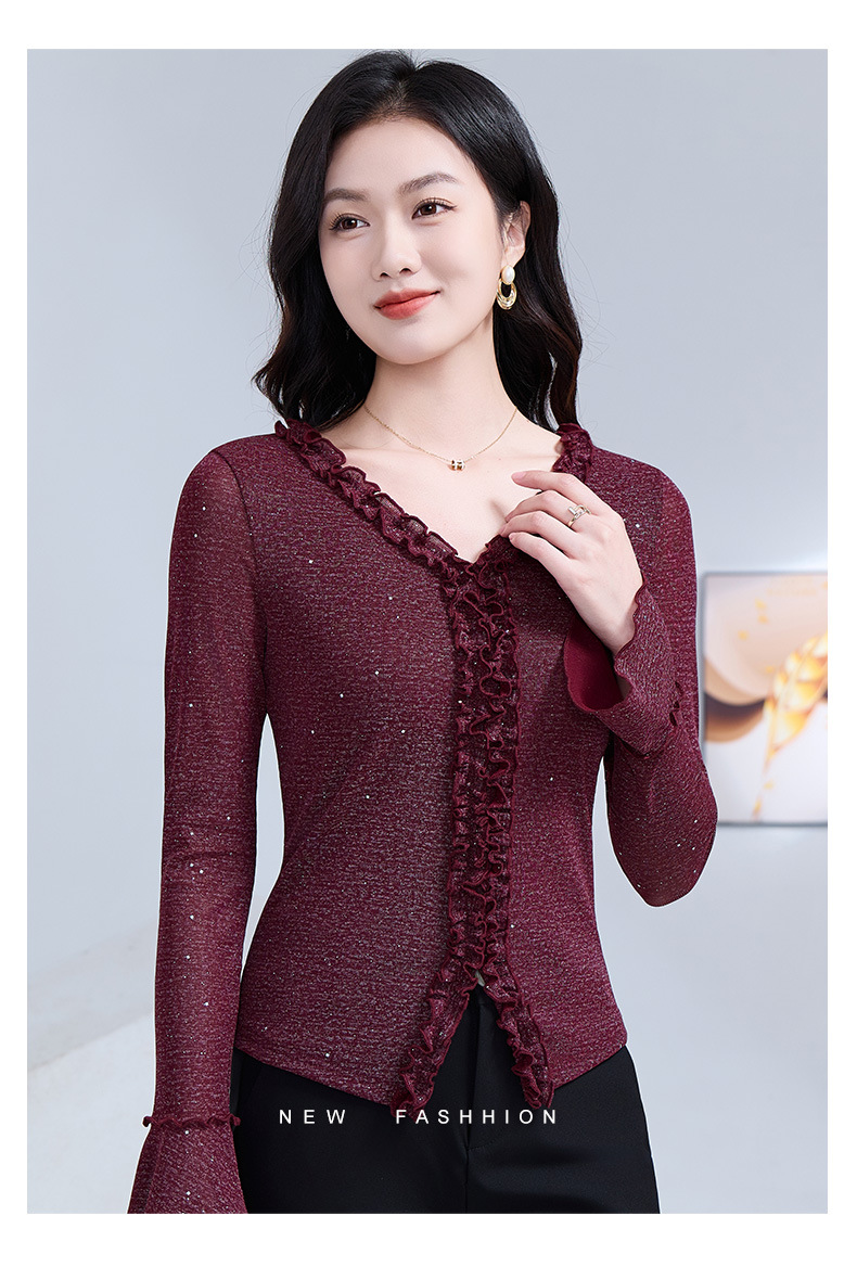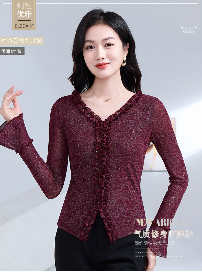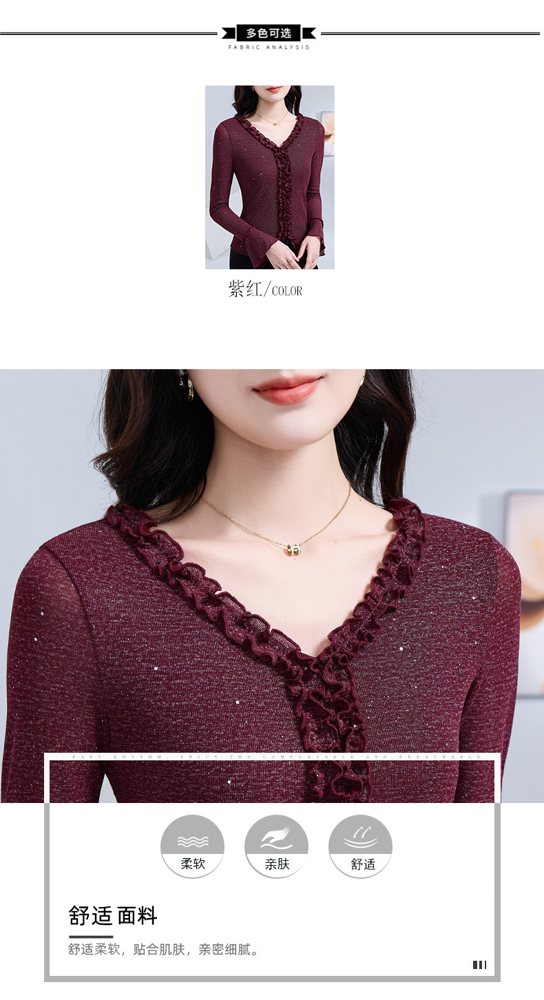 雀说 喇叭袖V领木耳边小衫时尚修身百搭弹力网纱气质上衣LC63166 商品图4