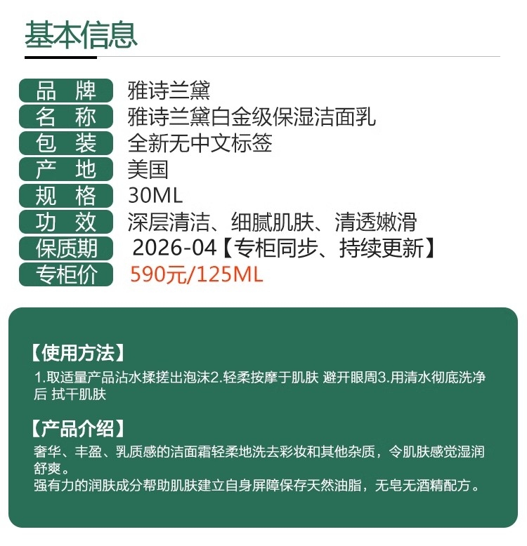 【保税直邮 绍兴海关】雅诗兰黛白金级花菁萃洗面奶30ml