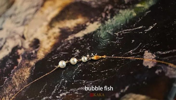 这个版本的泡泡是采用高光泽高圆度的海水珍珠,性价比很好,另外还360度贴肤,不会翻折。吐泡泡的鱼,从冰种翡翠蛋面泡泡到珐琅工艺的鱼,再到如今的珍珠泡泡版本。在设计的道路上,永远有那么多可以开拓创新的点,激发我内在的能量,真是一件太美妙的事。