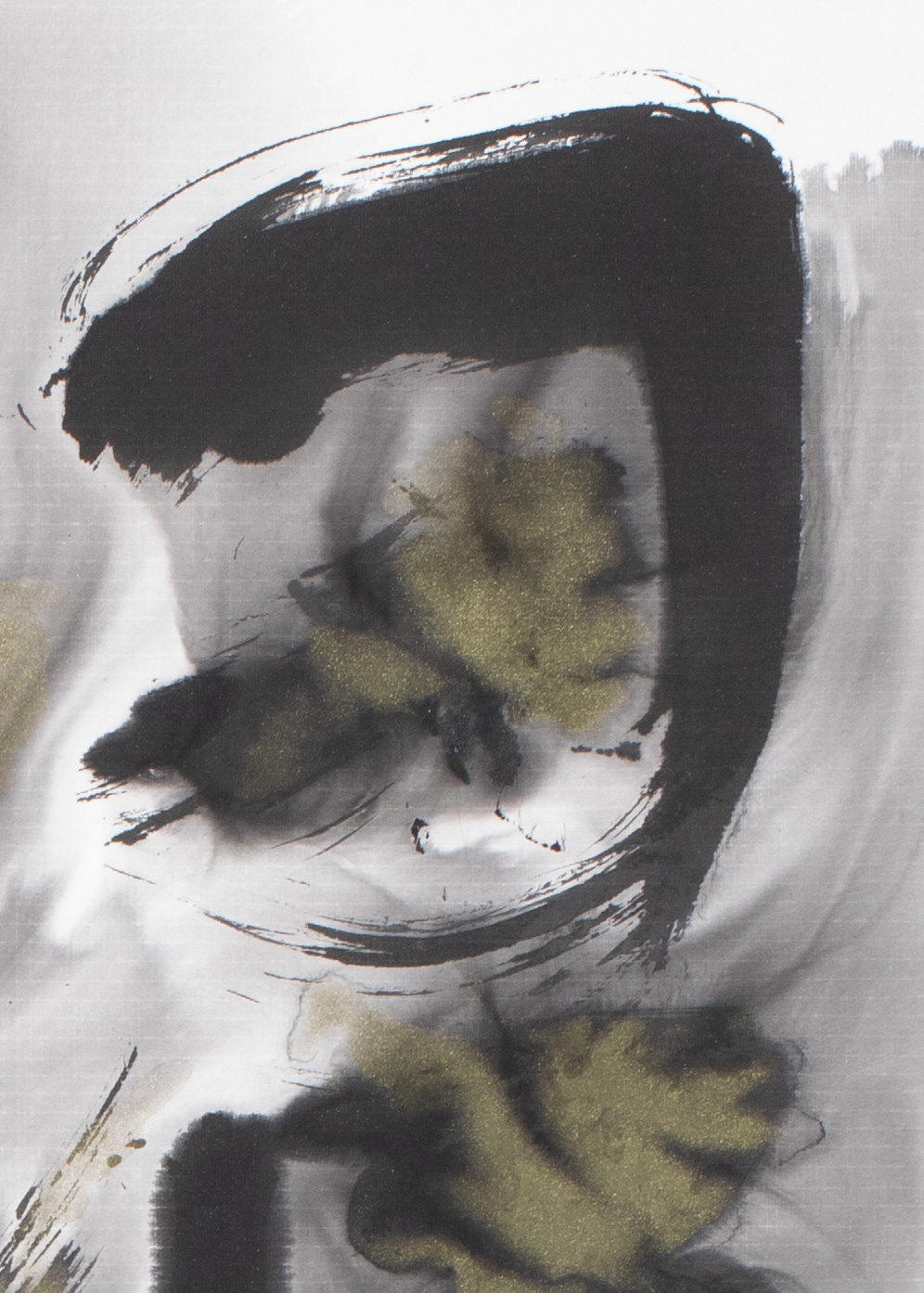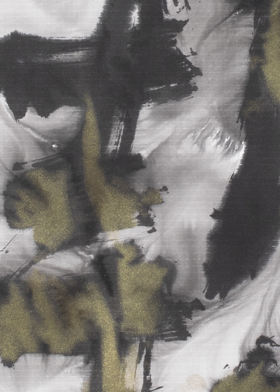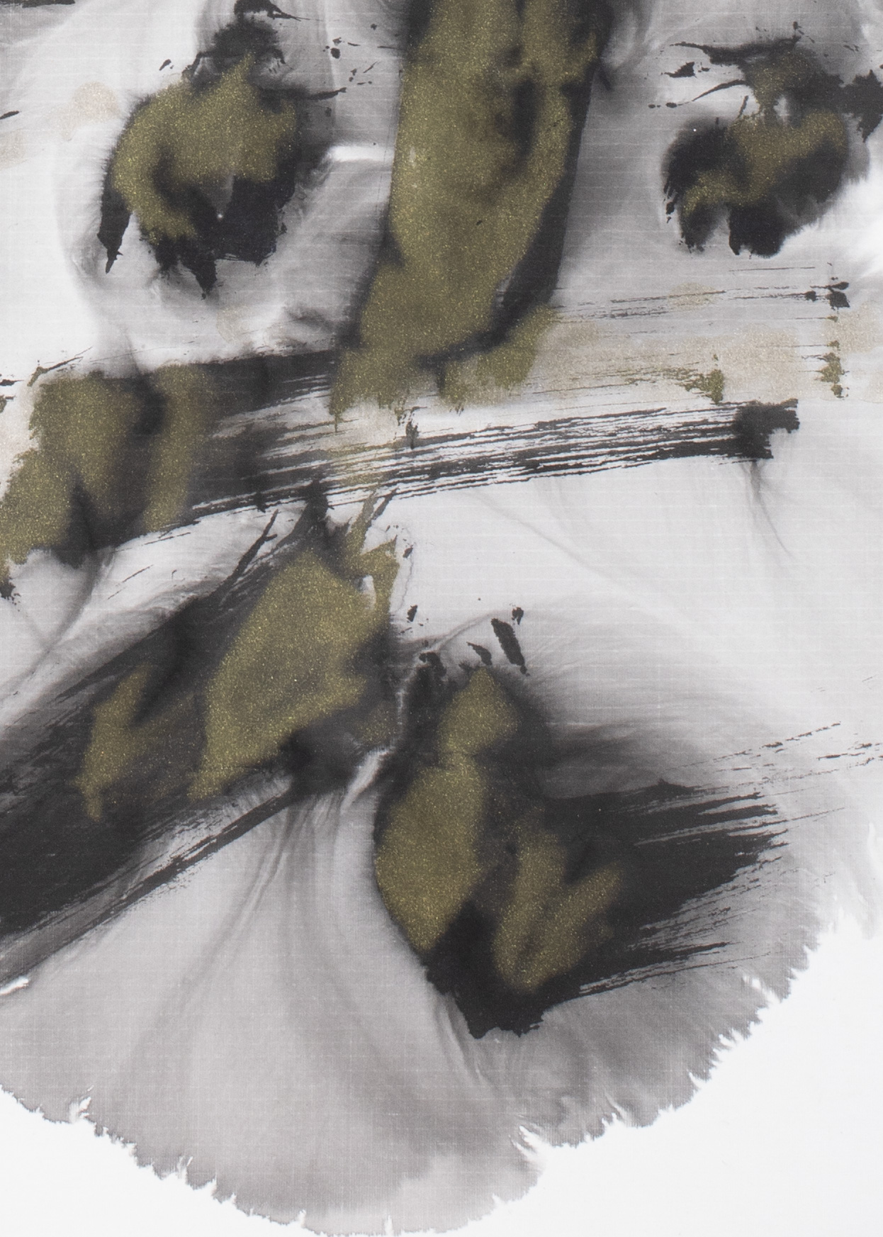 此作品经过多次渲染,水墨酣畅淋漓,再加上金彩覆盖,呈现出洒脱绝尘、熠熠之光 的视觉效果,仿佛流金岁月般的气象超然。