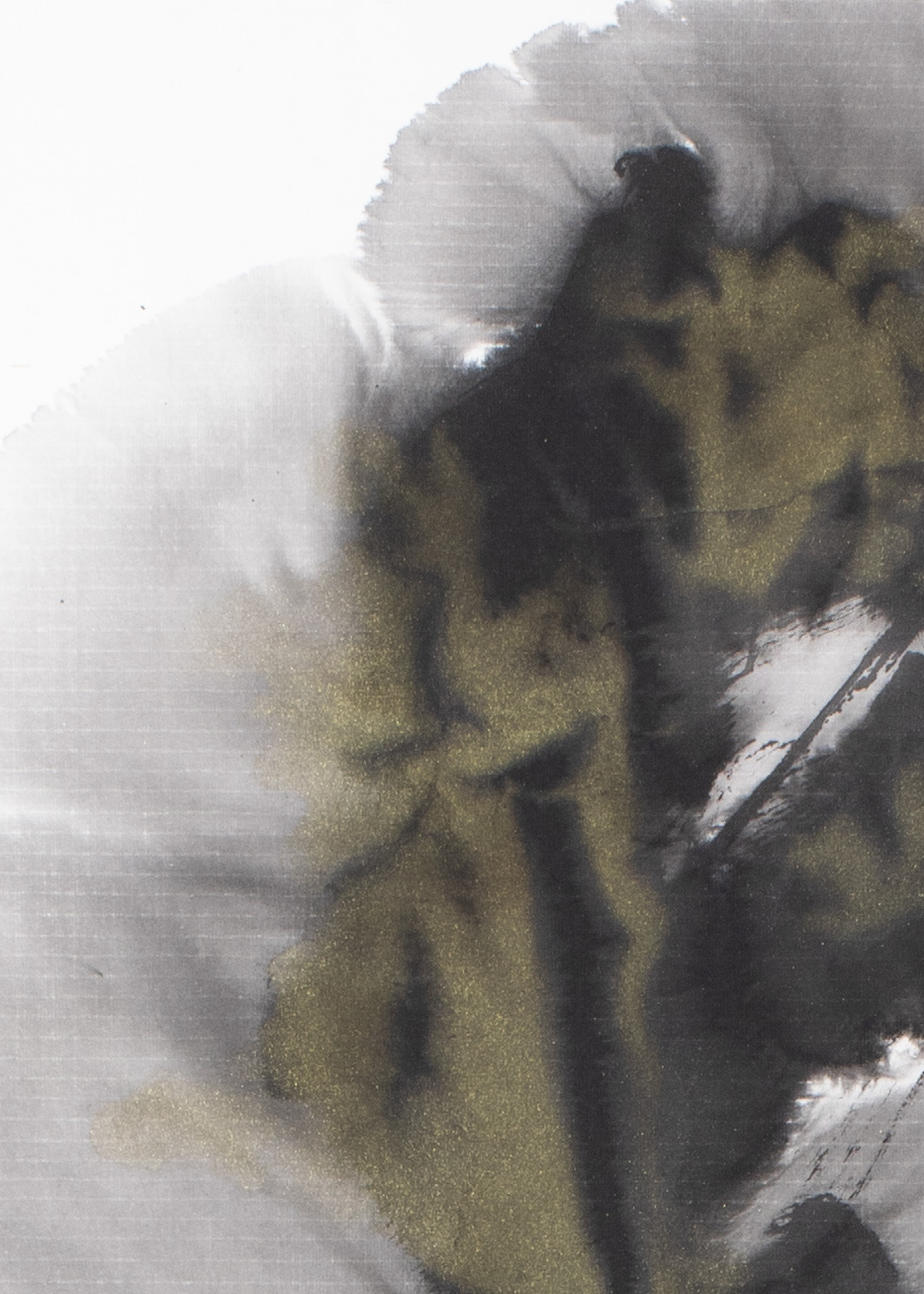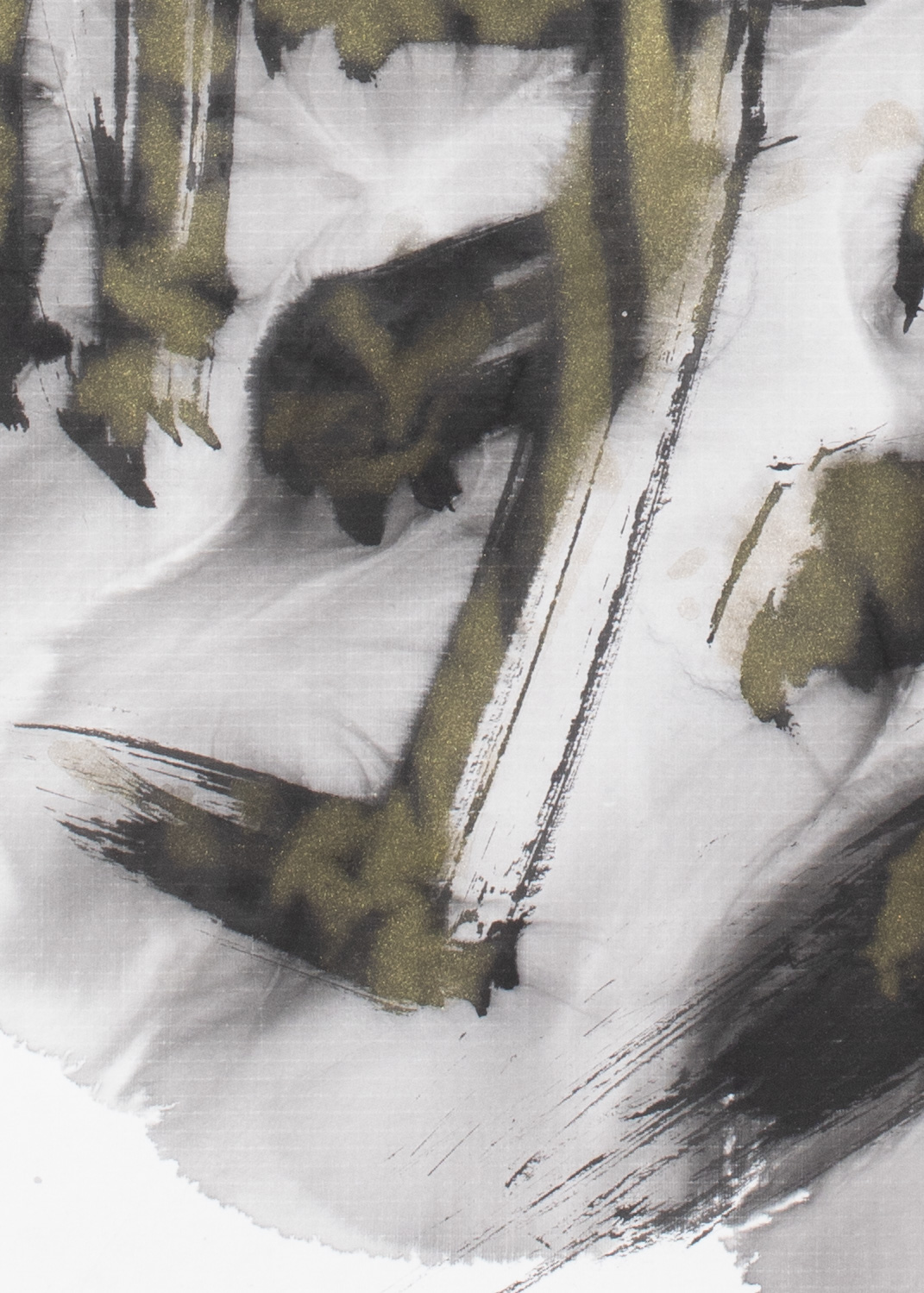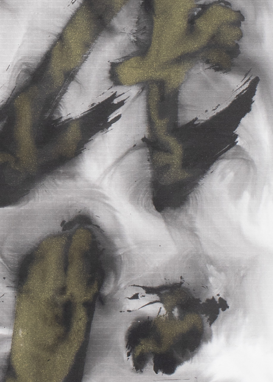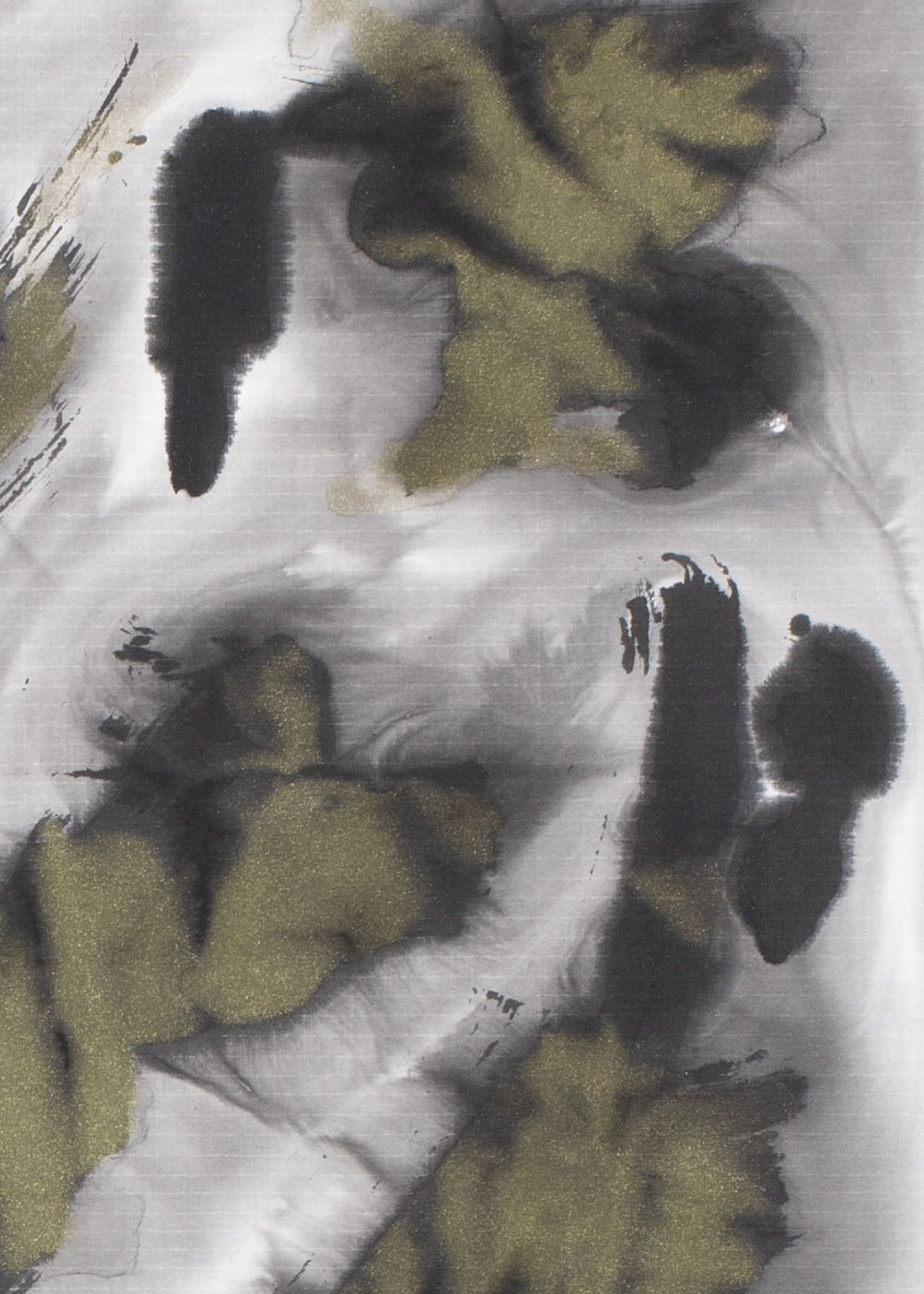 此作品经过多次渲染,水墨酣畅淋漓,再加上金彩覆盖,呈现出洒脱绝尘、熠熠之光 的视觉效果,仿佛流金岁月般的气象超然。