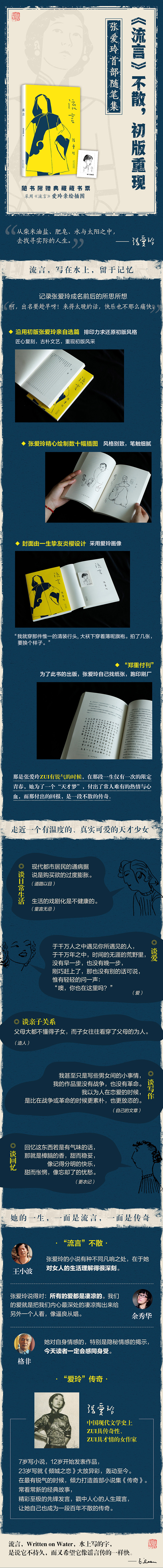 《流言》为张爱玲首部散文集,1944年12月由作者自印,炎樱设计封面,张爱玲绘制插画。本书沿用《流言》初版本封面,内容一仍其旧,文字参校以《传奇增订本》及各篇初刊文,对明显错字酌予订正,为提到的书籍和文章加了书名号,作者特殊的用字习惯、方言用法,以及人、地、物之旧时译名,则未作改动。