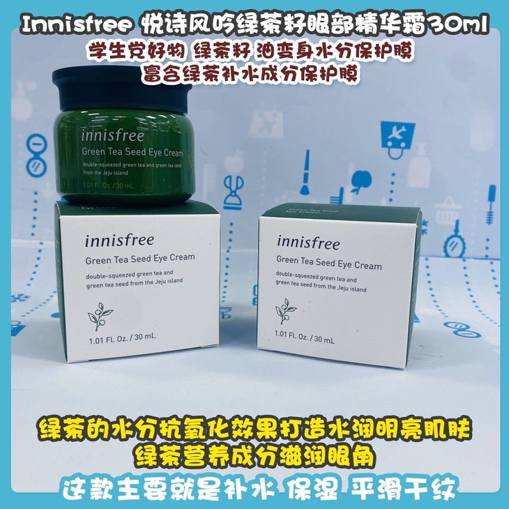 Innisfree 悦诗风吟绿茶籽眼部精华霜30ml👍学生党好物!绿茶籽🌱油变身水分保护膜富含绿茶补水成分保护膜💧,使肌肤保持水润💦,并且拥有优秀贴合力,保护干燥眼部肌肤👀,绿茶的水分抗氧化效果打造水润明亮肌肤🌟。绿茶营养成分滋润眼角,呵护眼部肌肤,这款主要就是补水!保湿!平滑干纹!很适合初用眼霜妹子的入门级的眼霜哈🙋~